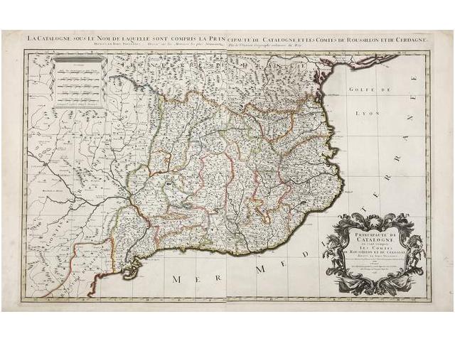 1696., MAPA: JAILLOT:, PRINCIPAUTE DE CATALOGNE OU SONT COMPRIS LES COMTES DE ROUSSILLON ET DE CERDAGNE DIVISES EN LEURS VIGUERIES., Paris: ches H. Iaillot, 1696. Mapa grabado al cobre, límites coloreados. 56 x 87 cm. Bello ejemplar en buen estado de conservación.