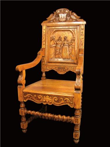 1696 Oak Arm Chair with ornate carved back. Excellent refinished condition. 24 X 51 inches.