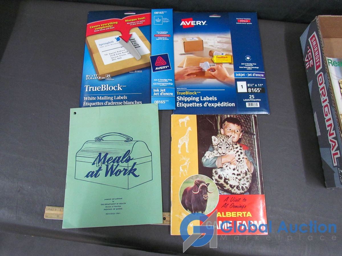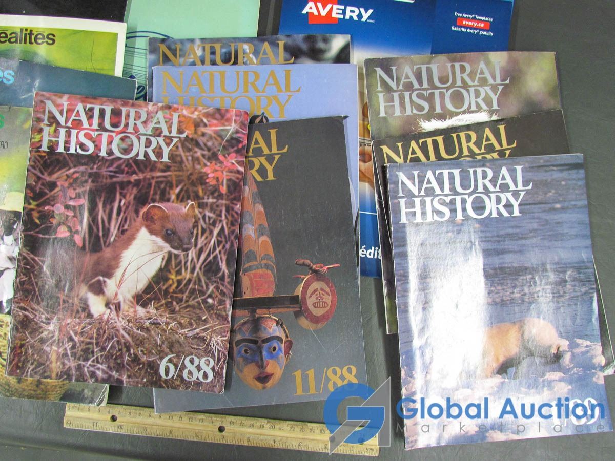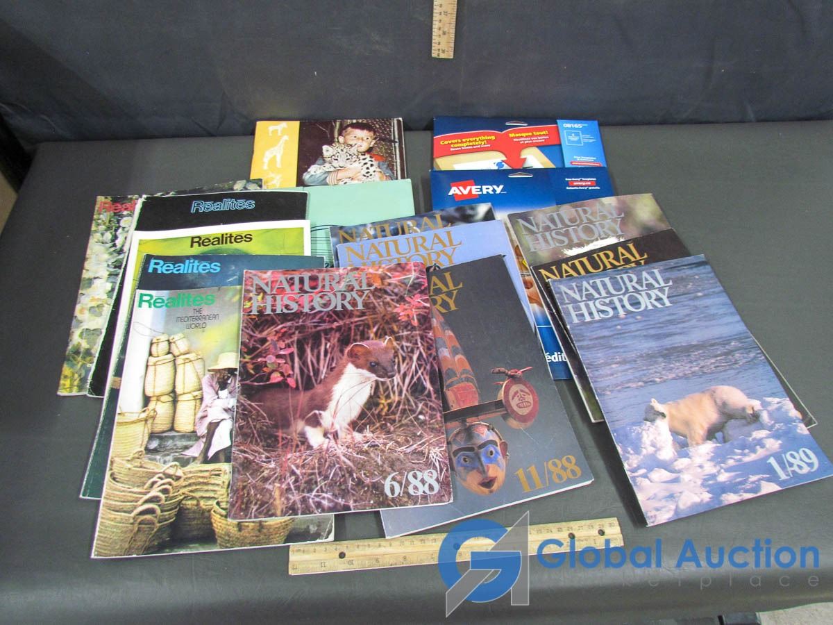 Assortment Of 70s/80s Magazines: Shipping & Mailing Labels, Natural History Magazines, Meals At Work Book, Alberta Game Farm Book, Realities Magazines, & Etc.