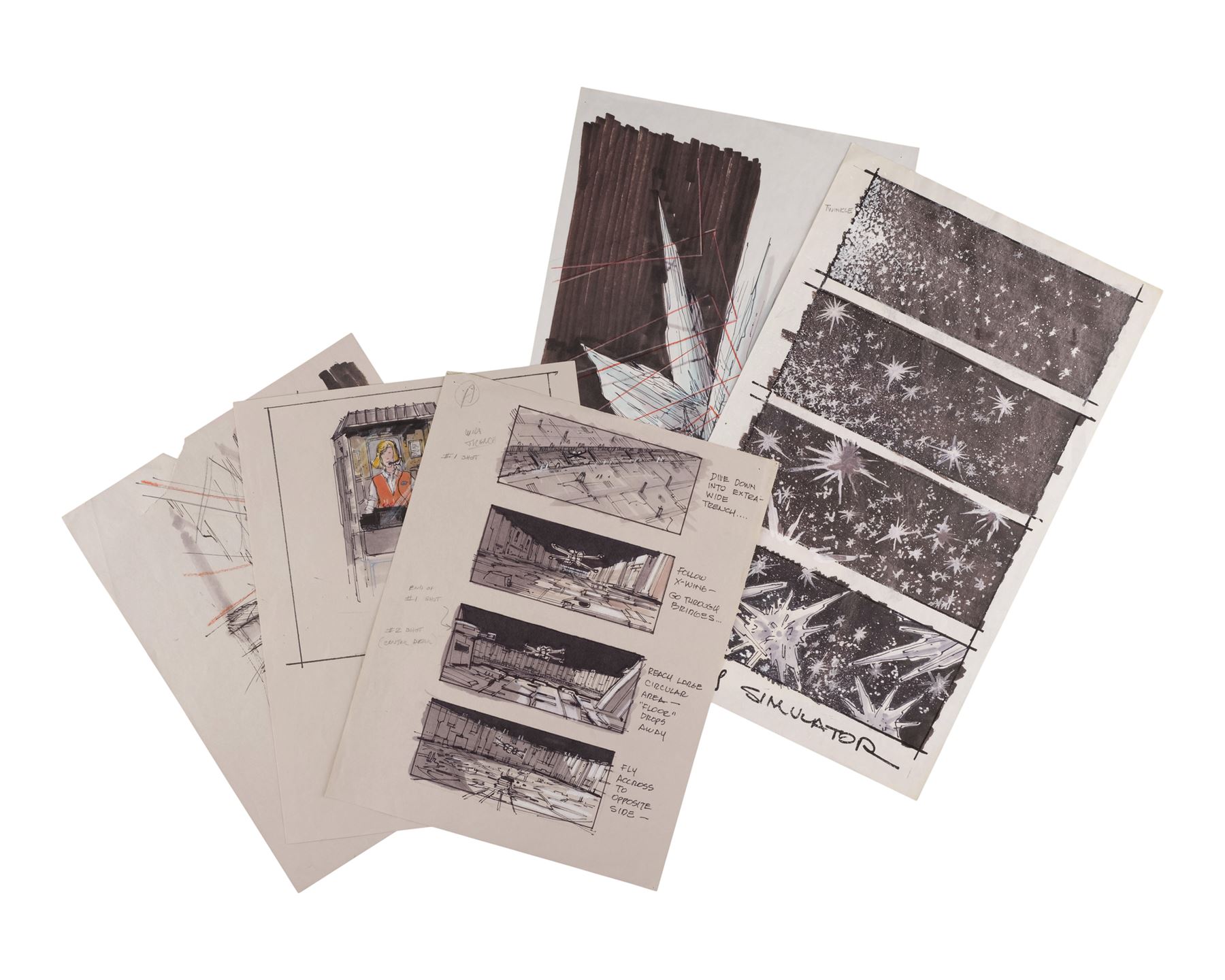 This lot consists of nine pages of concept illustrations and six pages of hand-rendered storyboards with annotations in the margins. Composed of mixed media, these illustrations and storyboards showcase both technical aspects of the ride design, and the visual elements of what would be on screen as the ride commenced. These are stored in a manila folder hand-marked "Star Tours Concepts/S.Boards/Prod Design Etc. . ." This lot exhibits some creasing, pinholes, discoloration, and strips of adhesive. Dimensions: (each) 11" x 17" (28 cm x 43 cm)