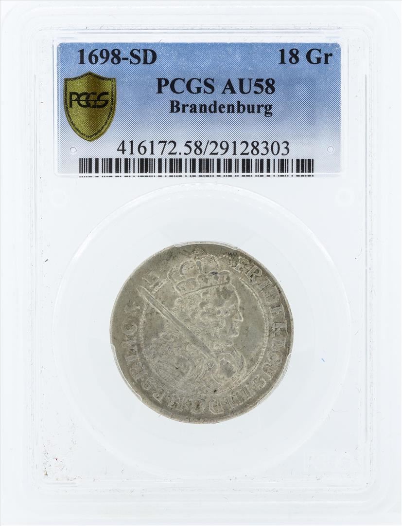 One 1698-SD Brandenburg 18 Groscher Coin PCGS AU58. PCGS Graded.