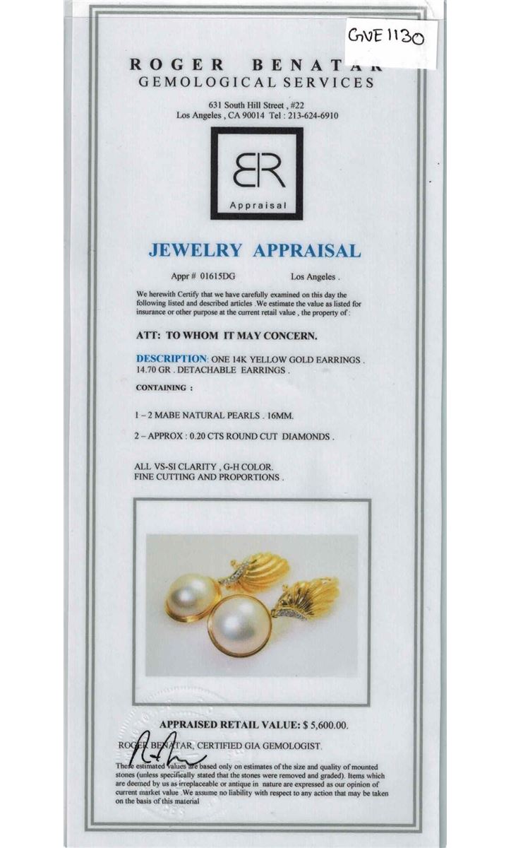 14K YELLOW GOLD NATURAL PEARL EARING:14.70 GRAMS/DIAMOND:0.20CT ABOUT/PEARL:16MM/#GVE1130