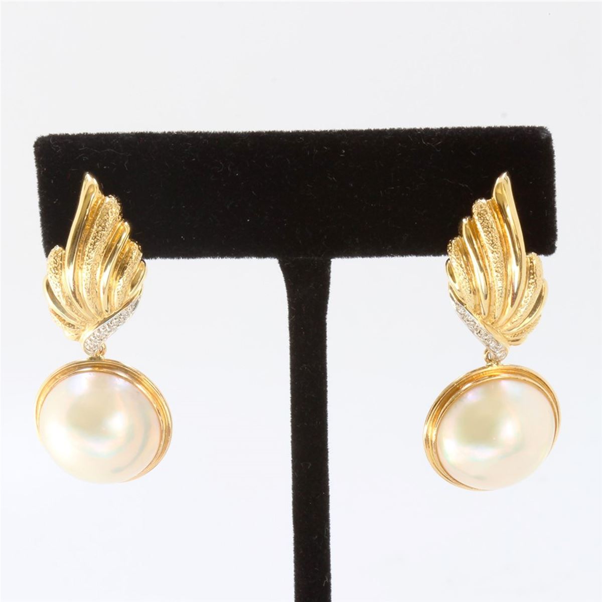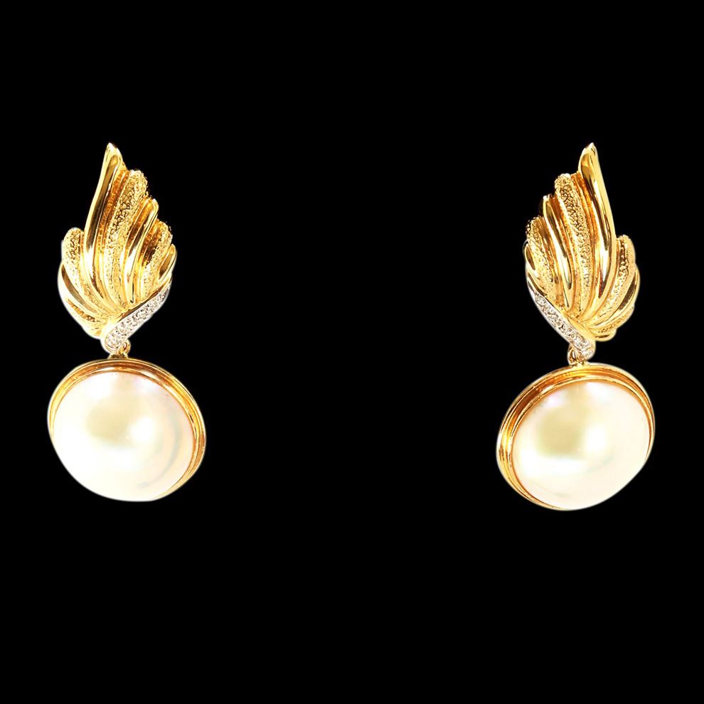 14K YELLOW GOLD NATURAL PEARL EARING:14.70 GRAMS/DIAMOND:0.20CT ABOUT/PEARL:16MM/#GVE1130