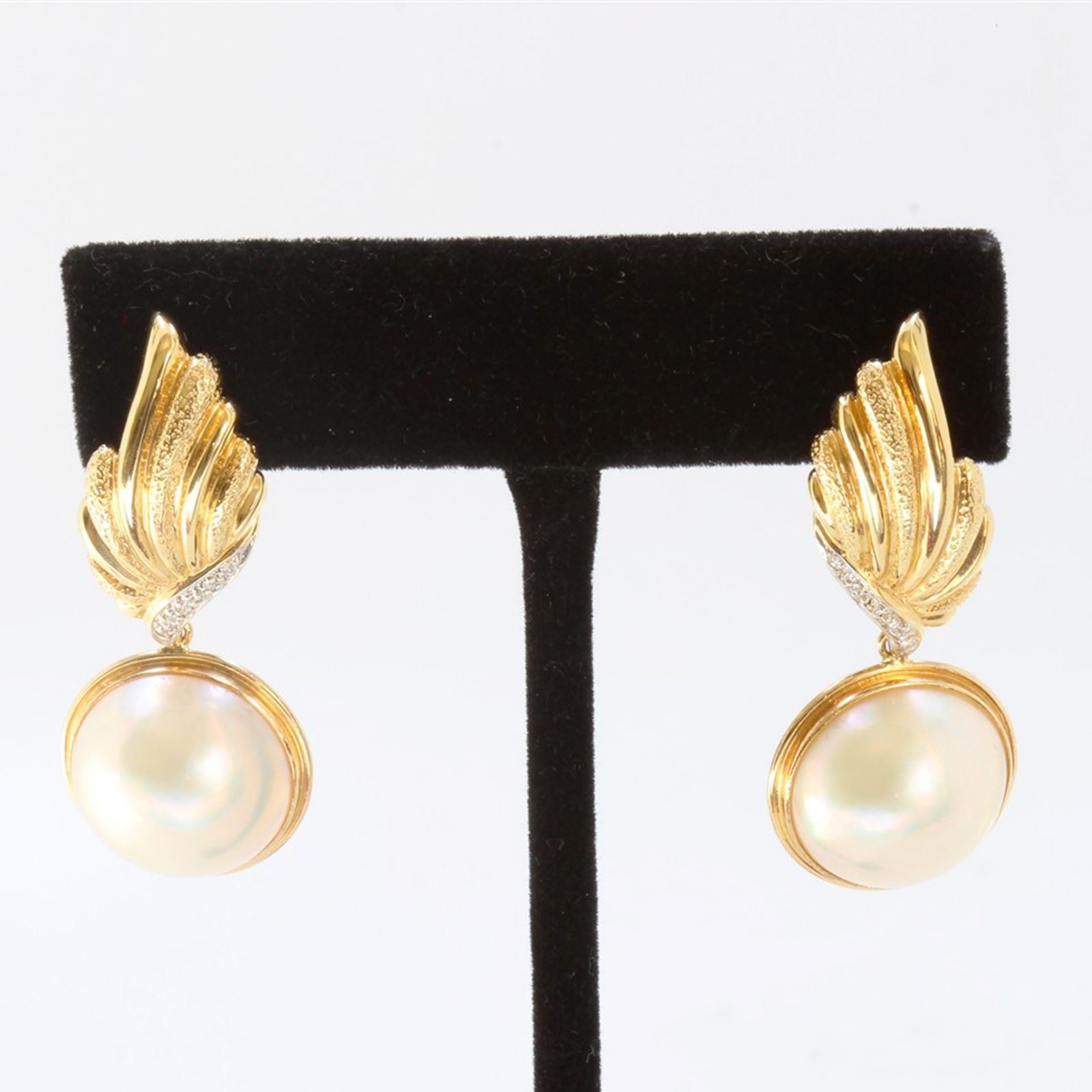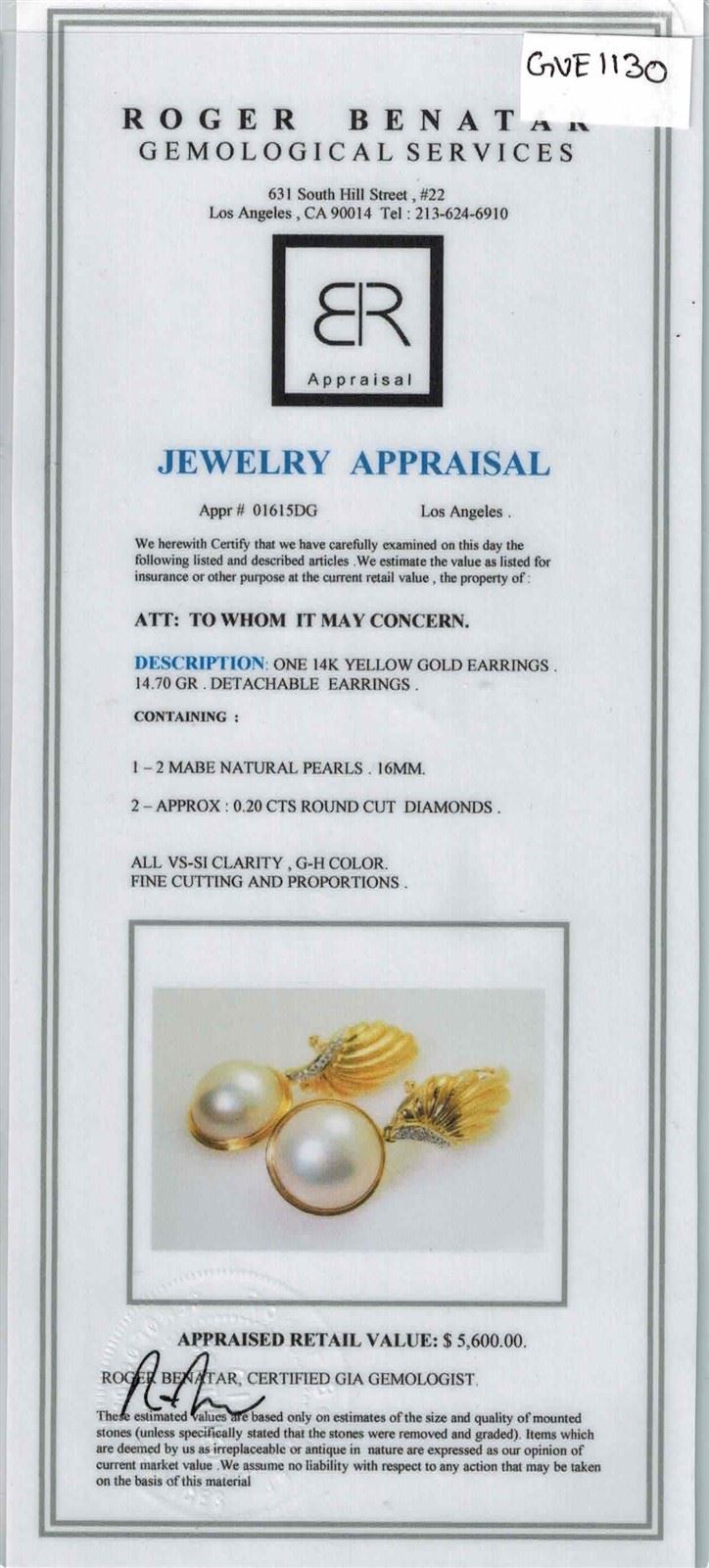 14K YELLOW GOLD NATURAL PEARL EARING:14.70 GRAMS/DIAMOND:0.20CT ABOUT/PEARL:16MM/#GVE1130 **Believed to attract wealth and luck, these 16mm Mabe Natural Pearls draw the eye with their lustrous beauty. Gracefully crafted in warm 14k yellow gold, these luminous rarities are brightened by glittering rows of 0.20ct Round Cut Diamonds and a golden shell motif, invoking images of timeless elegance.**