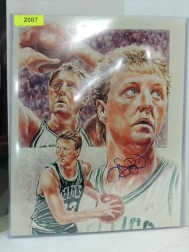 16X20 ILLUSTRATION BASKETBAL AUTOGRAPH LARRY BIRD. INLCUDES COA FROM PRIMETIME COLLECTIONS. AS SHOWN. VIEW PICTURE FOR DETAIL.