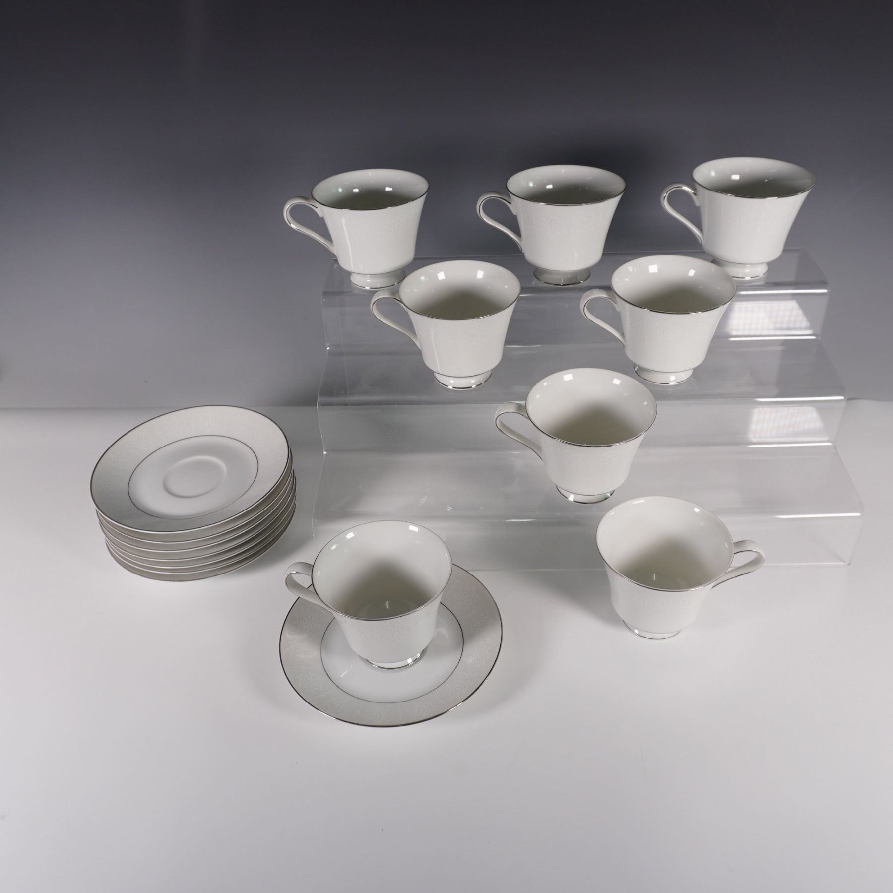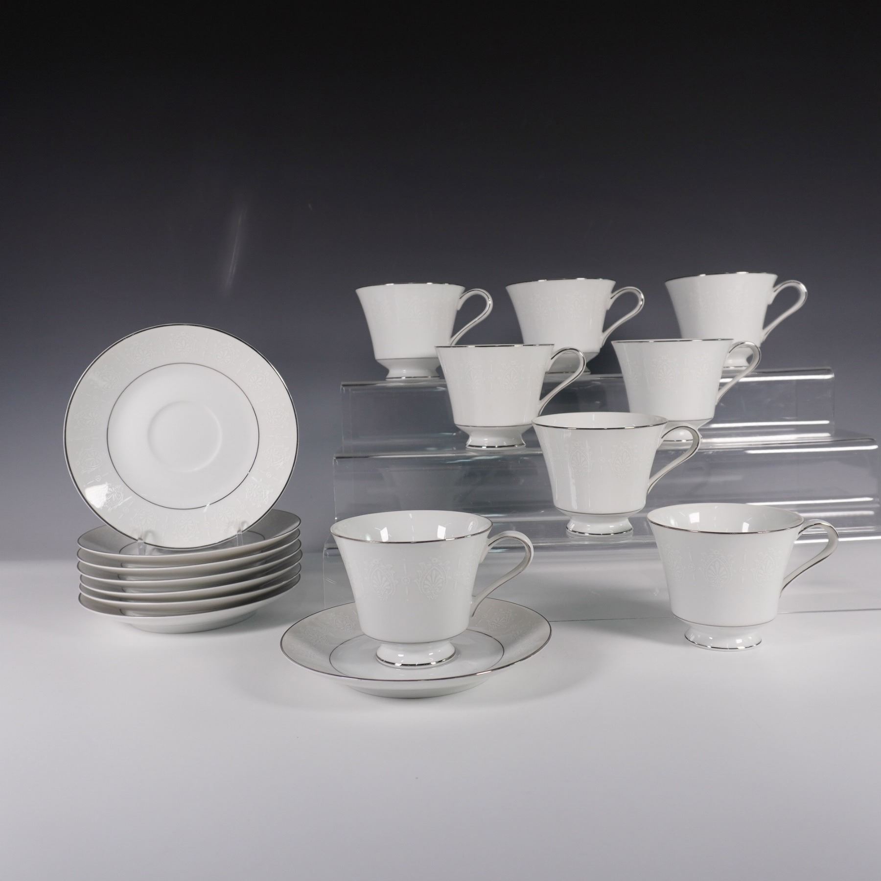 Crown Empire fine china tableware set in the Princess pattern, featuring white floral and fleur-de-lis decorations with metallic-silver trim. This collection includes eight coffee cups and eight saucers. The pattern showcases an embossed decorative border, complementing the overall design. Crown Empire backstamp. Coffee cup: 4.5"L x 3.5"W x 3"H. Saucer: 1"H x 6" dia.