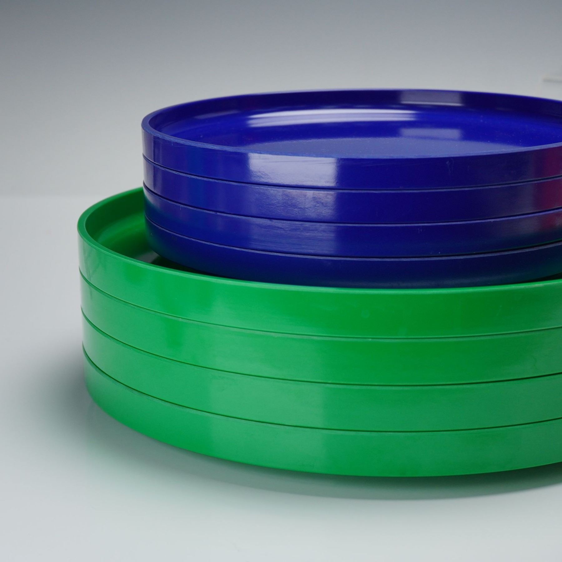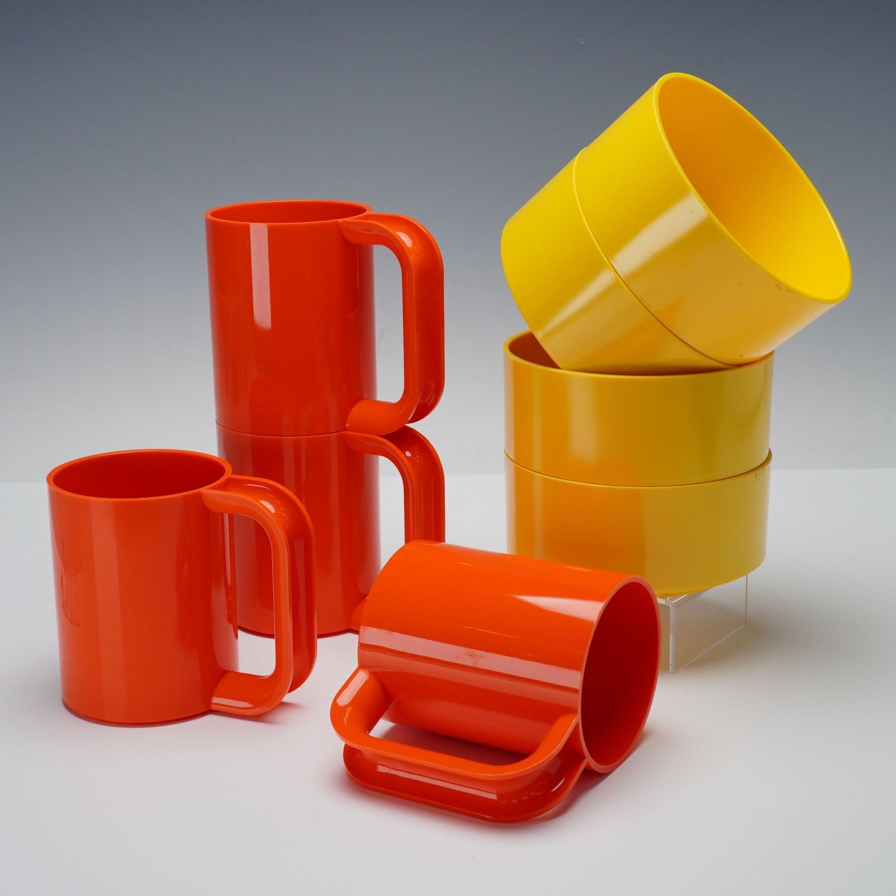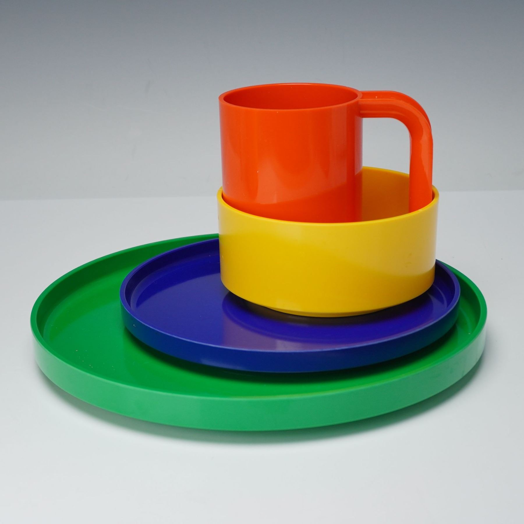 A sixteen-piece collection of colorful plastic dinnerware. This service for four includes stackable plates, bowls, and mugs in vivid hues of green, blue, yellow, and orange. Each piece features clean, cylindrical forms characteristic of Vignelli's minimalist design ethos, emphasizing both functionality and visual harmony. The Heller logo is embossed on select pieces, with the designer's name molded on the base of the mugs.