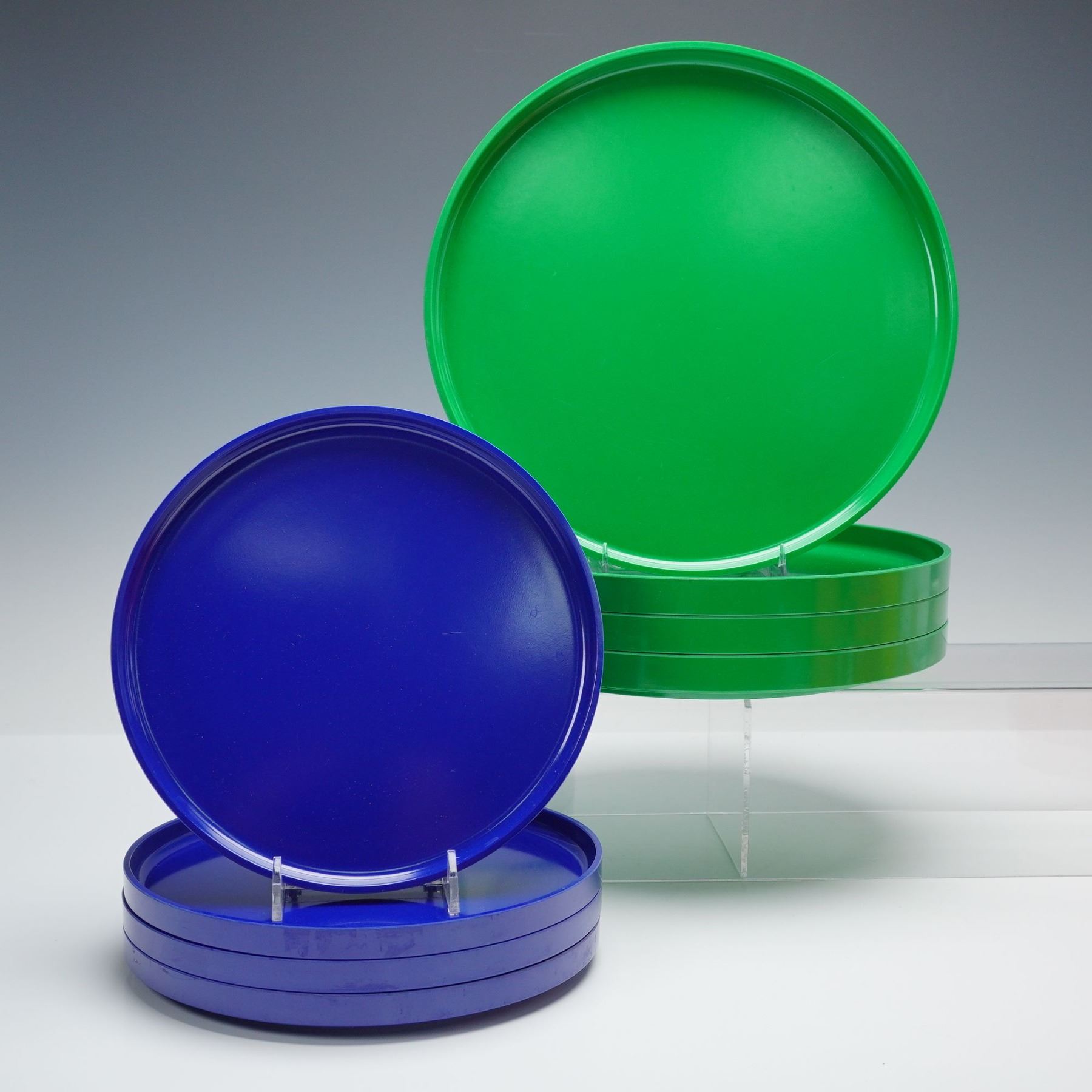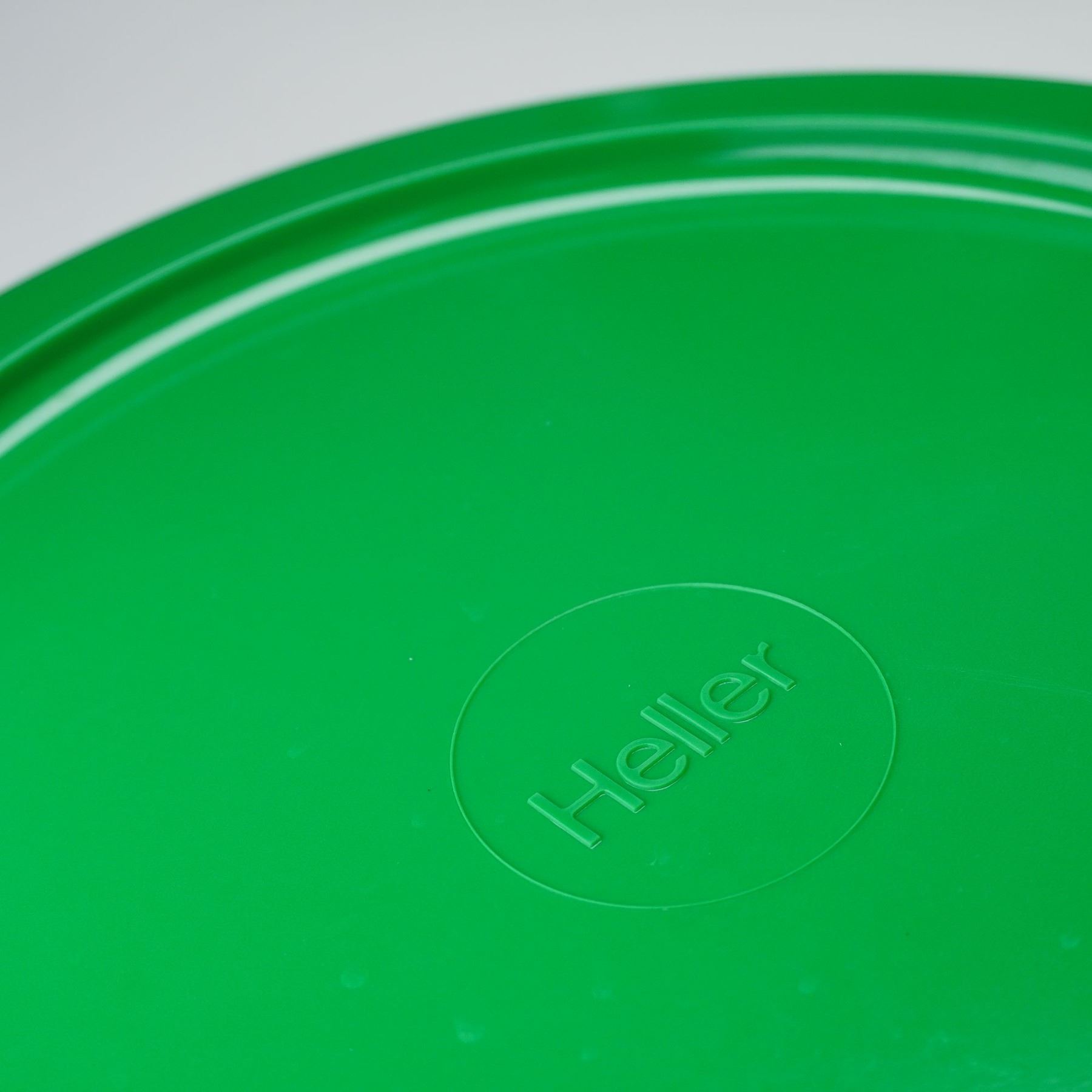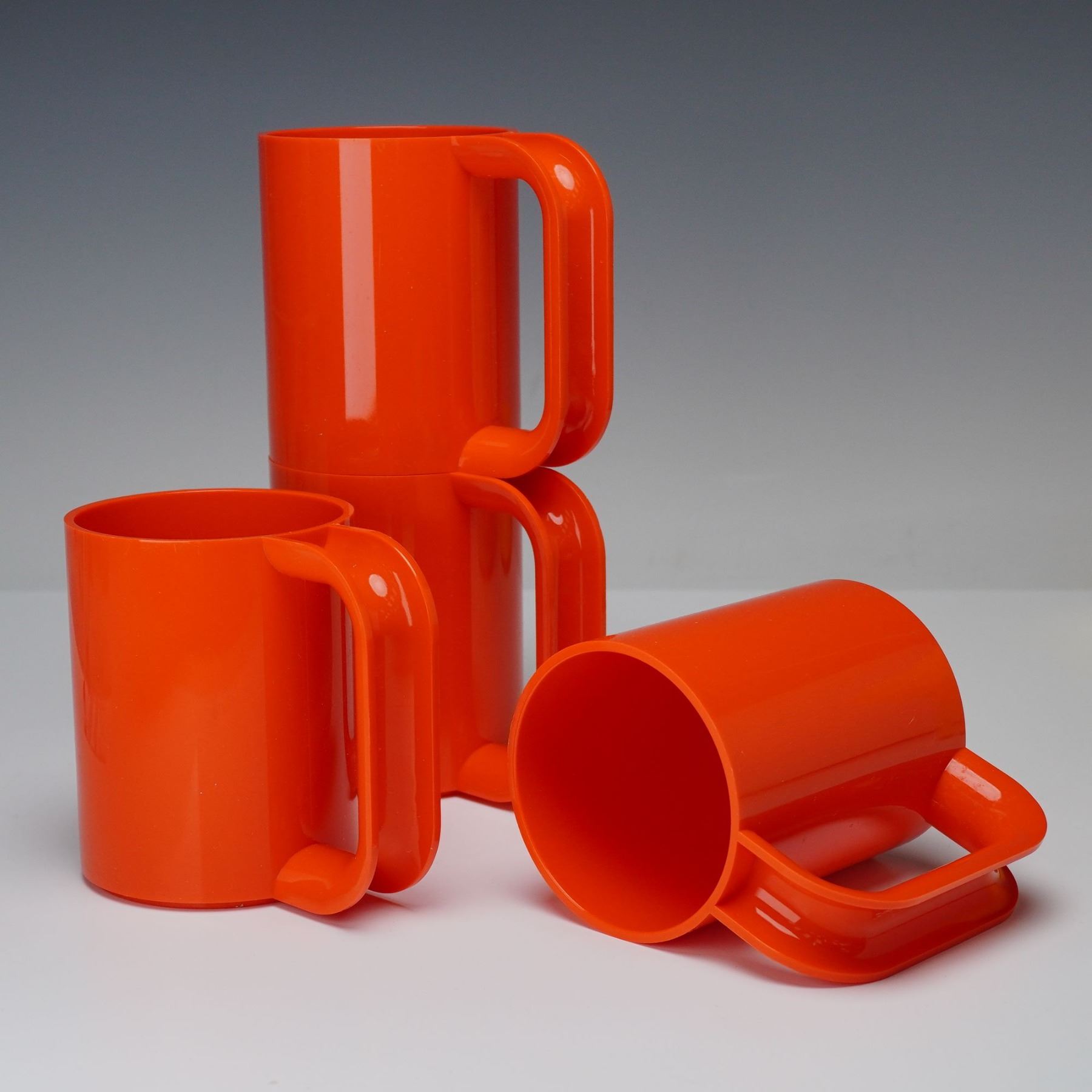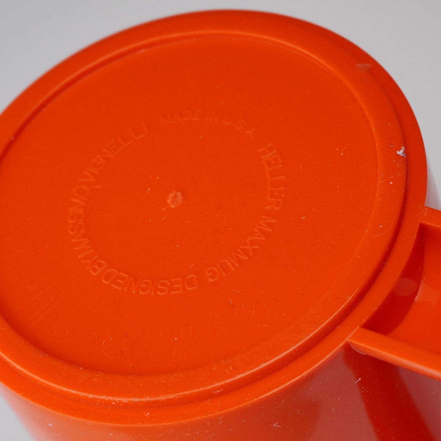 A sixteen-piece collection of colorful plastic dinnerware. This service for four includes stackable plates, bowls, and mugs in vivid hues of green, blue, yellow, and orange. Each piece features clean, cylindrical forms characteristic of Vignelli's minimalist design ethos, emphasizing both functionality and visual harmony. The Heller logo is embossed on select pieces, with the designer's name molded on the base of the mugs.