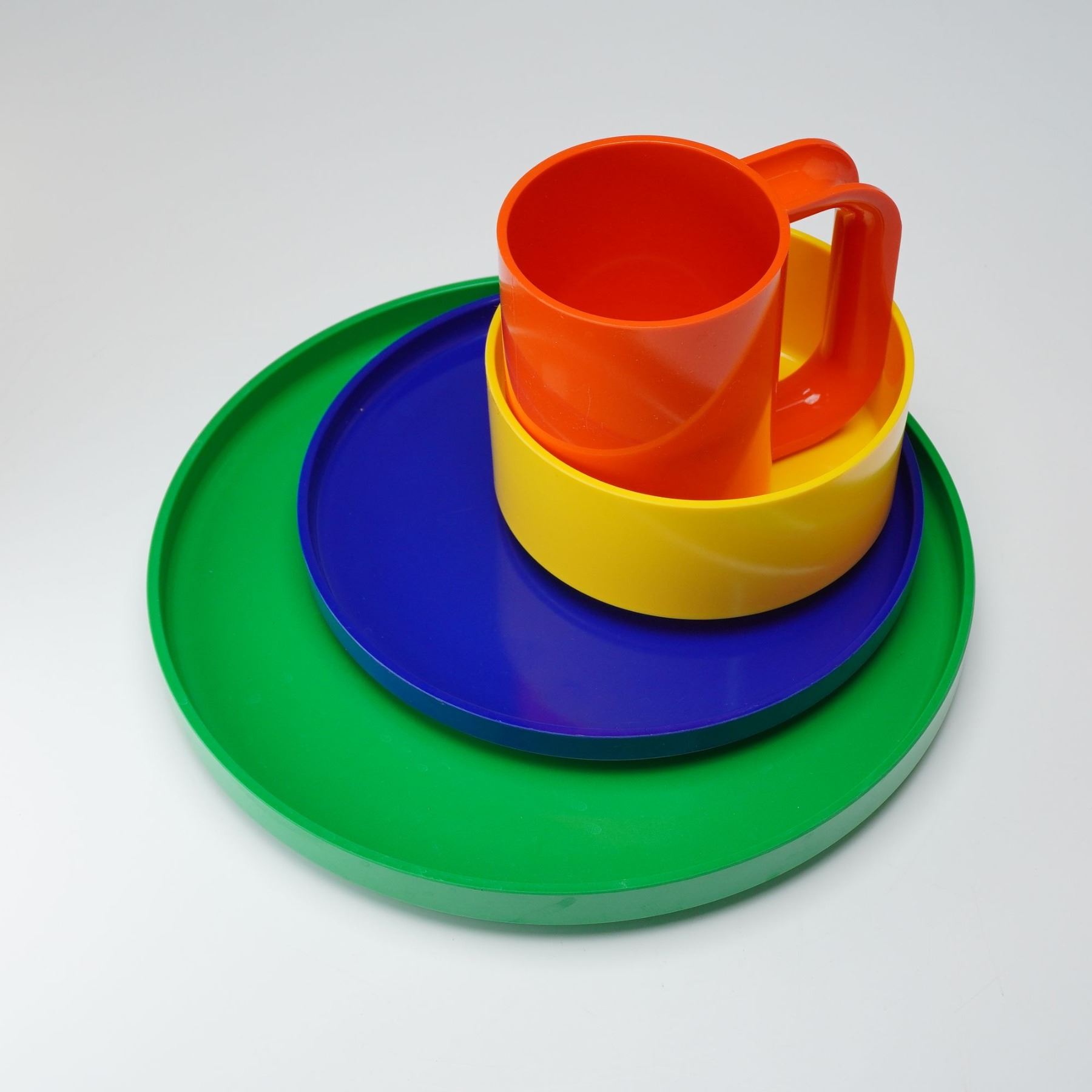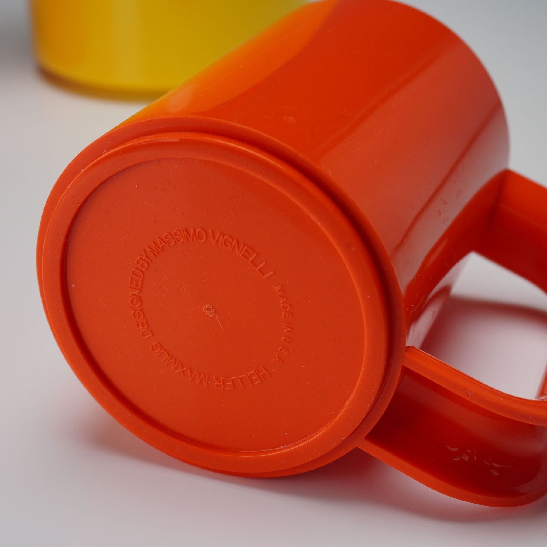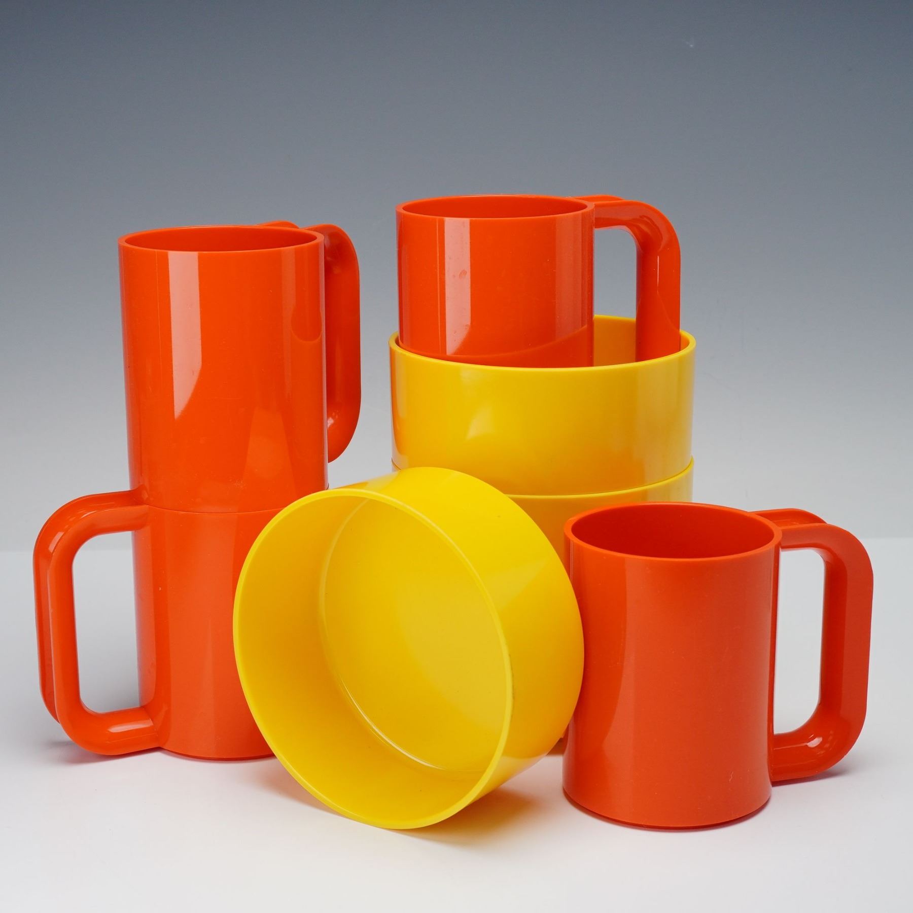 This set features a striking collection of modern plastic tableware in vivid primary colors. The set includes four yellow bowls, four orange mugs, four blue salad plates, and four green dinner plates. Each piece showcases Vignelli's iconic minimalist design with smooth lines, bold tones, and a stackable form that emphasizes both function and style. Heller backstamp.
