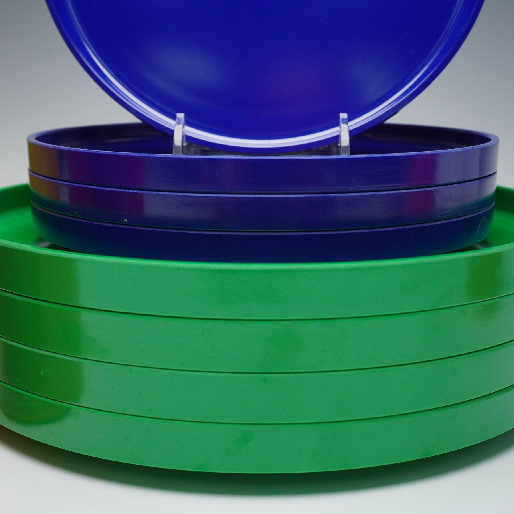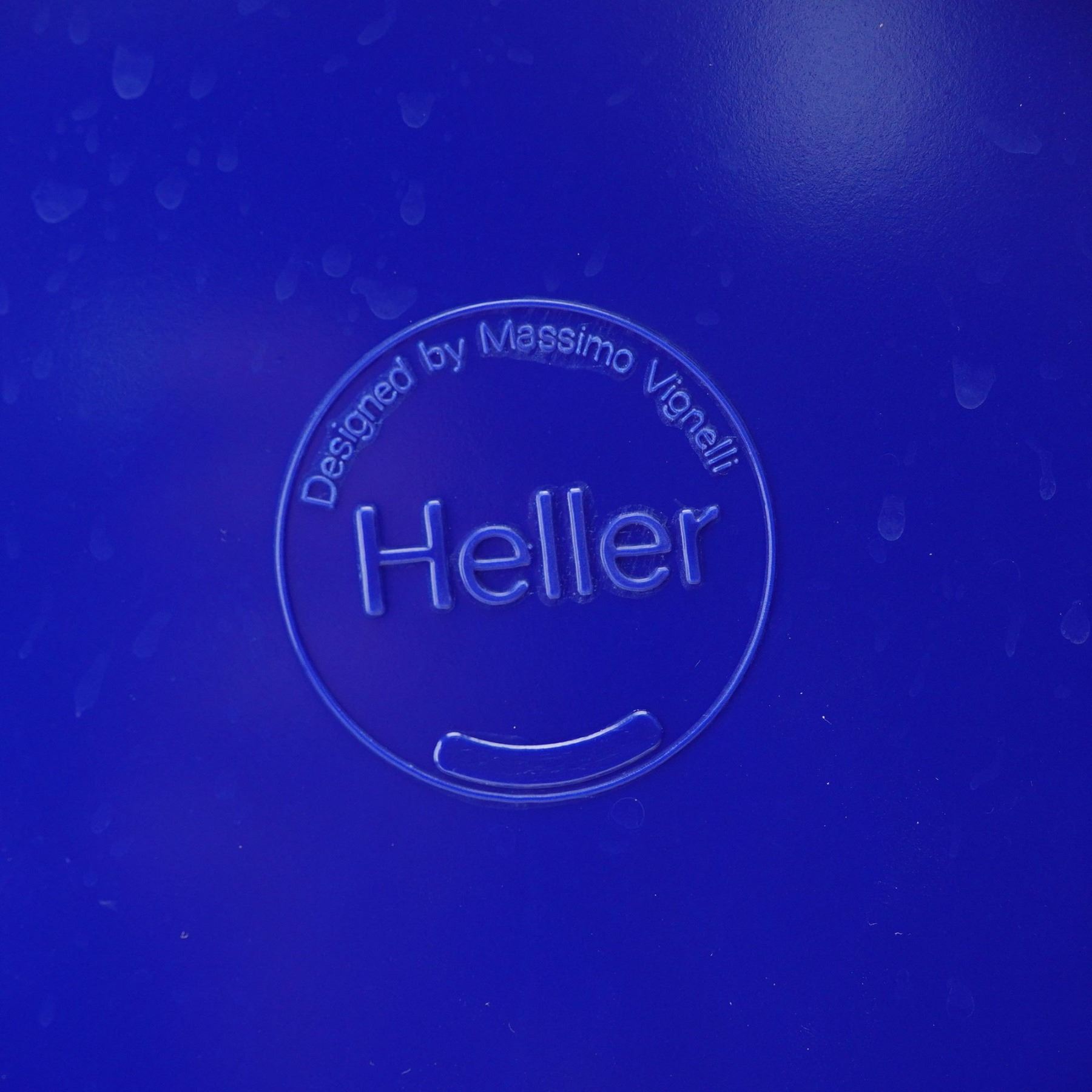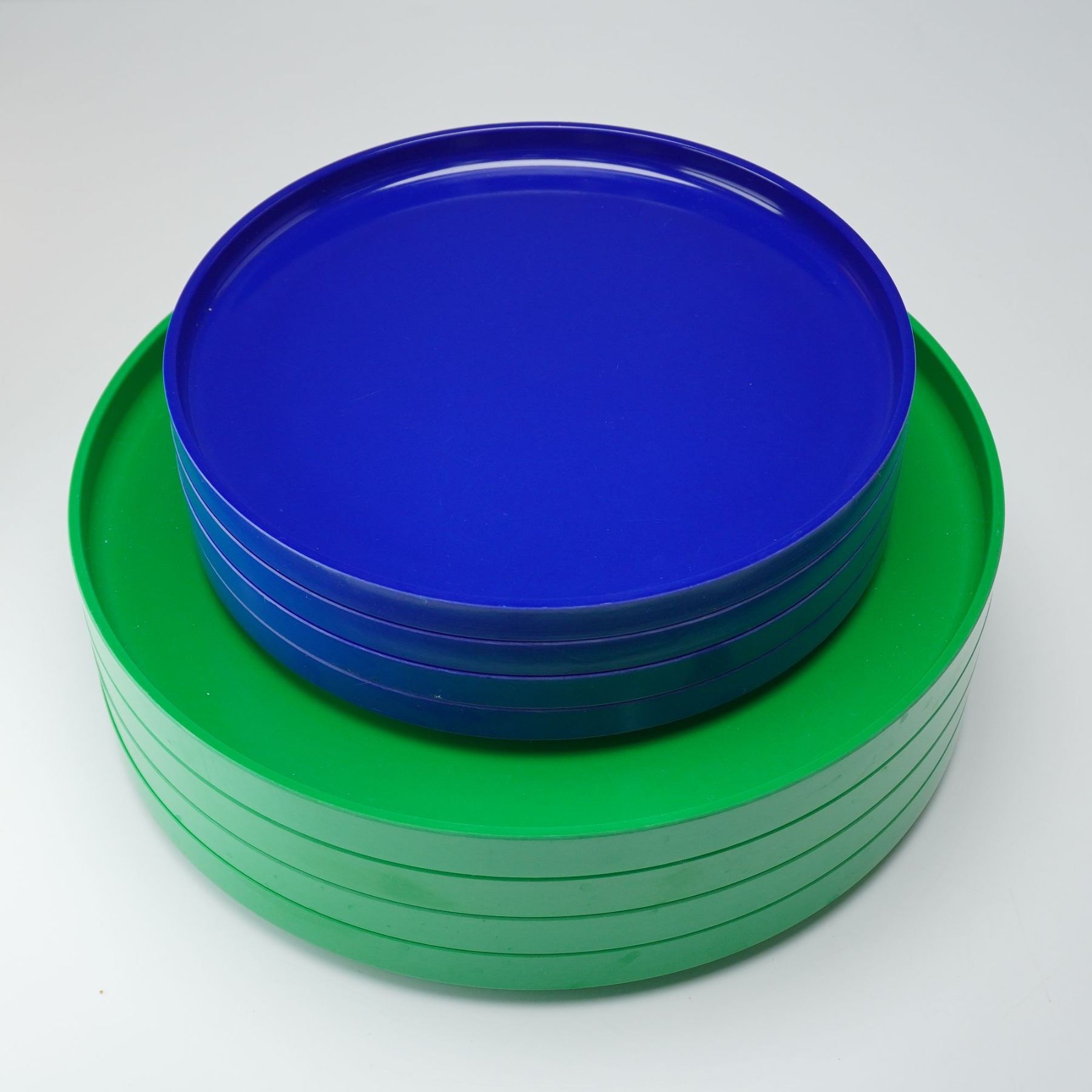 This set features a striking collection of modern plastic tableware in vivid primary colors. The set includes four yellow bowls, four orange mugs, four blue salad plates, and four green dinner plates. Each piece showcases Vignelli's iconic minimalist design with smooth lines, bold tones, and a stackable form that emphasizes both function and style. Heller backstamp.