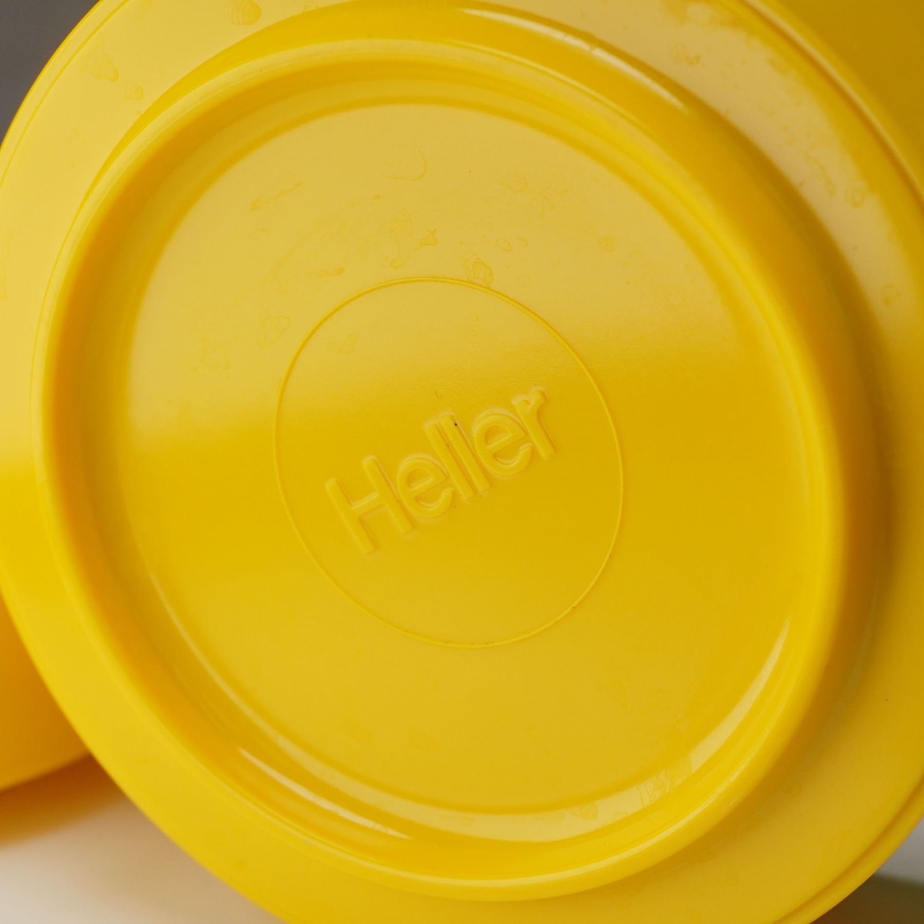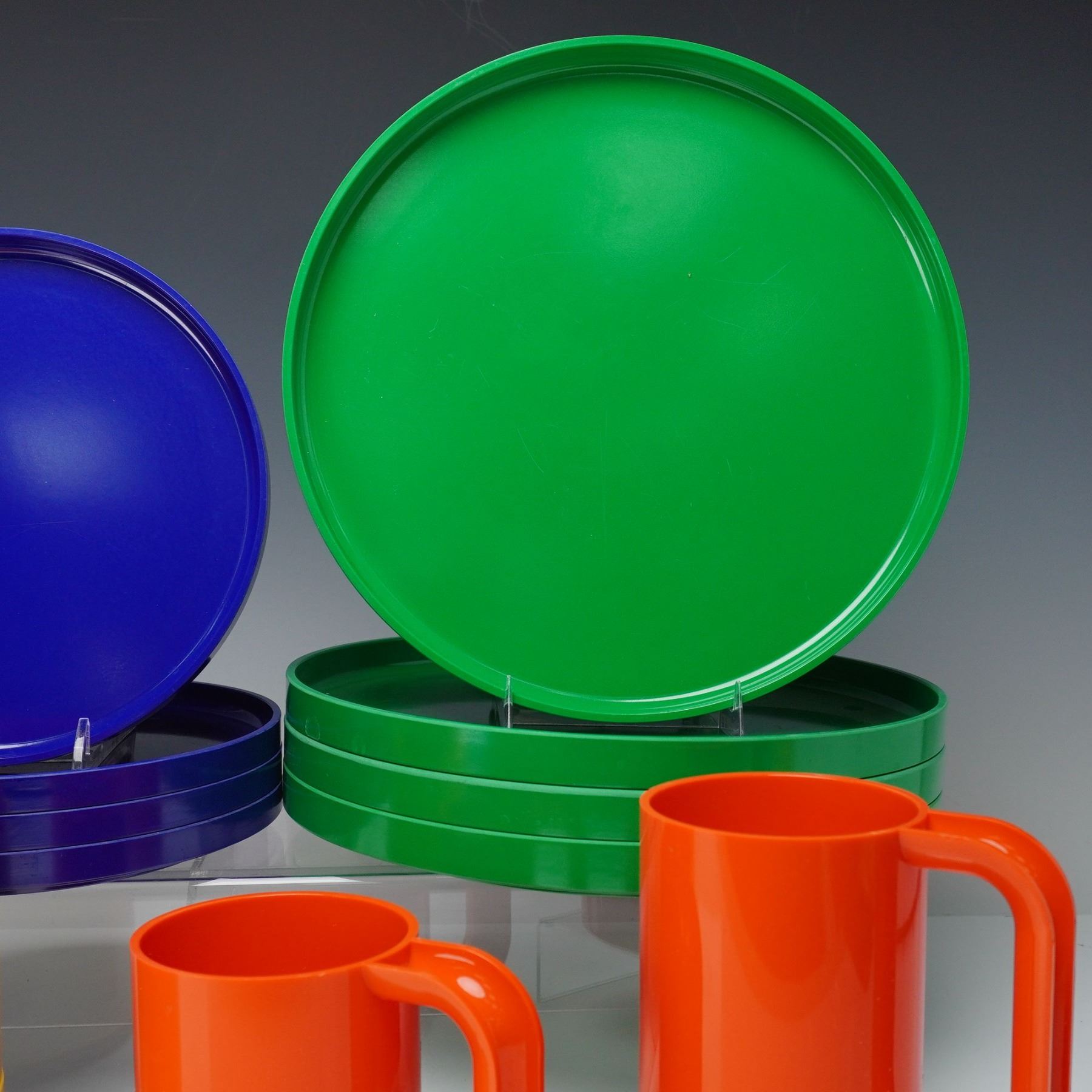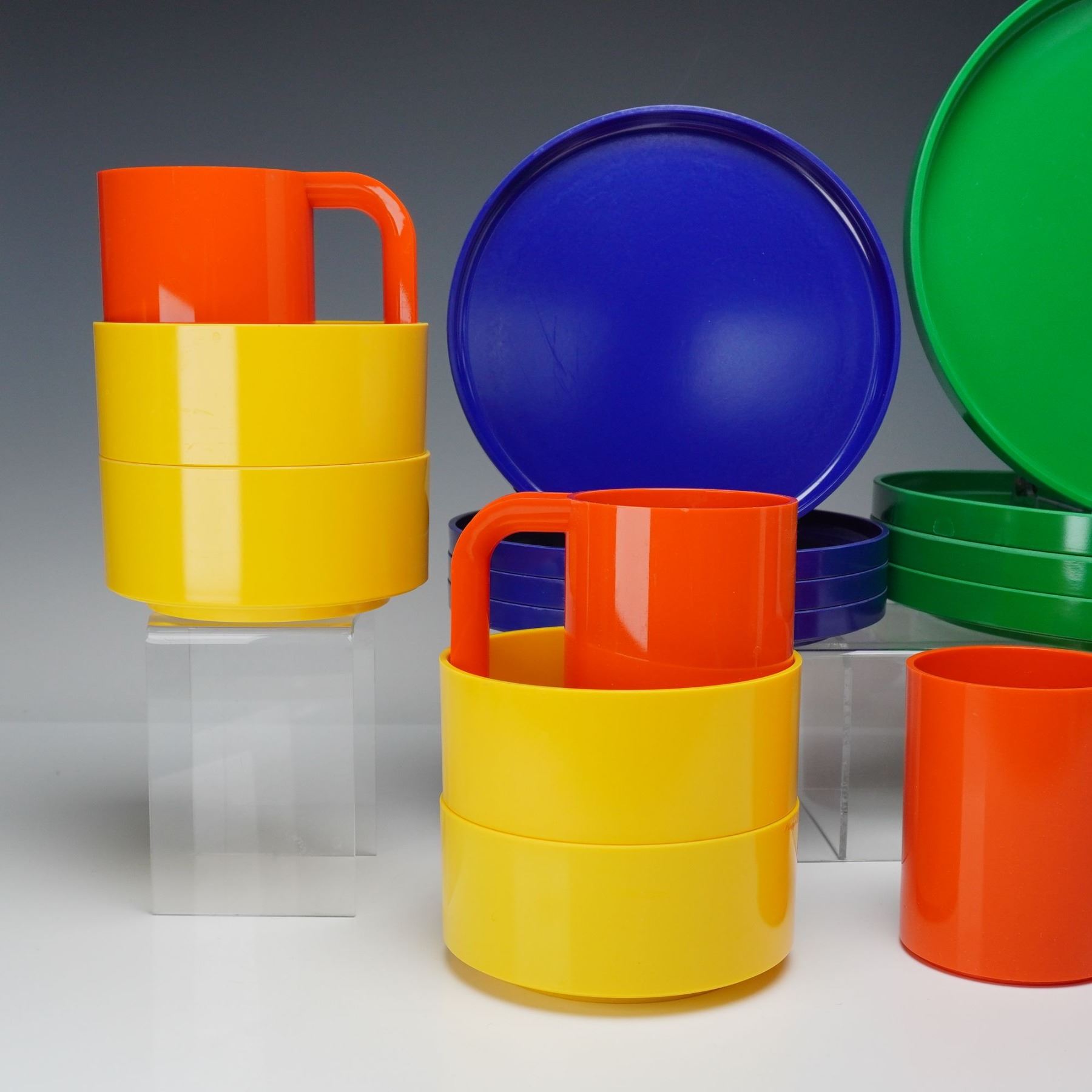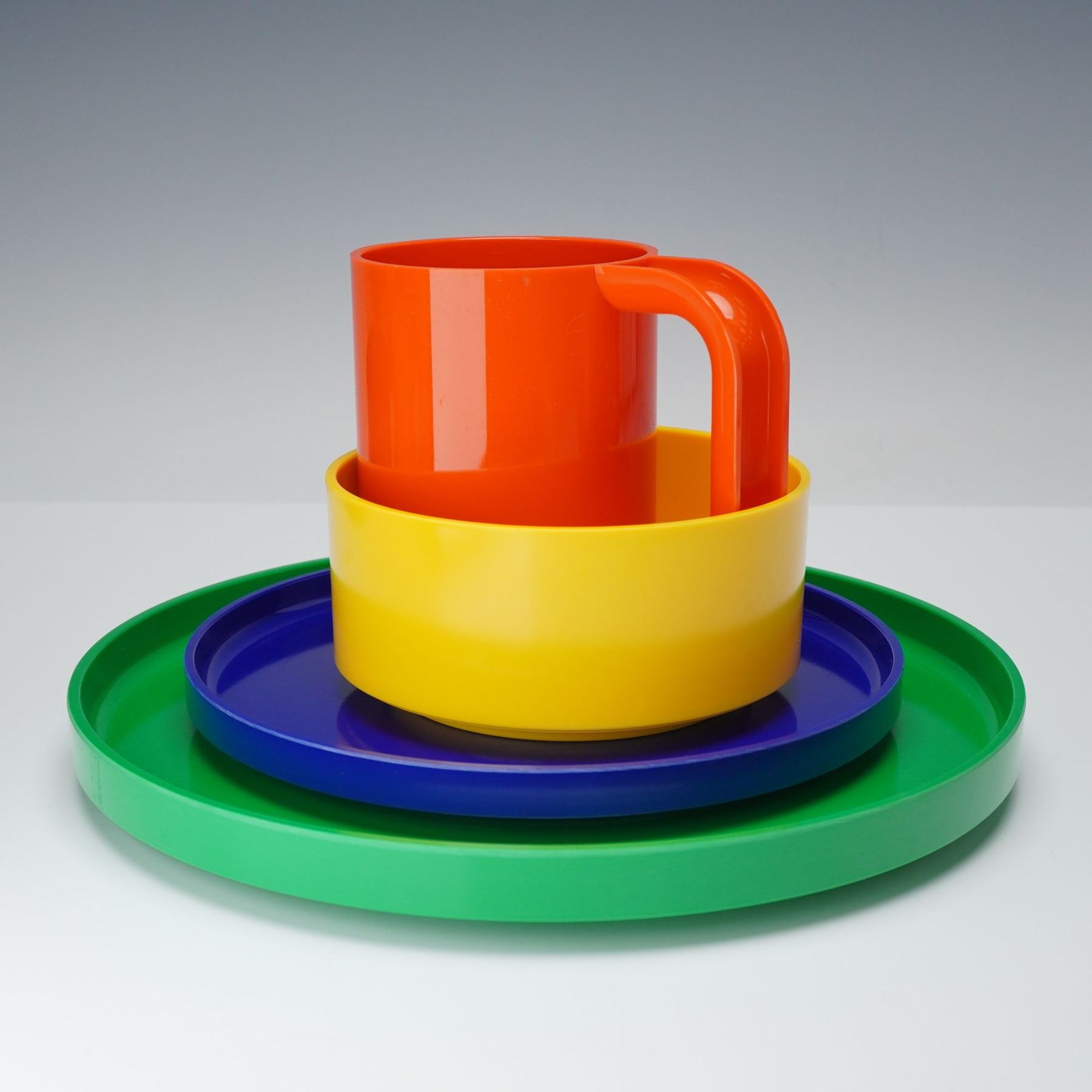 This set features a striking collection of modern plastic tableware in vivid primary colors. The set includes four yellow bowls, four orange mugs, four blue salad plates, and four green dinner plates. Each piece showcases Vignelli's iconic minimalist design with smooth lines, bold tones, and a stackable form that emphasizes both function and style. Heller backstamp.