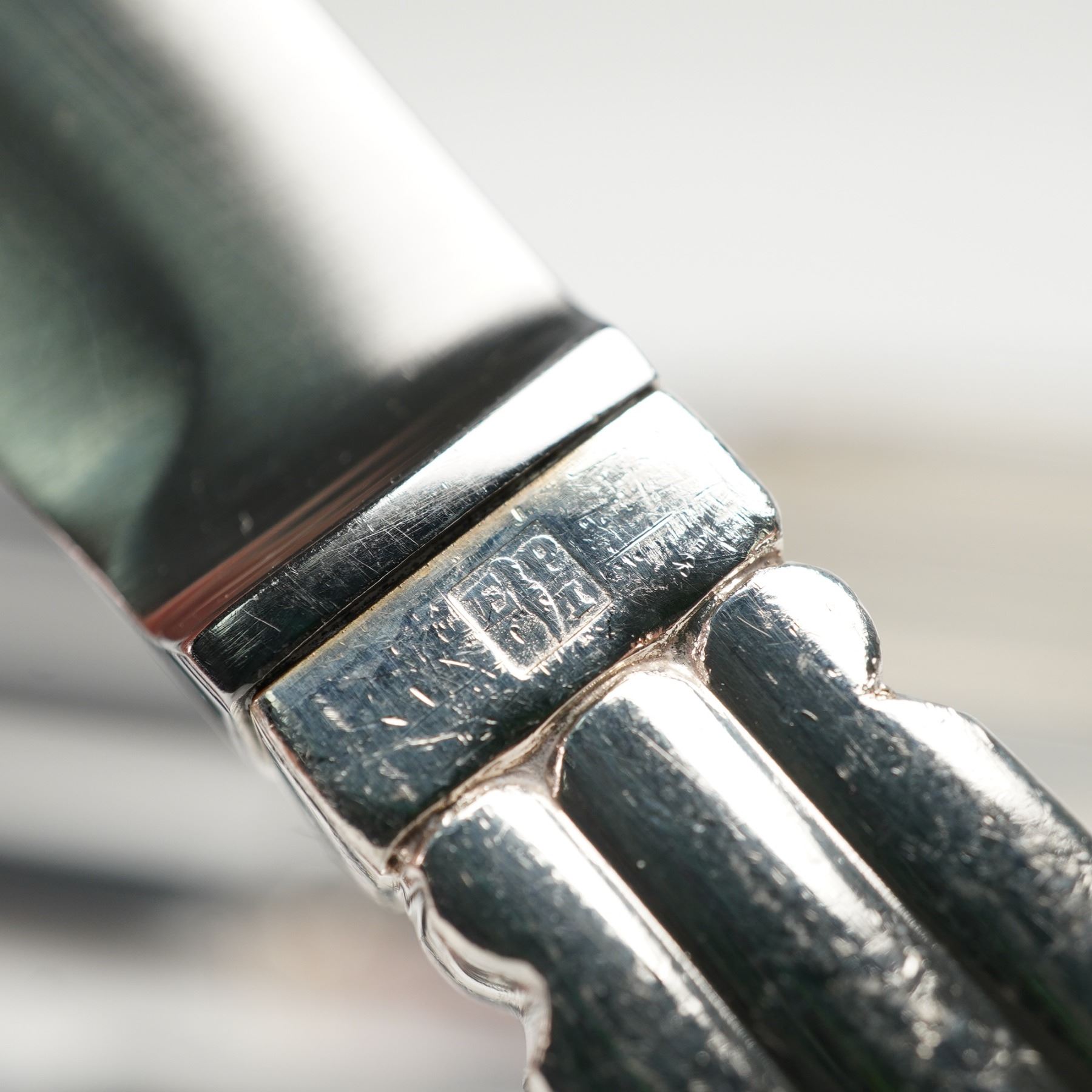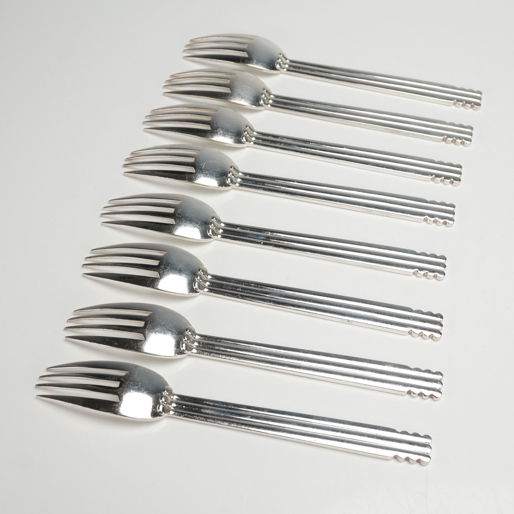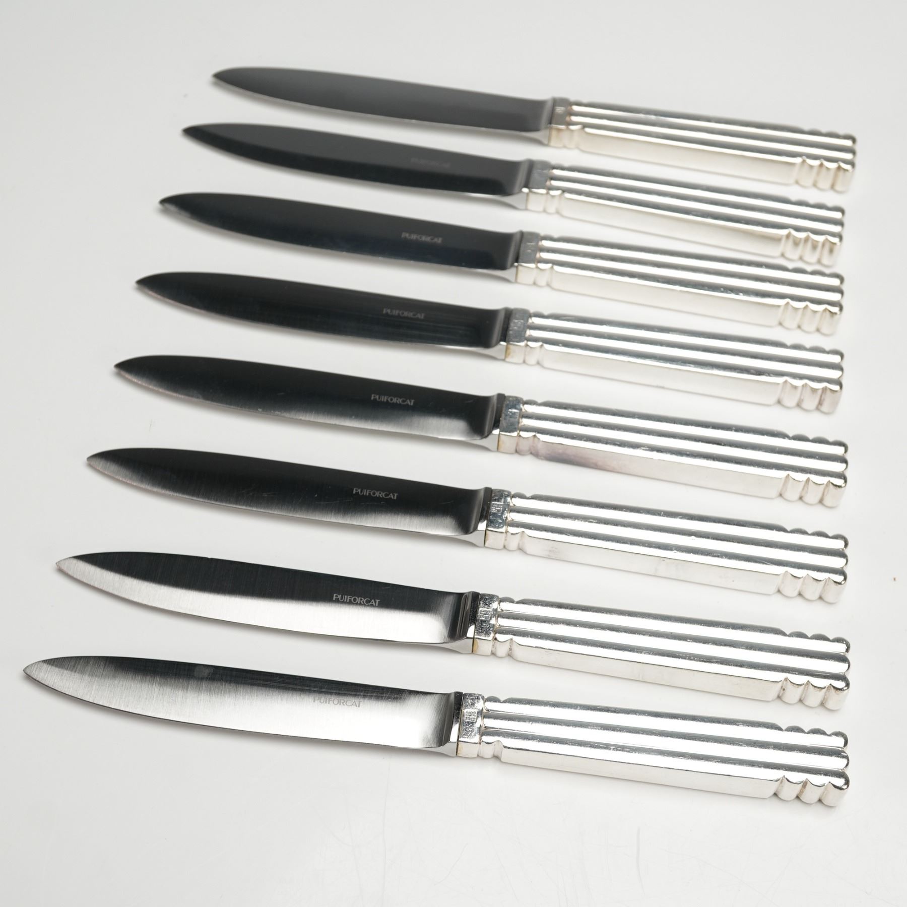 A group of 8 forks and 8 knives that comes together through matching handles that show three long raised lines running the length and end in a rounded wavy rim. Puiforcat backstamp.