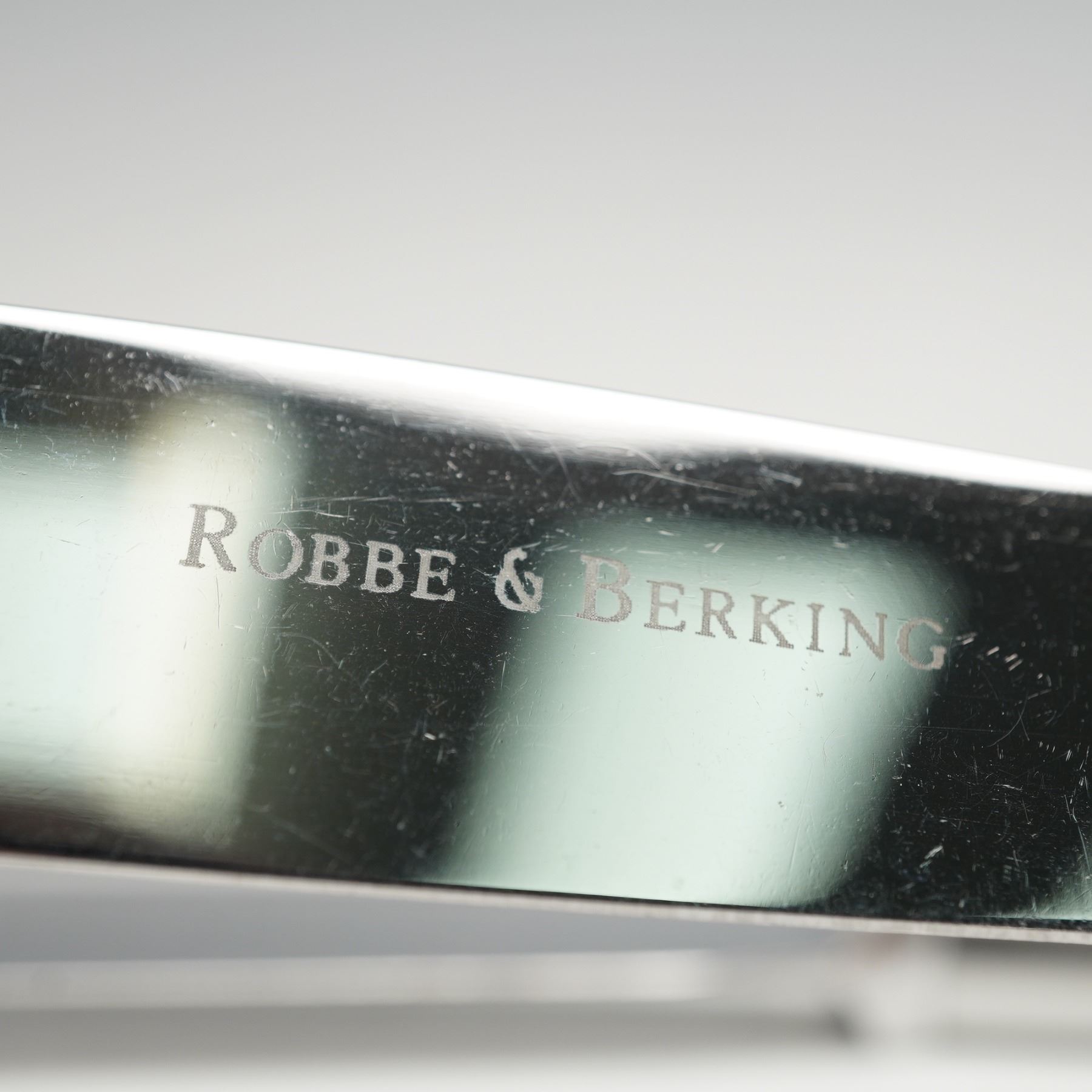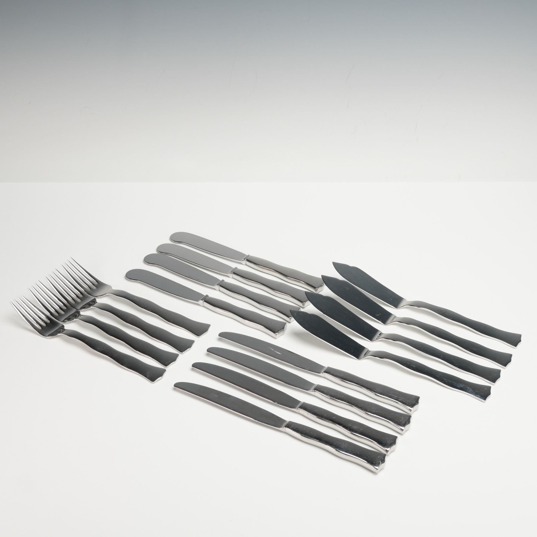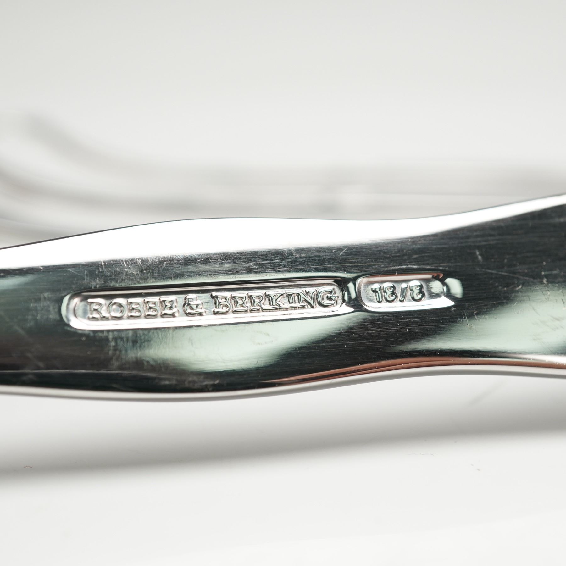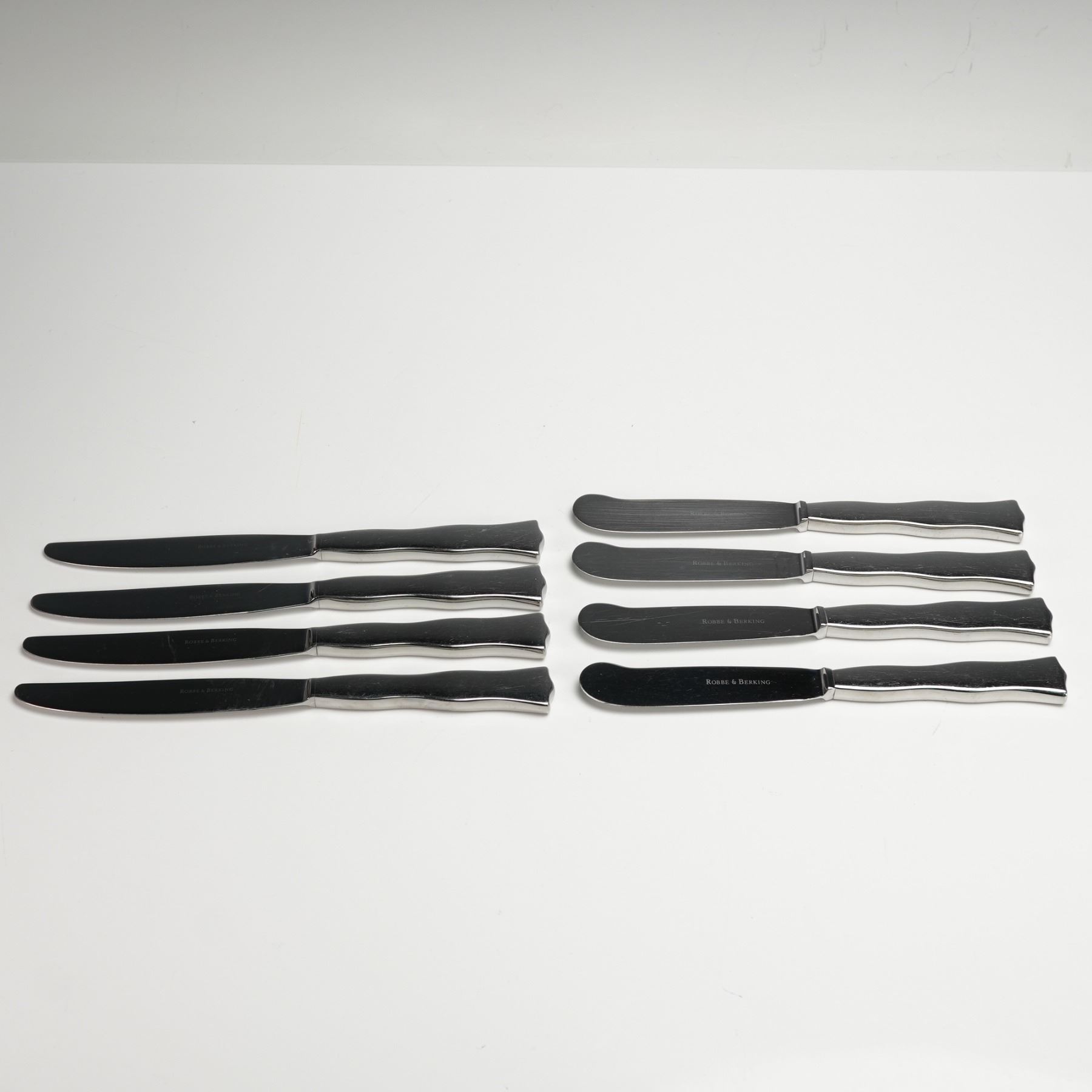 A set of four dessert knives, four butter knives, four tart knives, and four forks with gentle wavy handles that taper into simple smooth heads. Robbe and Berking backstamp. Marked 18 / 18.