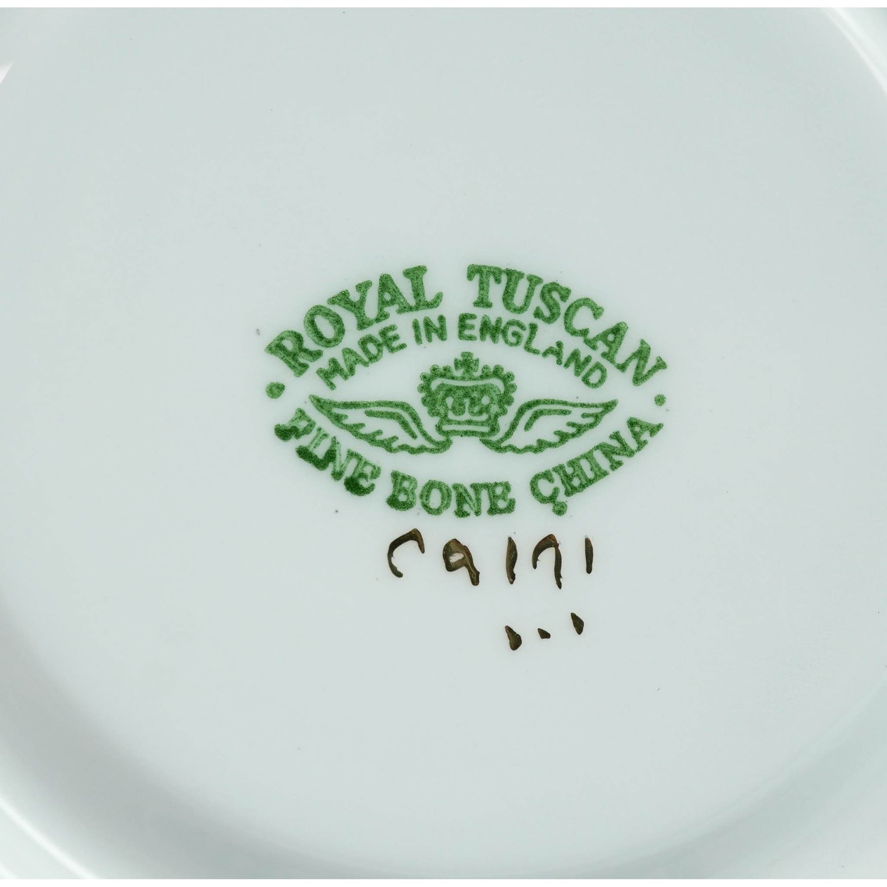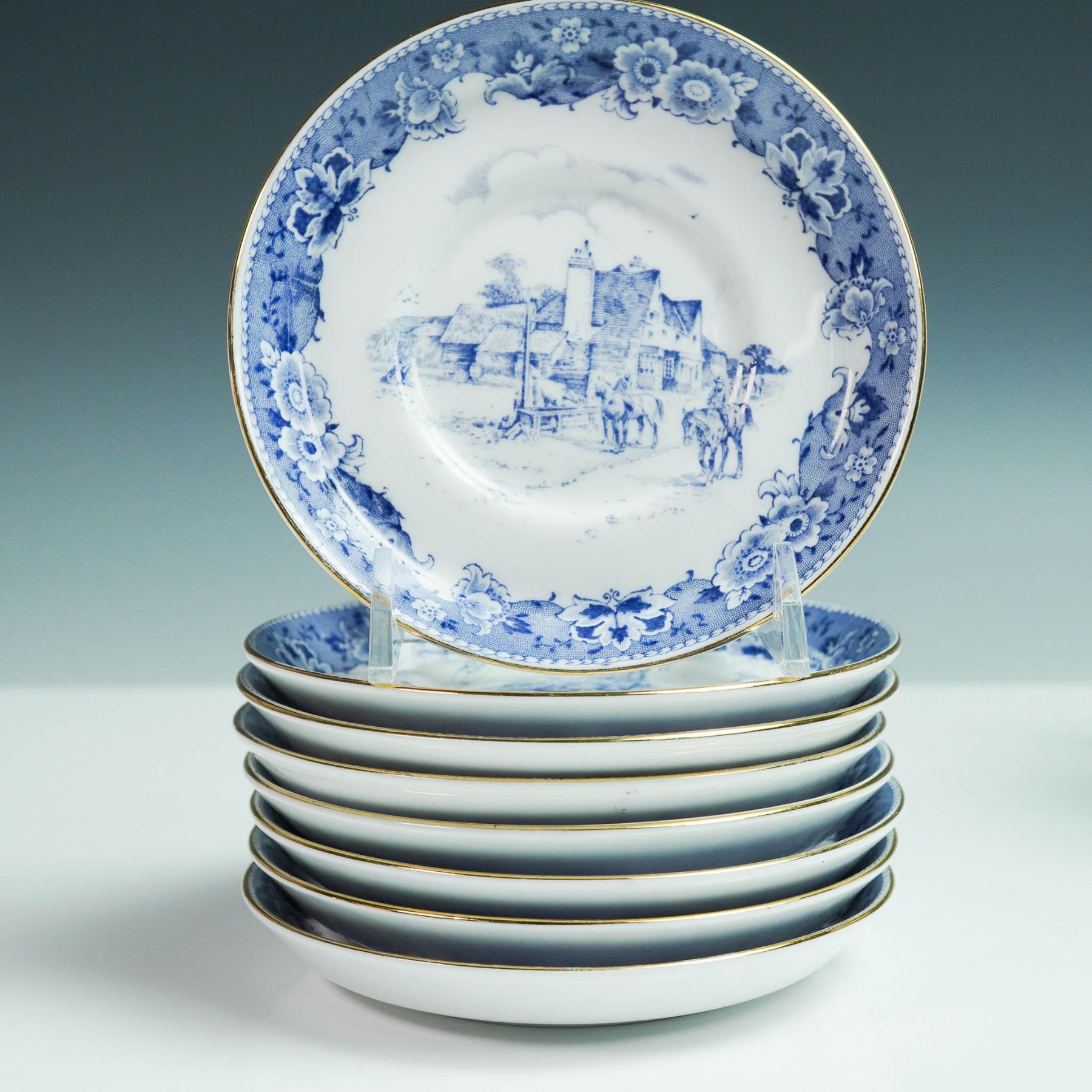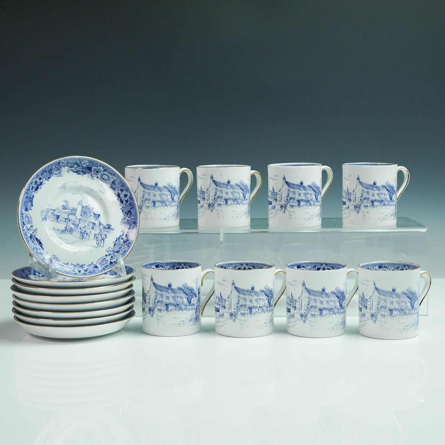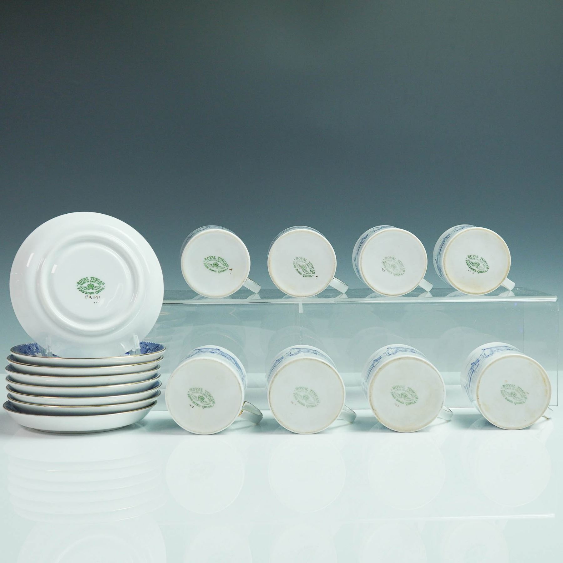 This vintage sixteen-piece tea set by Royal Tuscan includes eight teacups 2.5"H and eight matching saucers 4.75" dia., crafted from fine bone china in England. Each piece features a blue scenic transferware pattern with floral borders and elegant gold trim. Marked with the Royal Tuscan backstamp, this charming set brings traditional English tea service to life.
