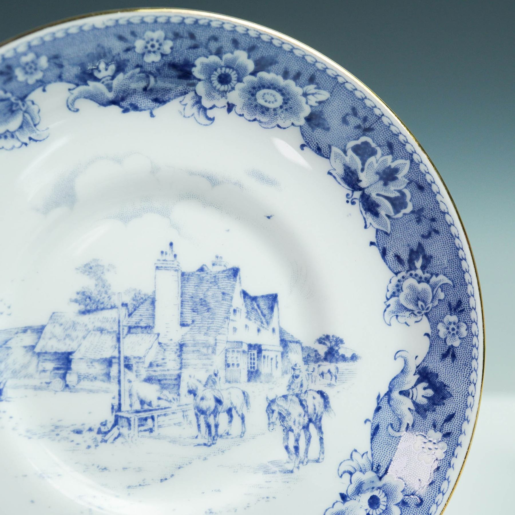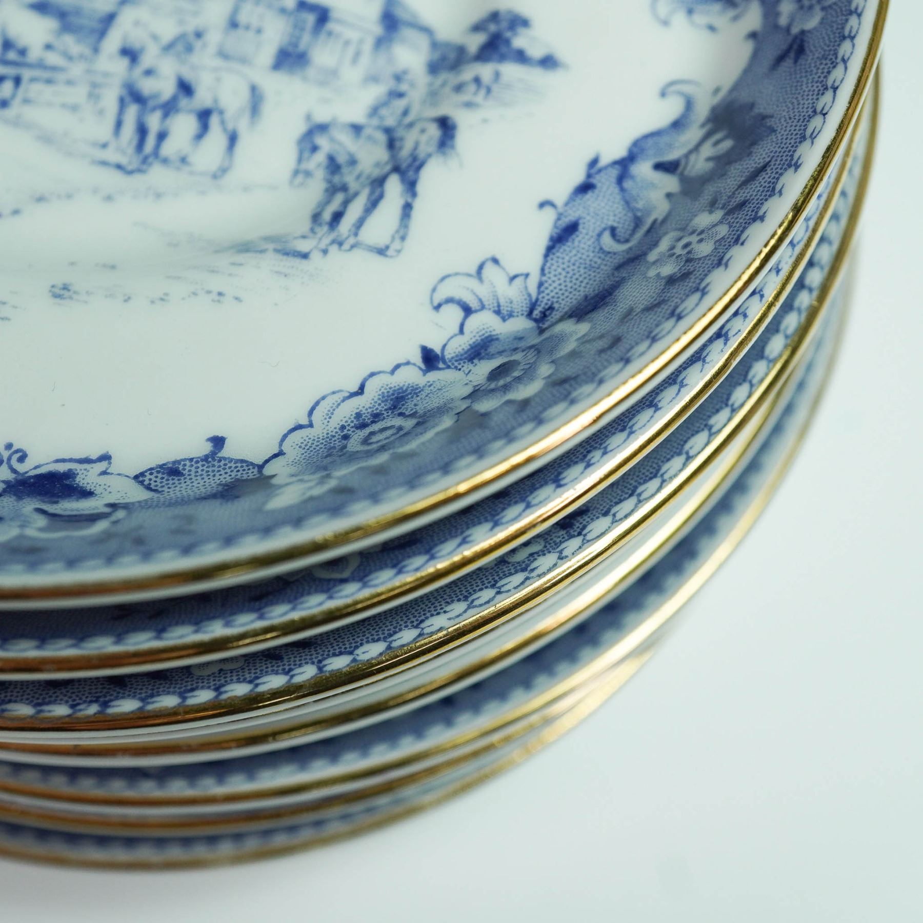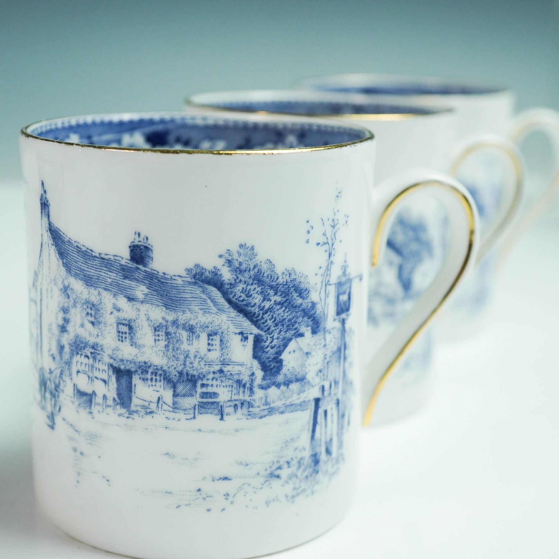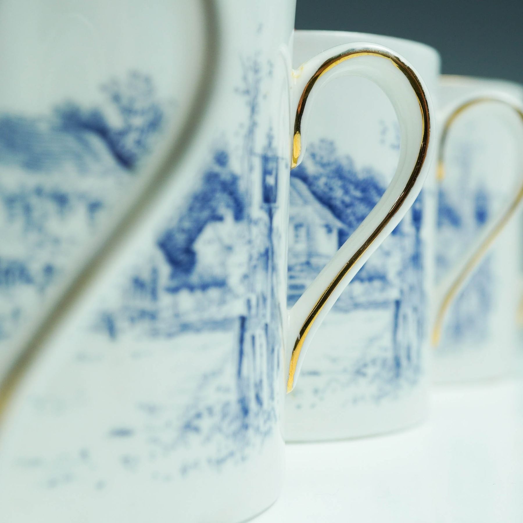 This vintage sixteen-piece tea set by Royal Tuscan includes eight teacups 2.5"H and eight matching saucers 4.75" dia., crafted from fine bone china in England. Each piece features a blue scenic transferware pattern with floral borders and elegant gold trim. Marked with the Royal Tuscan backstamp, this charming set brings traditional English tea service to life.