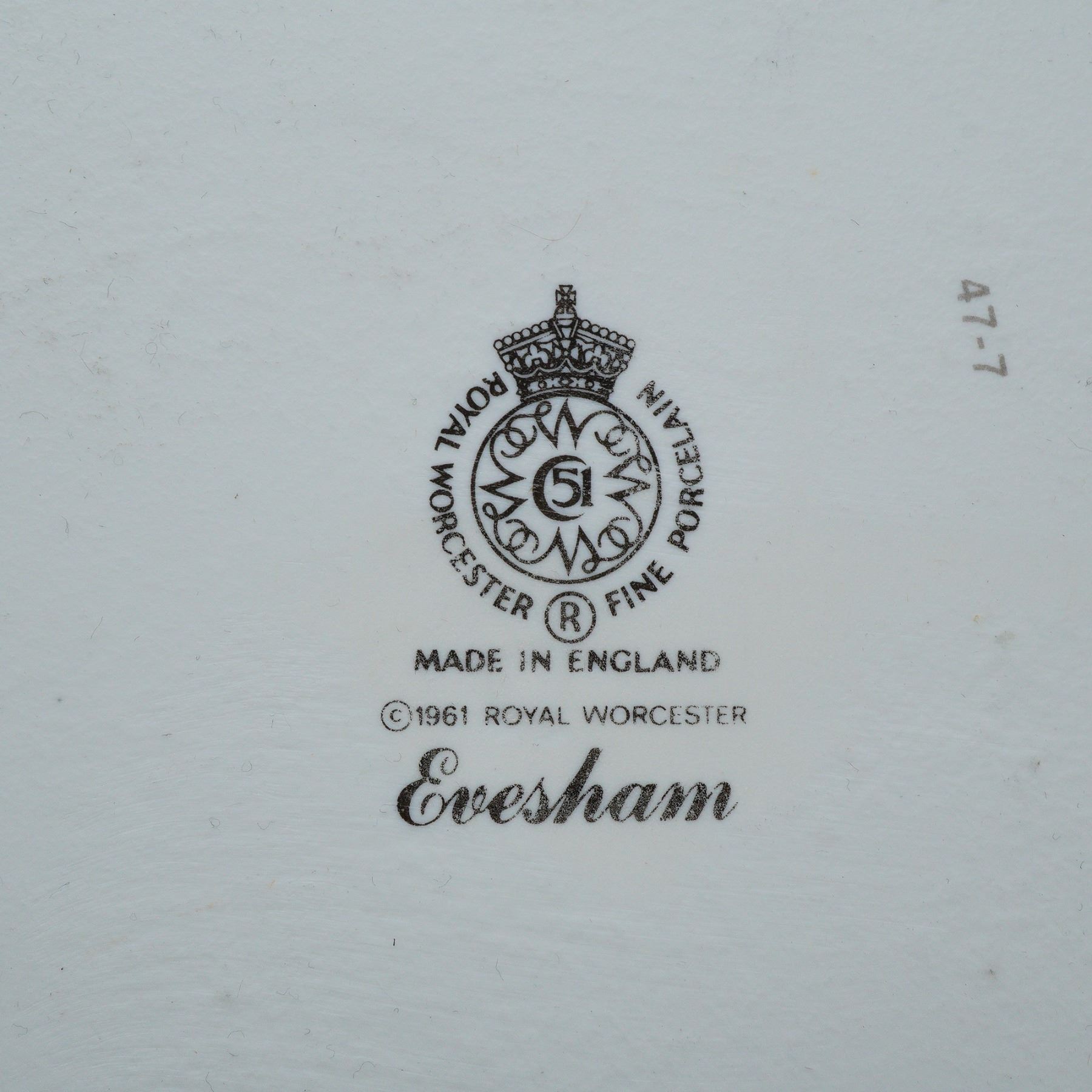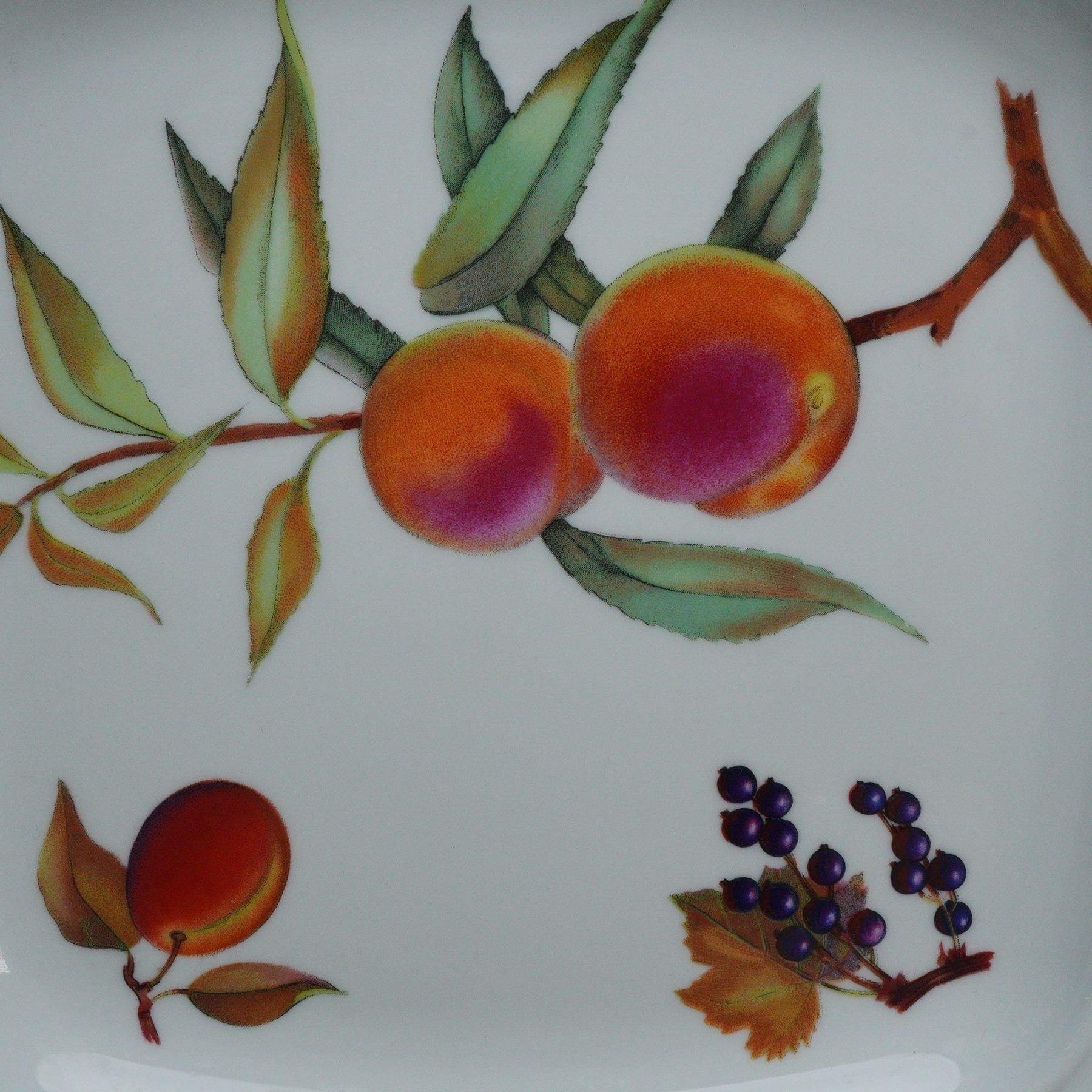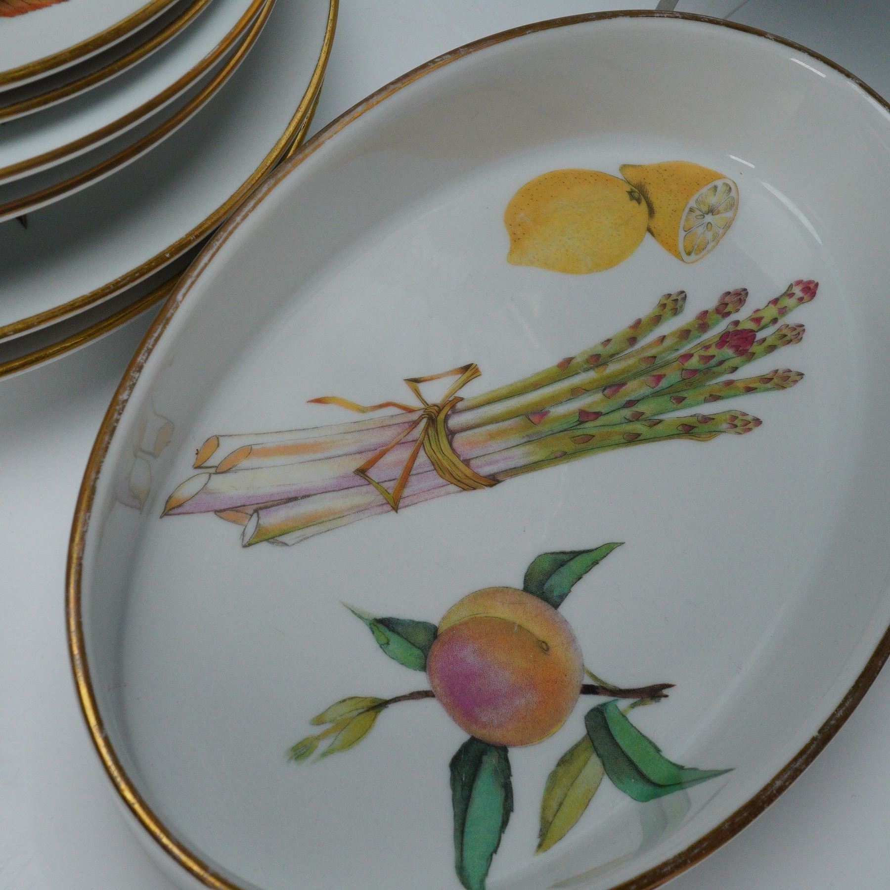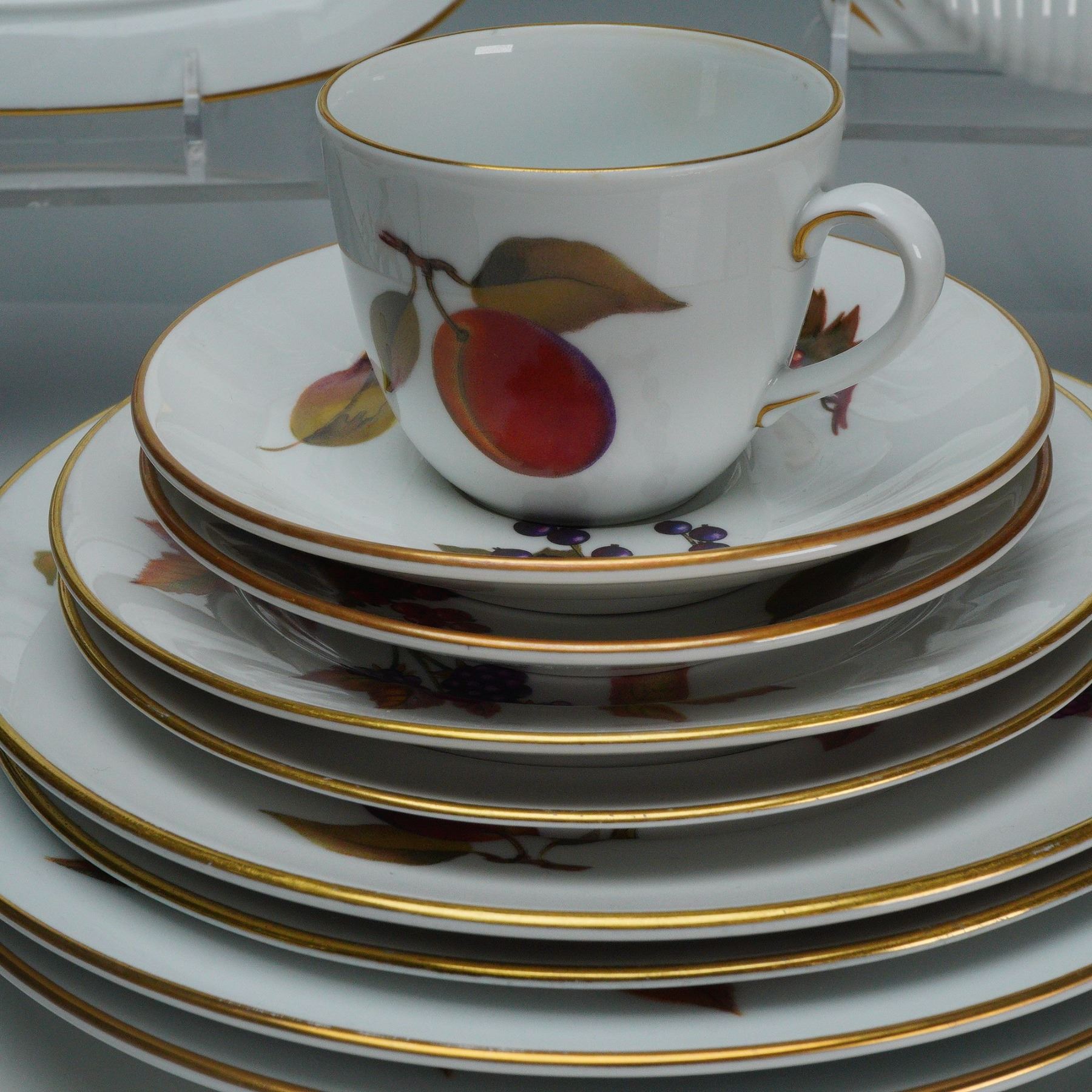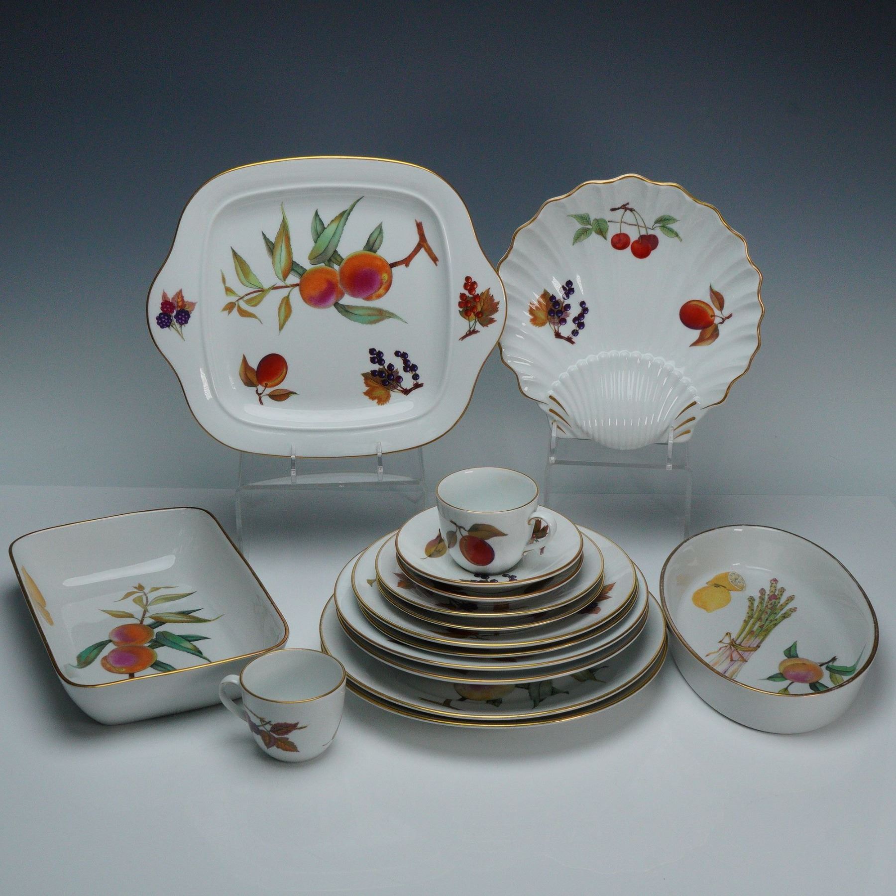 A refined 16-piece Royal Worcester fine porcelain dinnerware set for two in the celebrated Evesham pattern, introduced in 1961. This elegant English set features vivid hand-painted fruit and vegetable motifs including peaches, cherries, lemons, asparagus, and blackberries, each accented with lustrous gold trim. The collection comprises four serving dishes and trays, two cups with matching saucers, and a complete service for two consisting of two dinner plates, two bread plates, two salad plates, two soup bowls, and two smaller plates. Each piece bears the Royal Worcester crown and Evesham backstamp, underscoring its heritage of craftsmanship and artistry. A radiant and collectible ensemble that captures the timeless sophistication of mid-century English porcelain design.