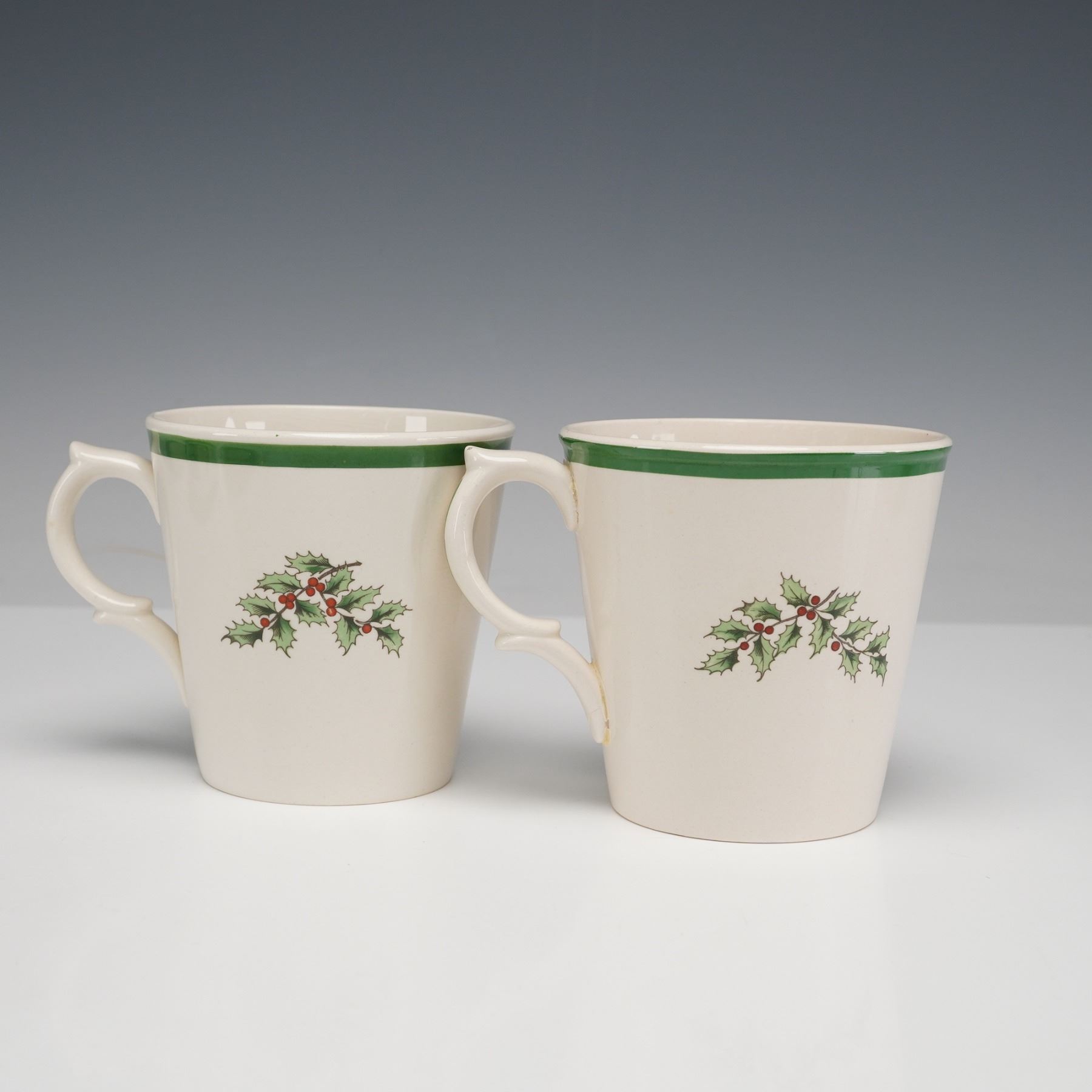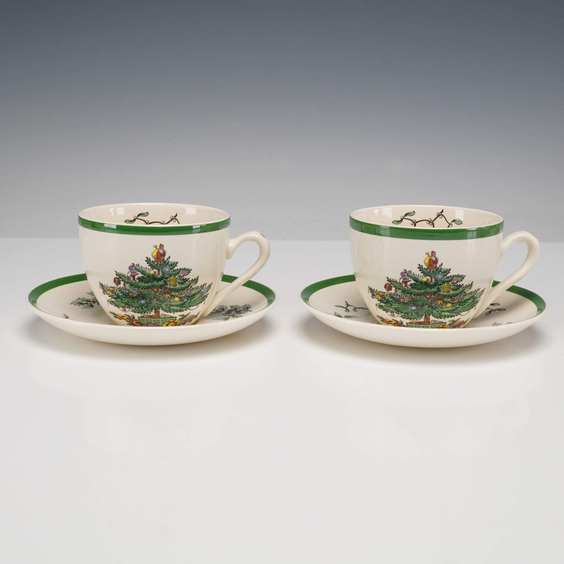 A sixteen piece earthenware set, showcasing the iconic festive design featuring a decorated evergreen with gifts at its base, framed by holly sprigs and bordered in vivid green. The collection includes 2 cups, 2 matching saucers, 2 coffee mugs, 5 crescent shape side plates, 1 fruit bowl, and 4 round bowls. Spode backstamp.