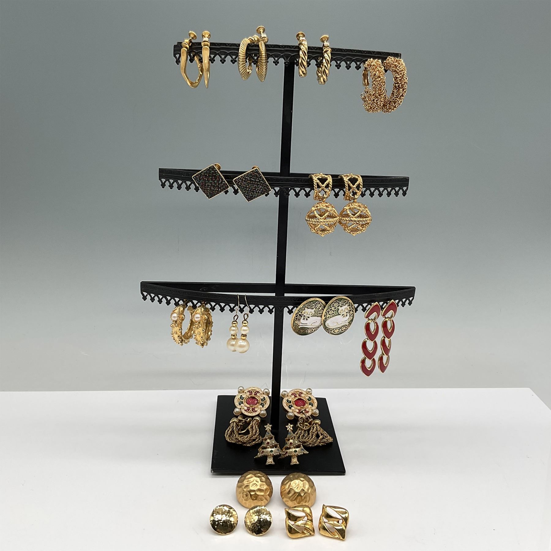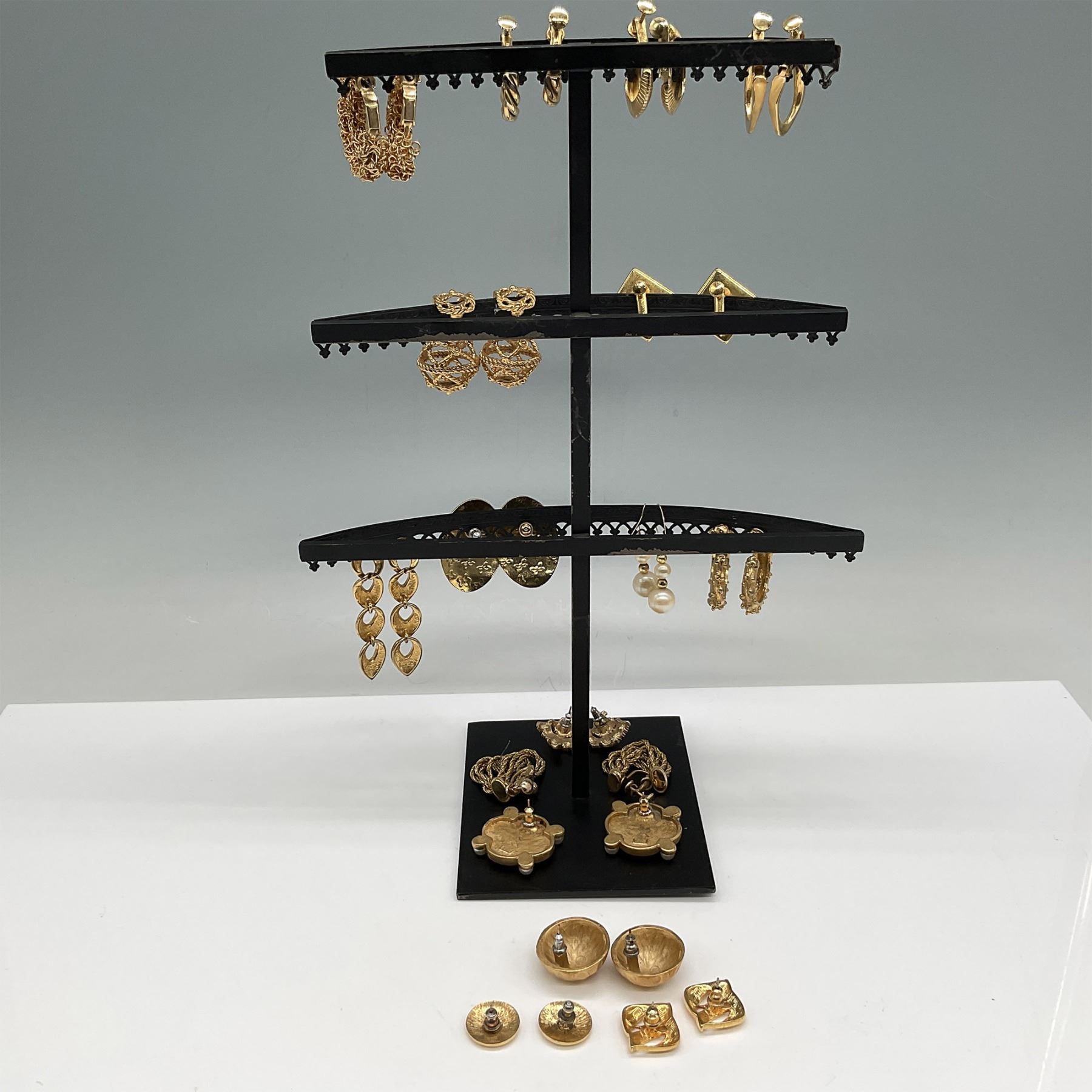 A curated collection of gold-tone costume earrings and accessories, featuring an assortment of styles including hoop, drop, stud, and clip-on designs. This set includes intricate filigree, enamel accents, faux pearls, and statement pieces. Some pairs exhibit unique designs such as floral motifs, geometric shapes, and textured finishes, showcasing vintage-inspired and contemporary aesthetics. Ideal for collectors or as a versatile addition to jewelry collections.