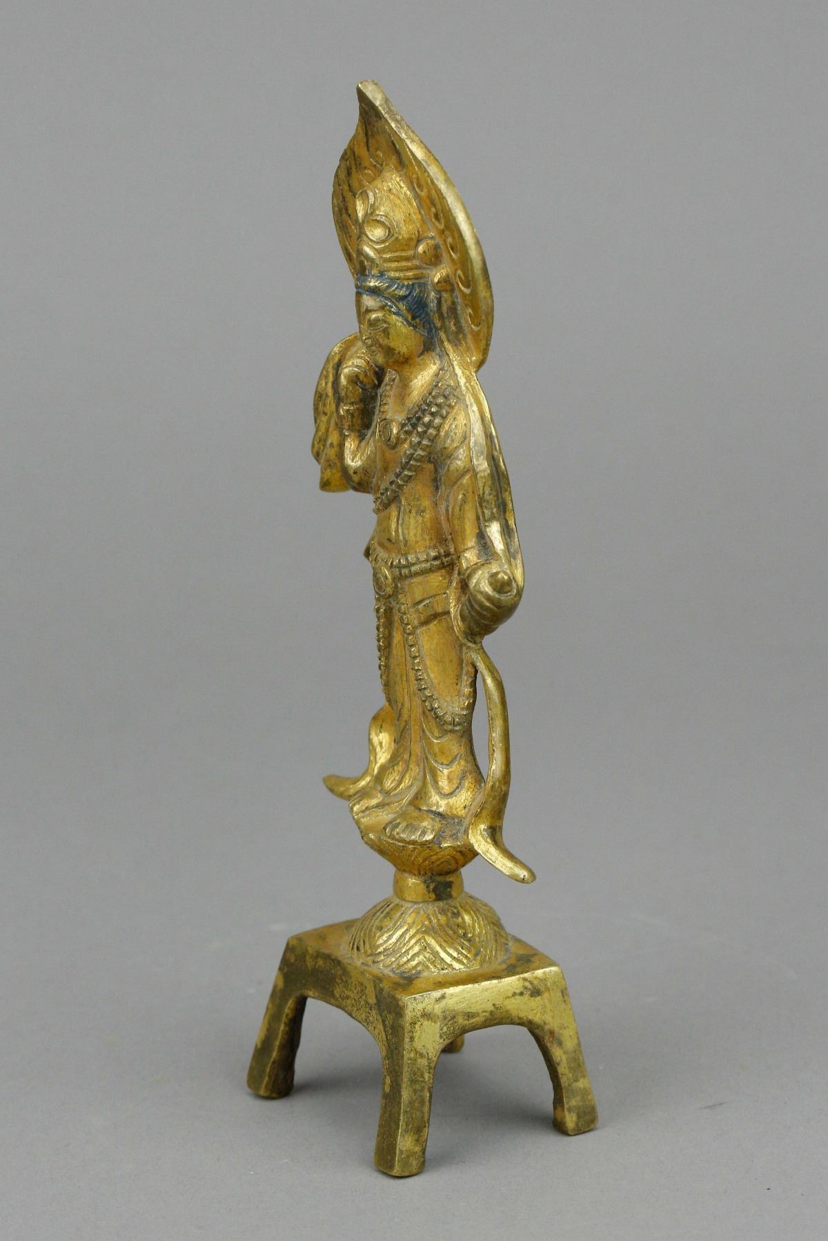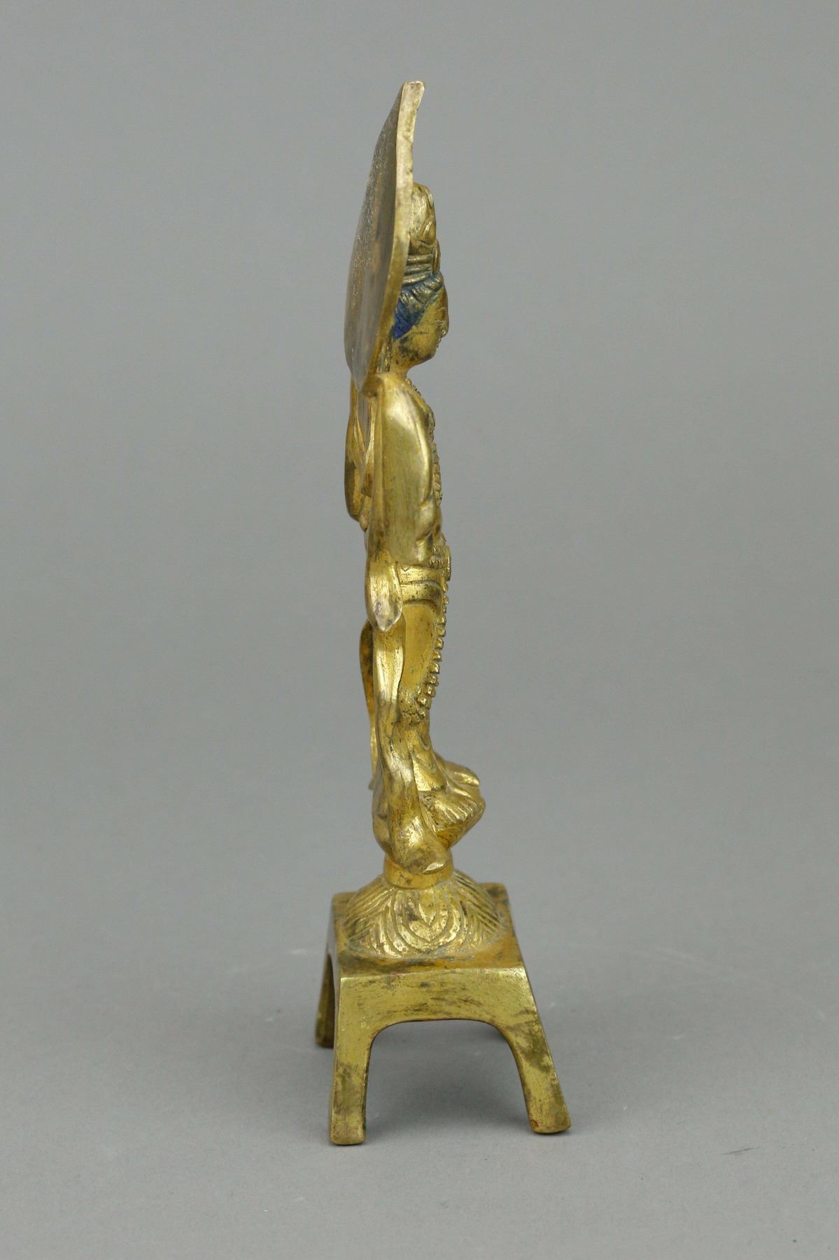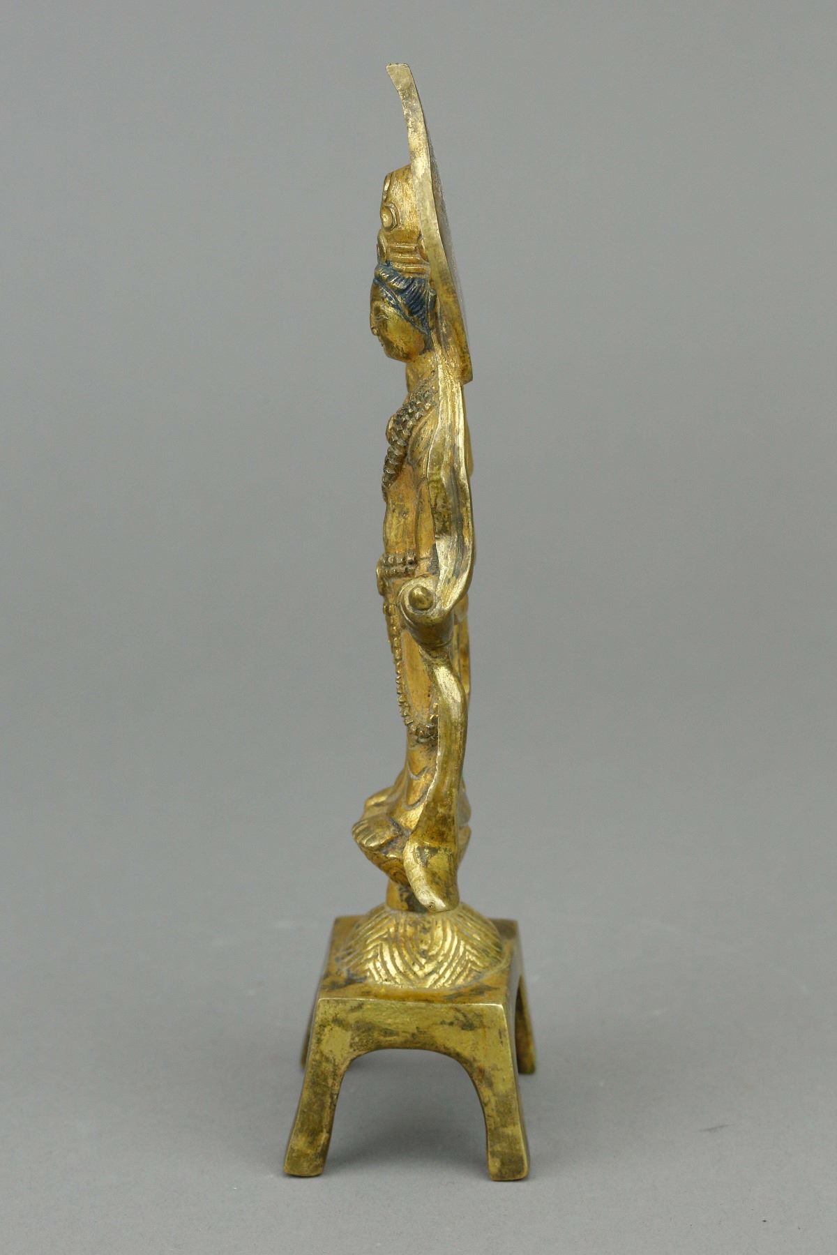 Chinese gilt Buddha with stand; supported on four-legged stand; featuring standing Buddha wearing robe and cape; with glory behind his head; covered by gilt paint on whole body; Ming Dynasty, 16th to 17th century; custom made box included; H: 18.5 cm, W: 6 cm, 216 grams. PROVENANCE: Private collection, Circa 1980 (Nagoya, Japan)