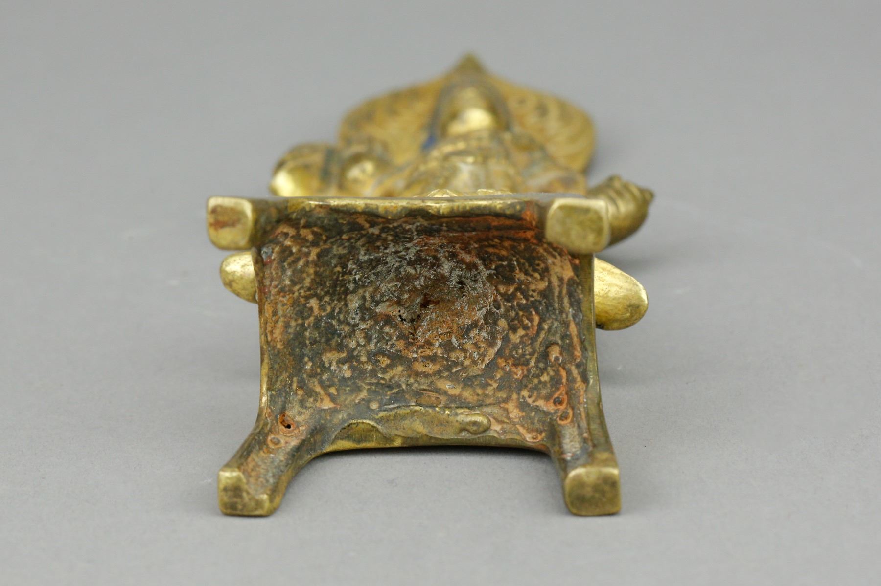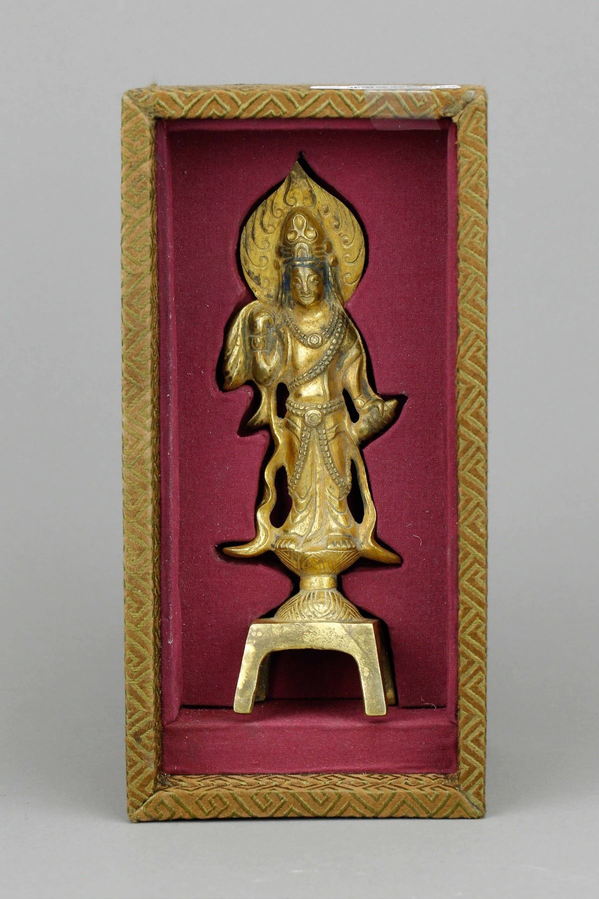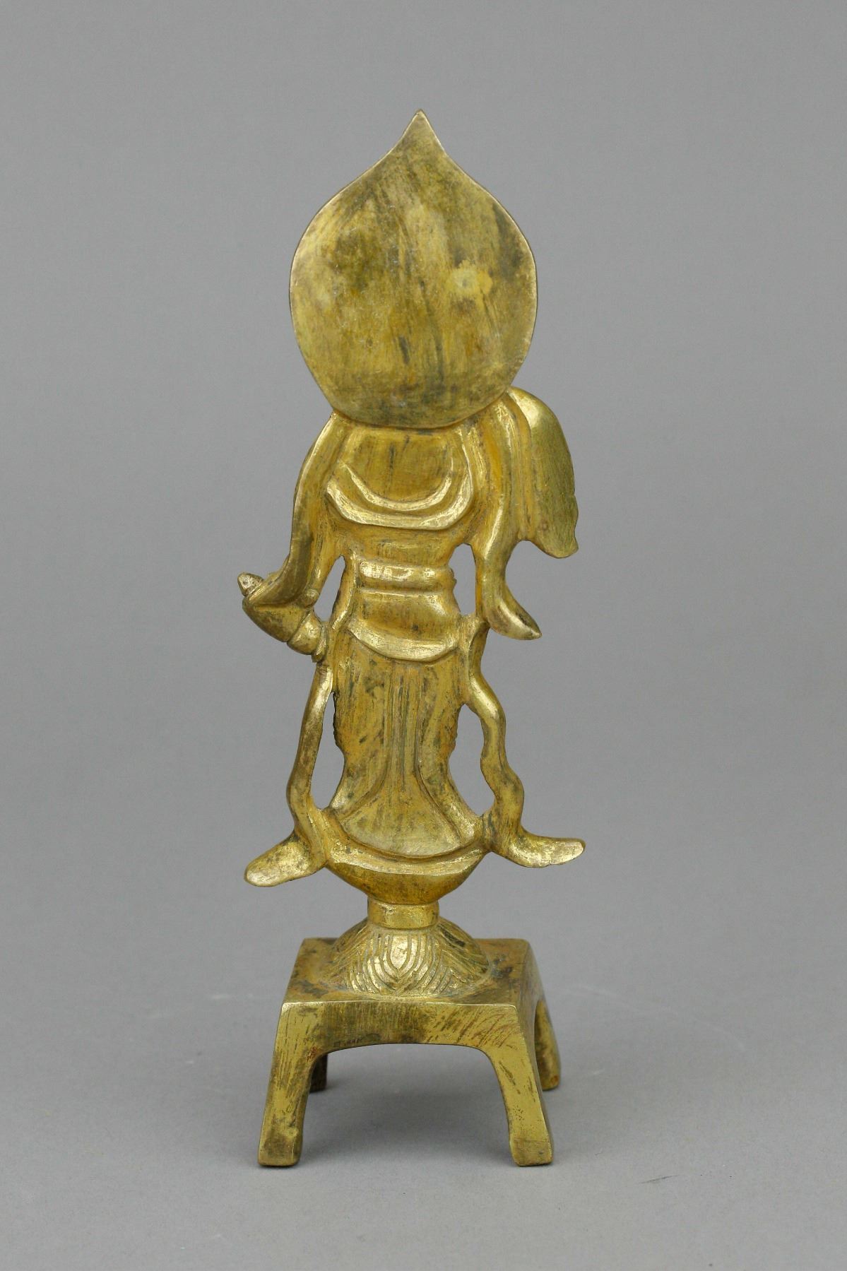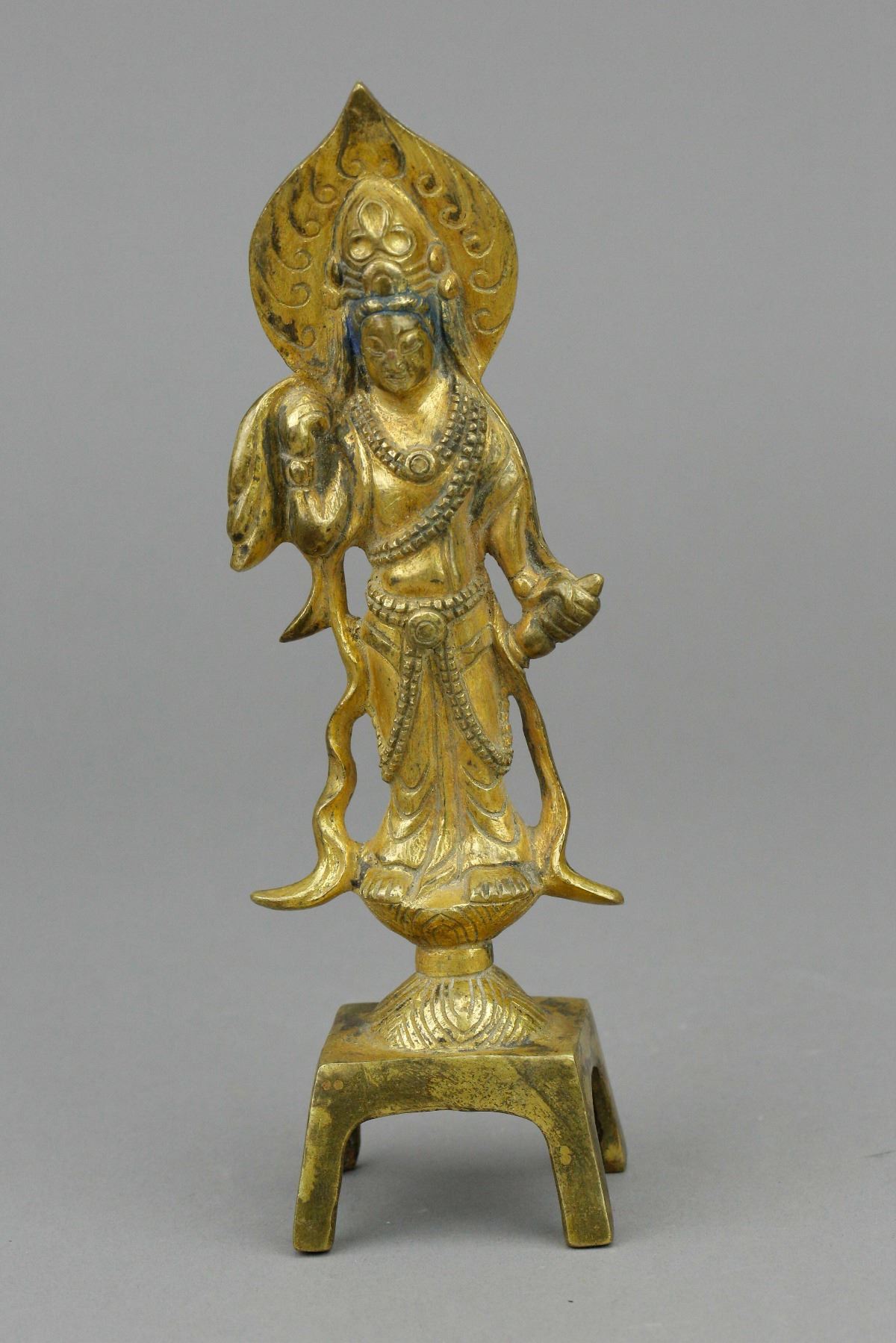 Chinese gilt Buddha with stand; supported on four-legged stand; featuring standing Buddha wearing robe and cape; with glory behind his head; covered by gilt paint on whole body; Ming Dynasty, 16th to 17th century; custom made box included; H: 18.5 cm, W: 6 cm, 216 grams. PROVENANCE: Private collection, Circa 1980 (Nagoya, Japan)