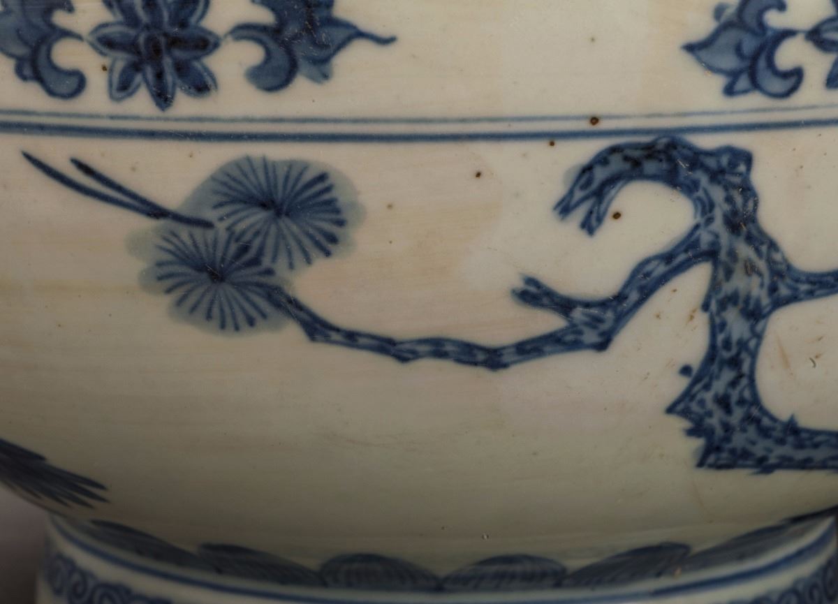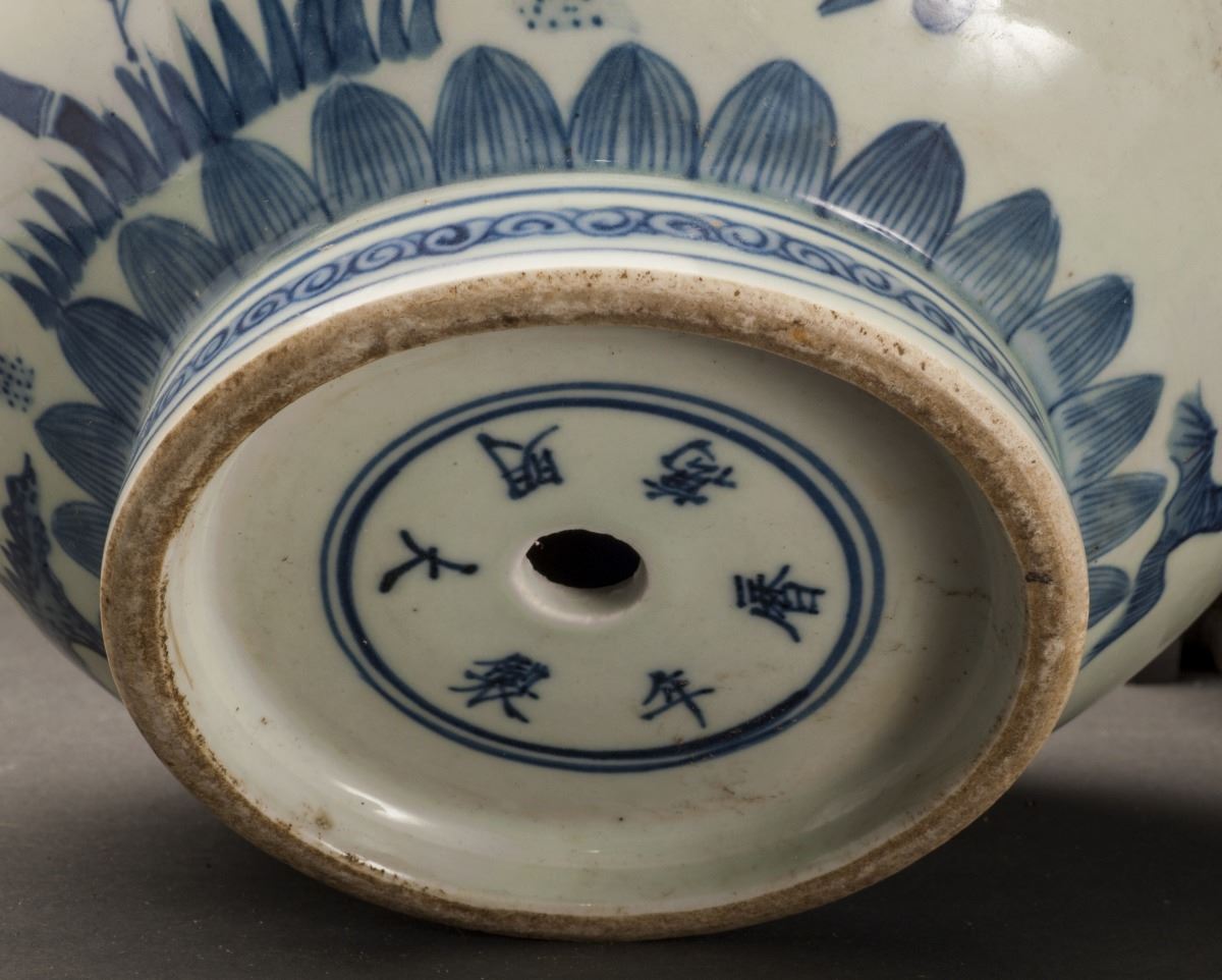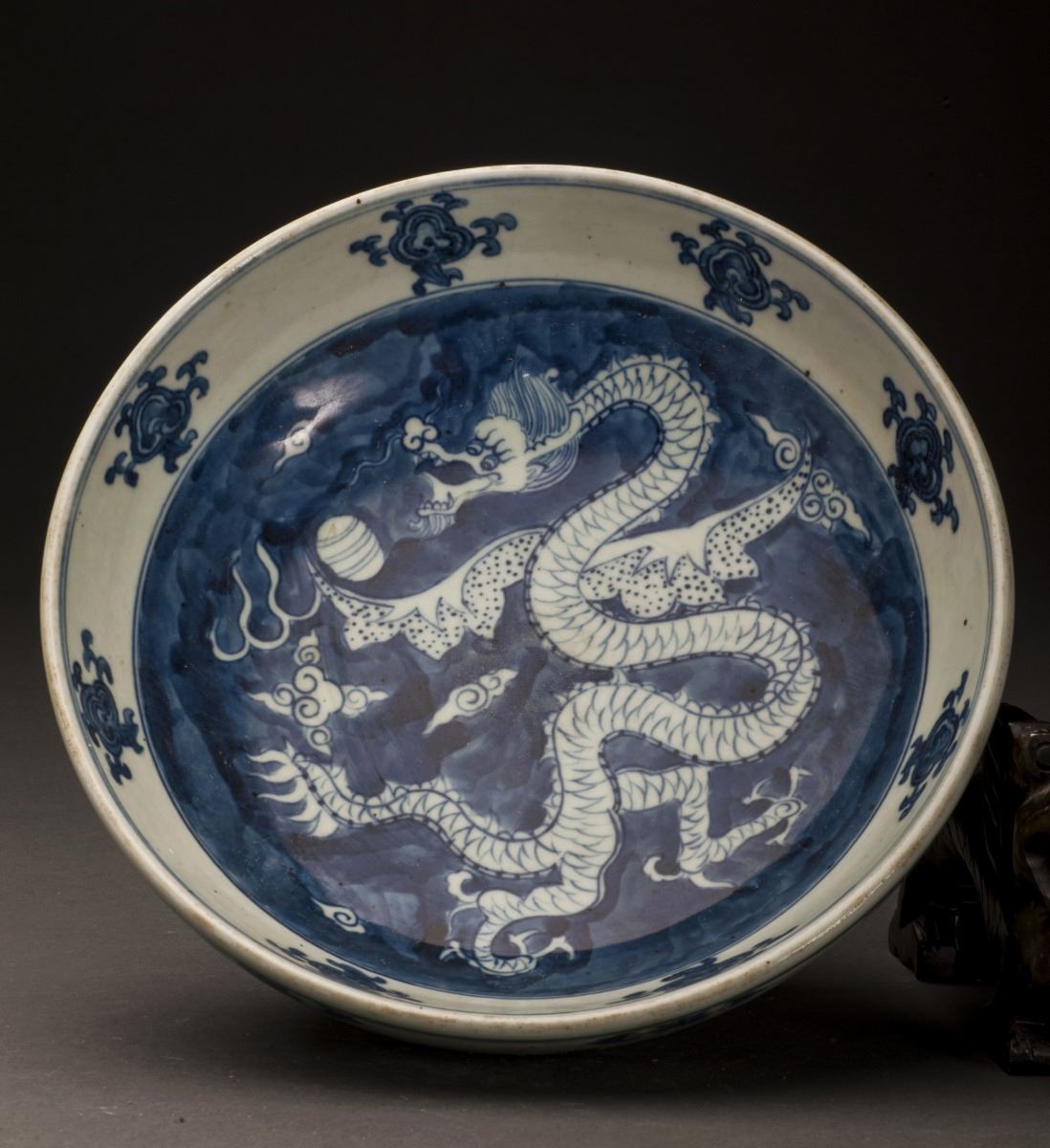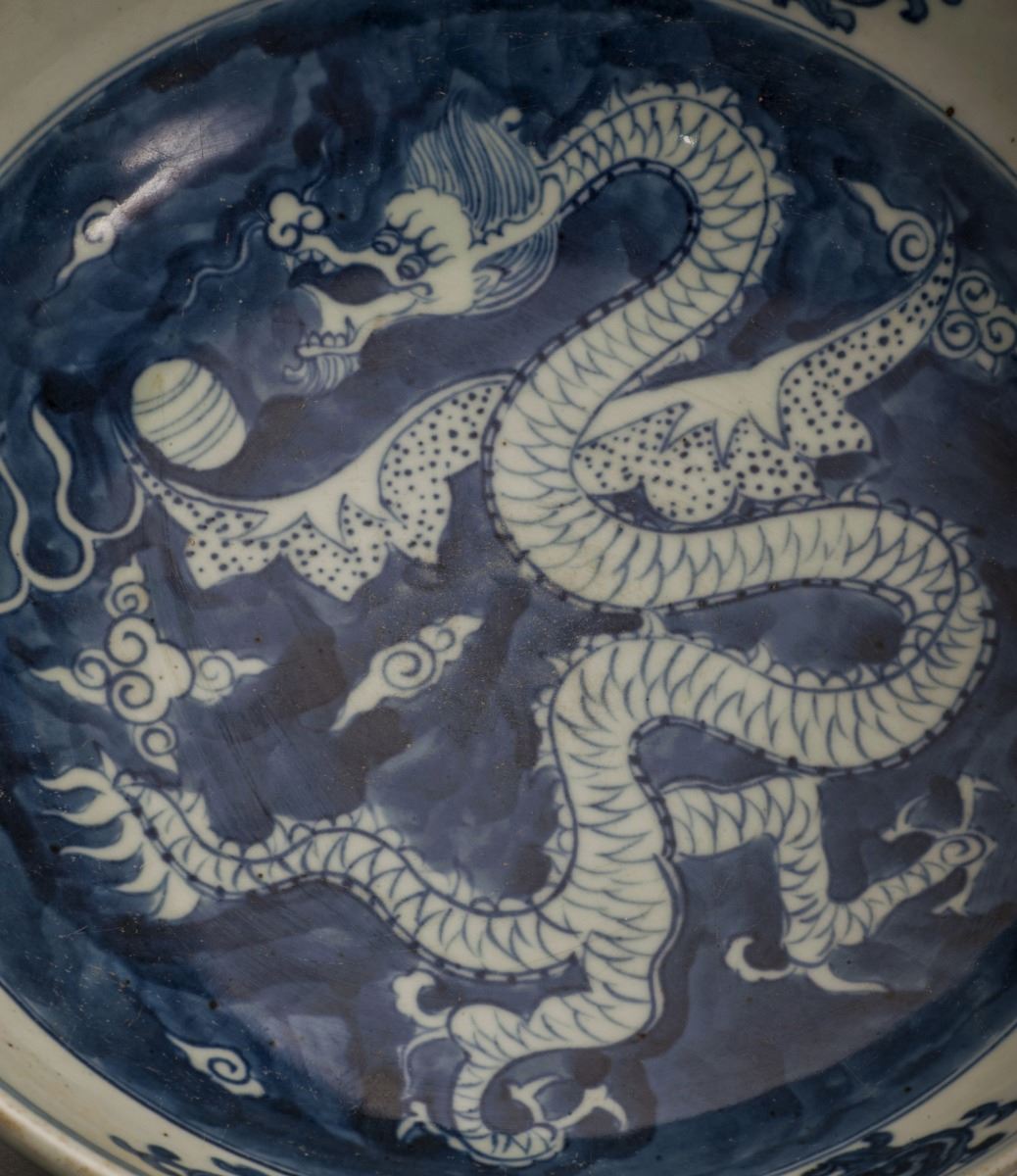 Depicting With A Vivid White Glazed Dragon On The Blue Base, Painted In Extremely Detailed. Depicting With Vivid Bamboo And Flowers At The Finely Potted Cavetto. Heavily Potted Rim, Raised To The Short Foot On TheBottom. Marked As "wanli(1573-1619)" On The Bottom.
