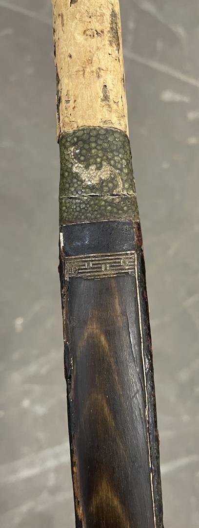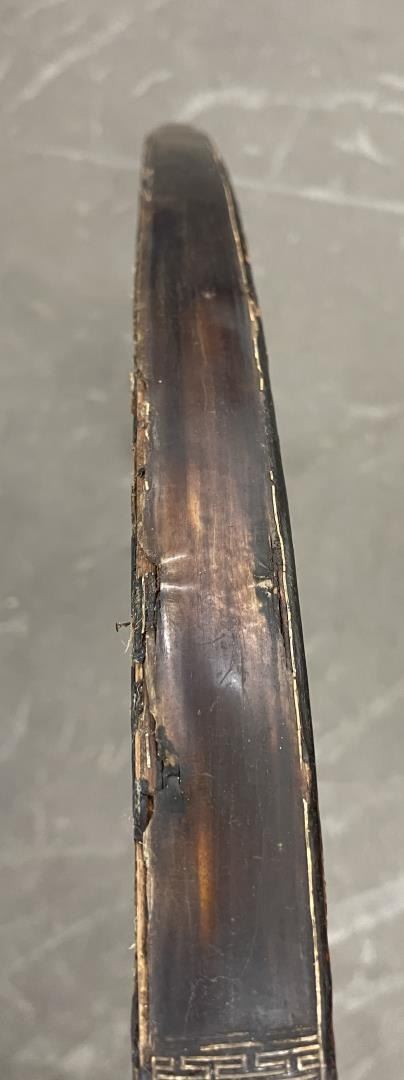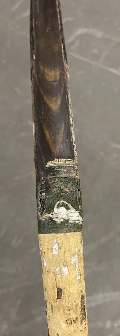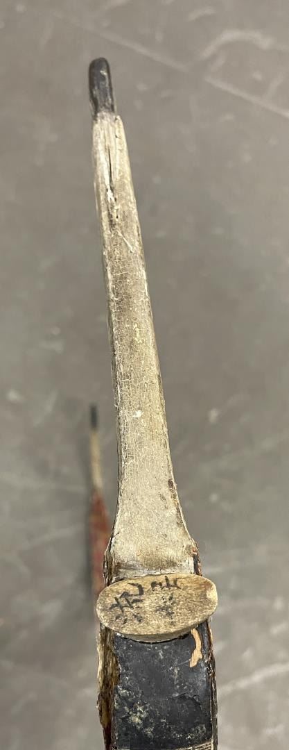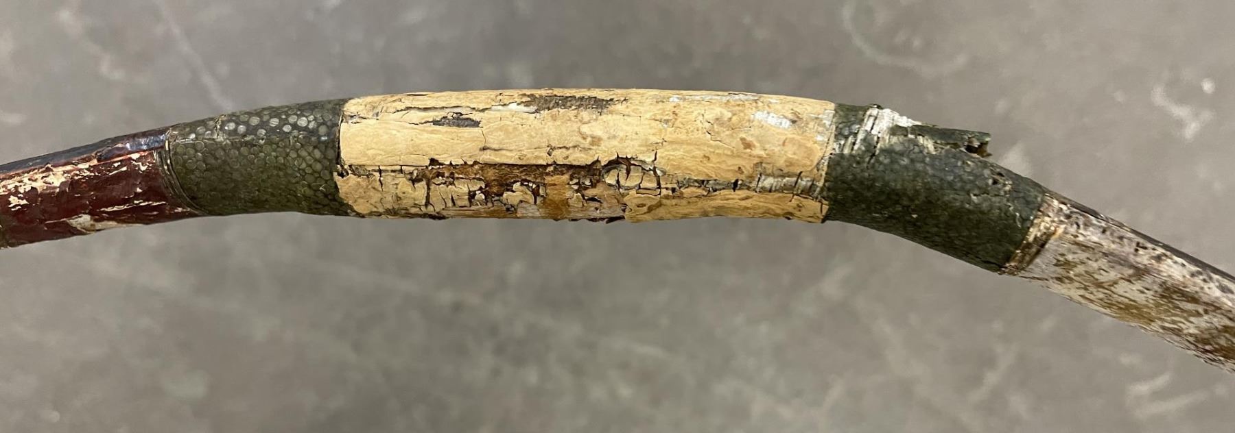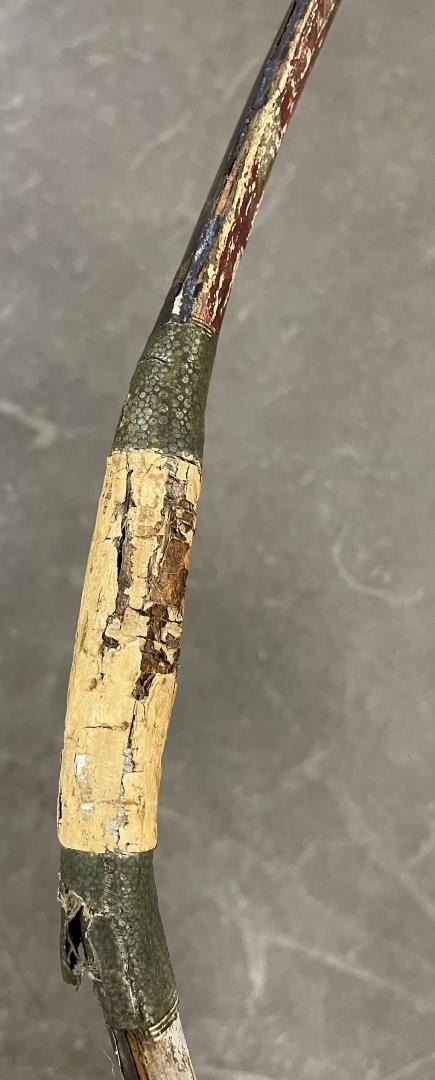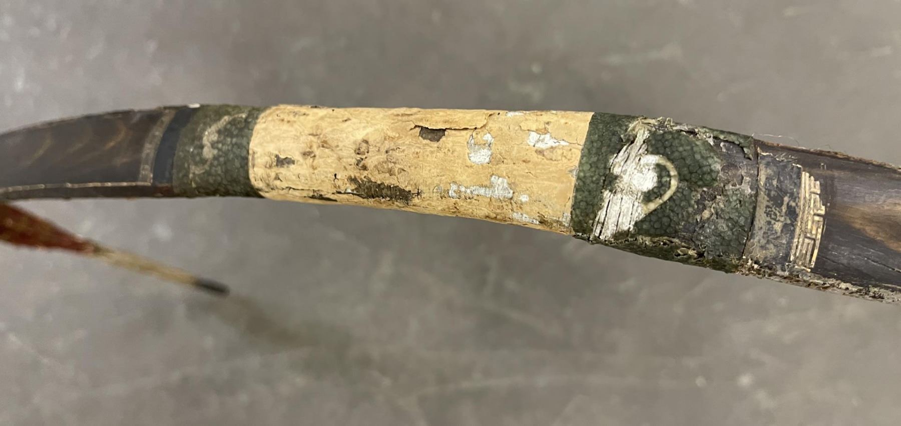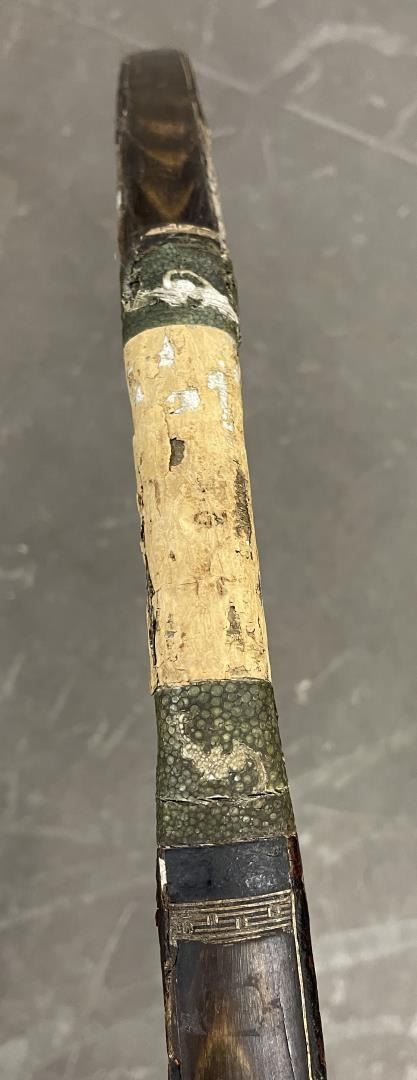 Gene Wensel Collection (Brothers of the Bow). Chinese or Tibetan composite bow, wood, wrapped and painted. Has animal bone/antler. Shagreen (shark skin) on handle. Wood is Birch bark. Bows hung in a temple in chinafor 500 years. Saxton Pope's brother (Navy) brought back from Northern China. Over 500 years old. Brought back around the late 1920s