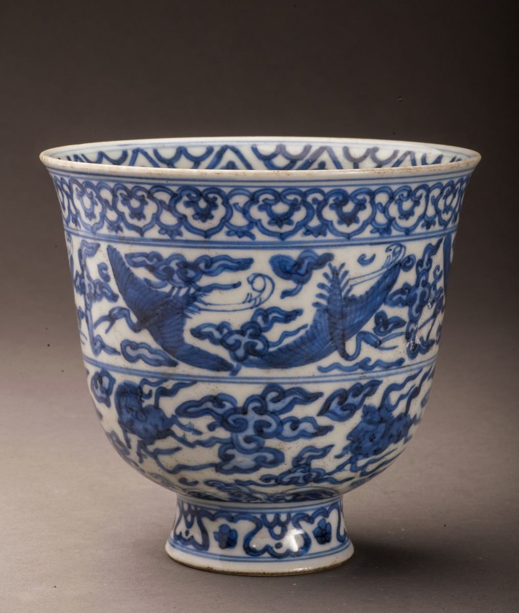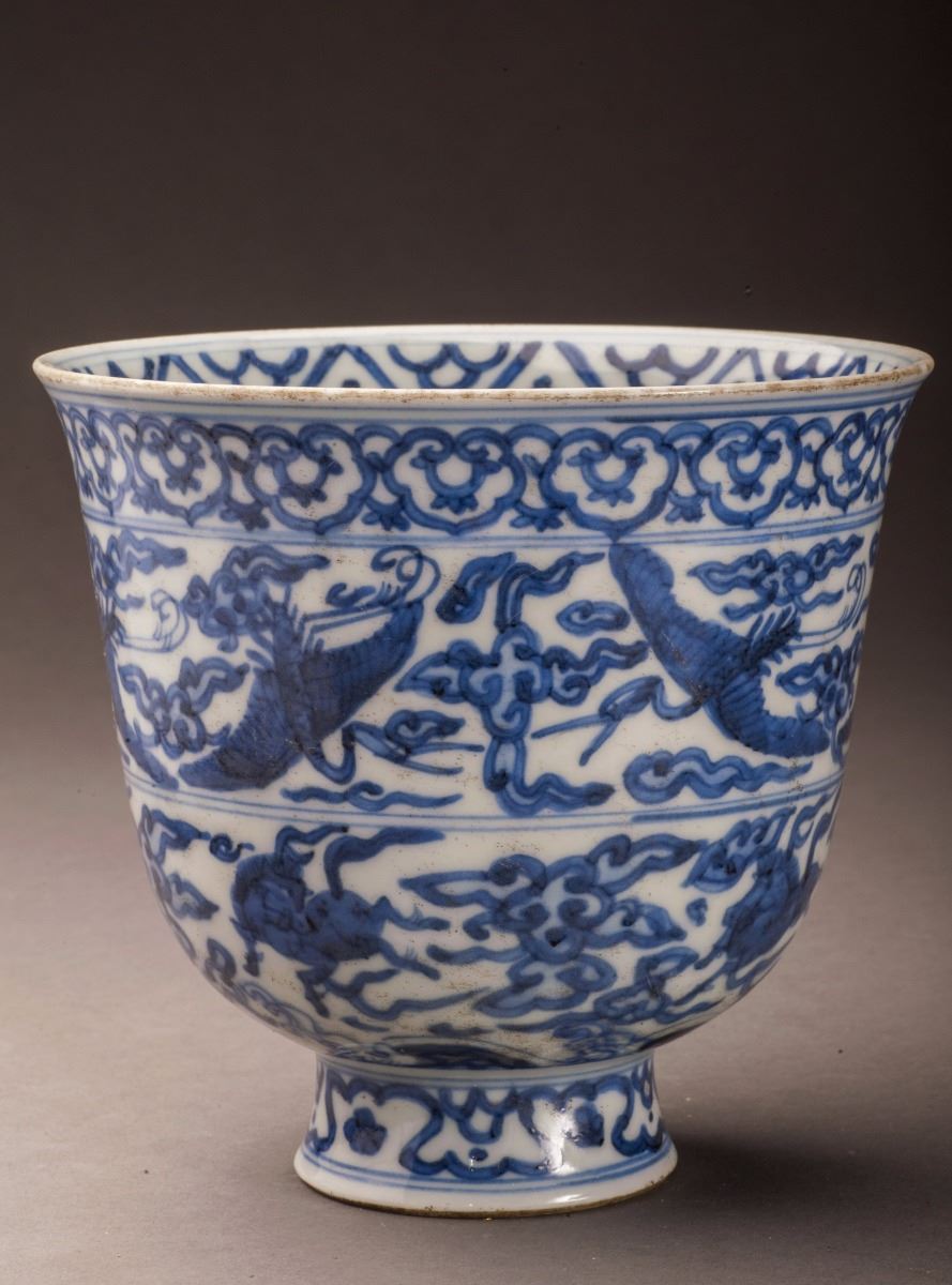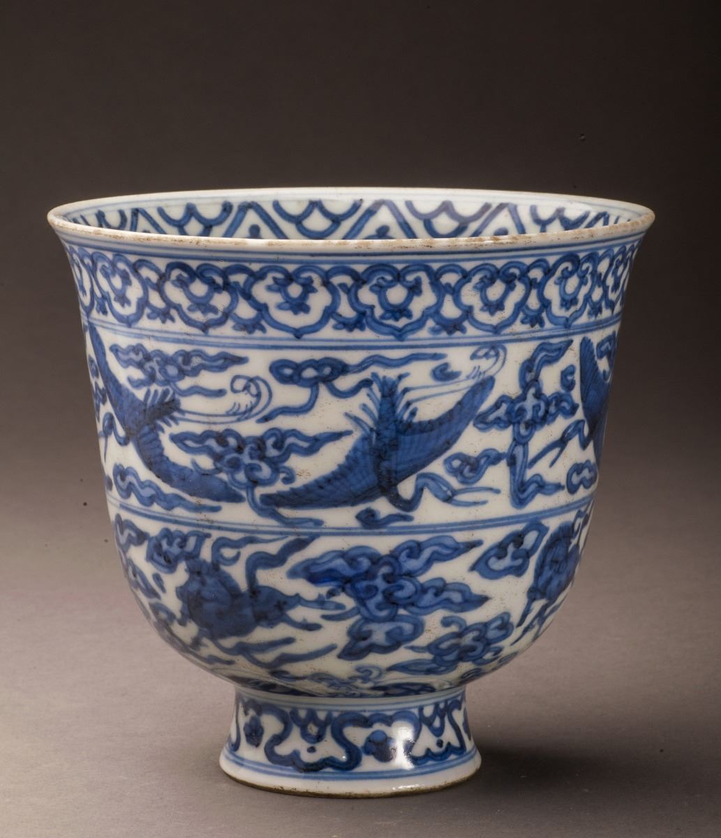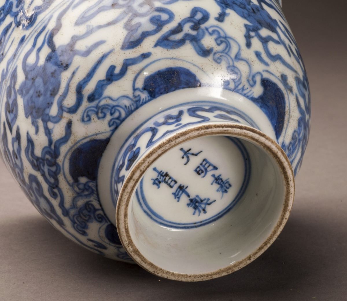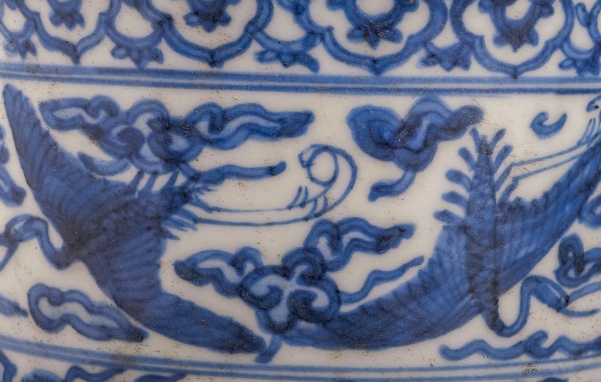 Depicting With The Vivid Blue Glazed Cranes At Cavetto, Painted In Detailed And With The Vivid Lucky Clouds Besides. With A Flaring Mouth, Decorated With The Ruyi-head Band At Neck. The Lower Section Painted With VividHorsed And Raised To The Short Foot With Everted Rim At Bottom. Marked As "jiajing(1522-1566)".