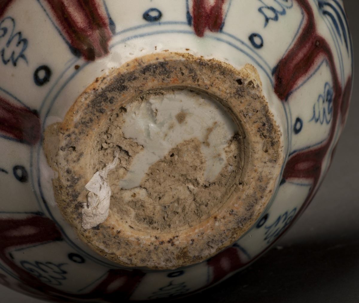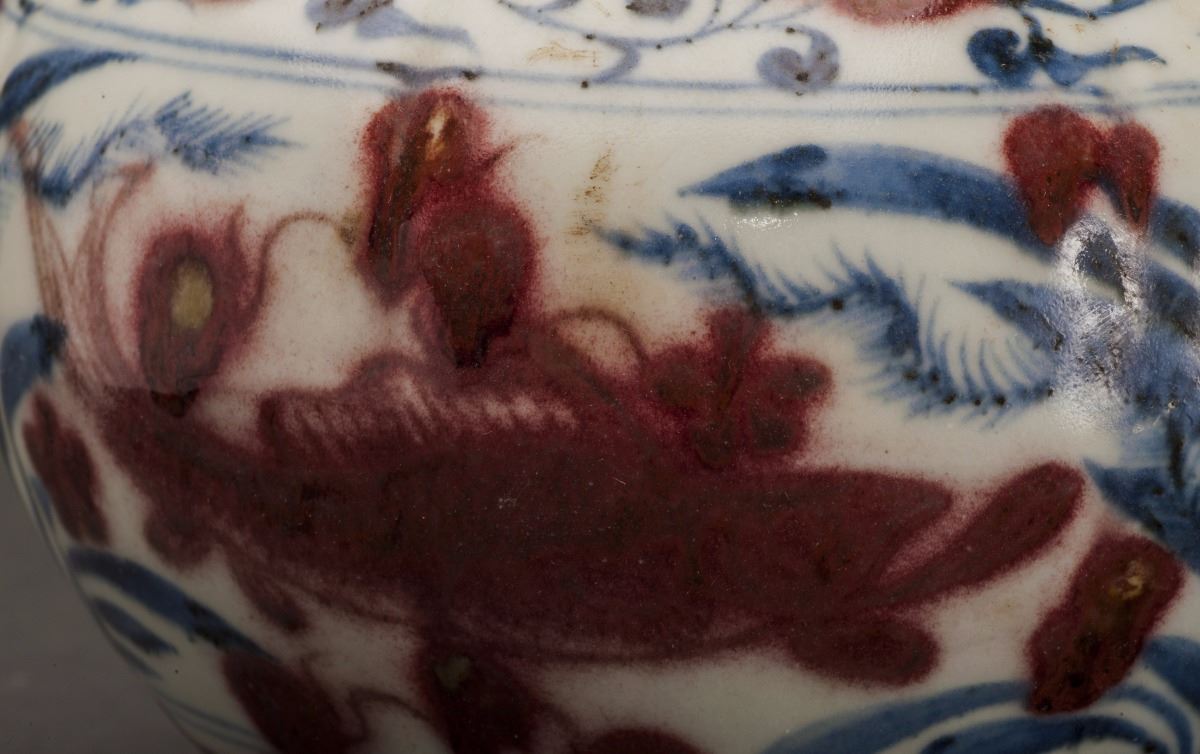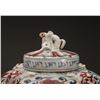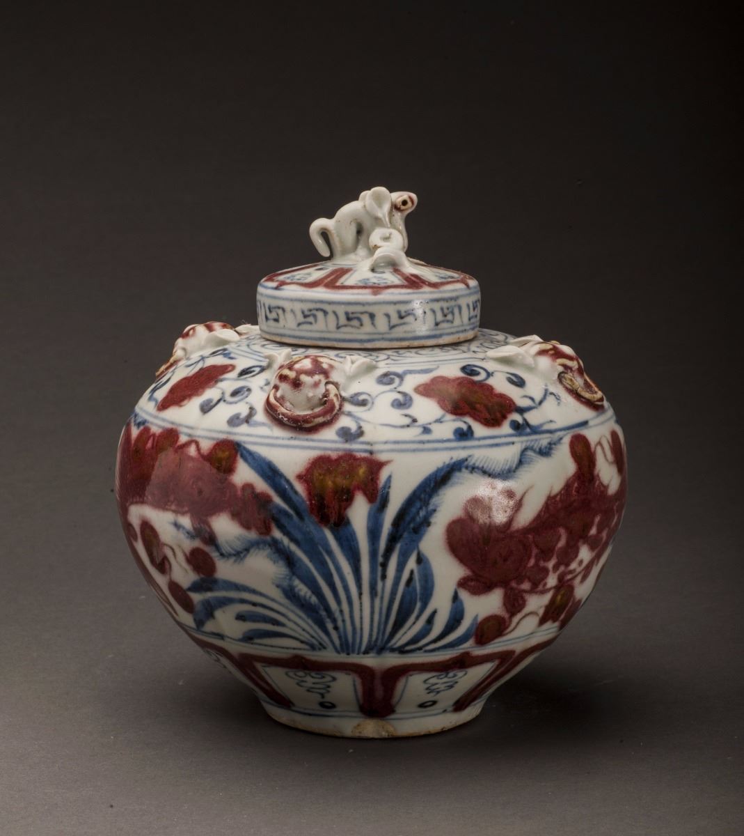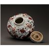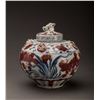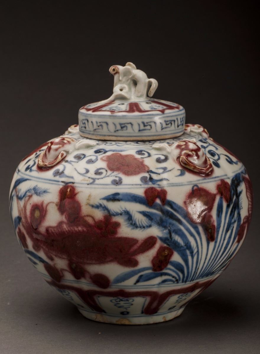 With The Vividly Red Glazed Fish Patterns At The Finely Potted Cavetto, This Fine Porcelain Pot With A Delicate Designed Cover Top. Decorated With A Nicely Carved Animal Statue On Top Of The Cover. Vividly BlueGlazed Grass Besides The Fish. With A Flower Band At The Neck.