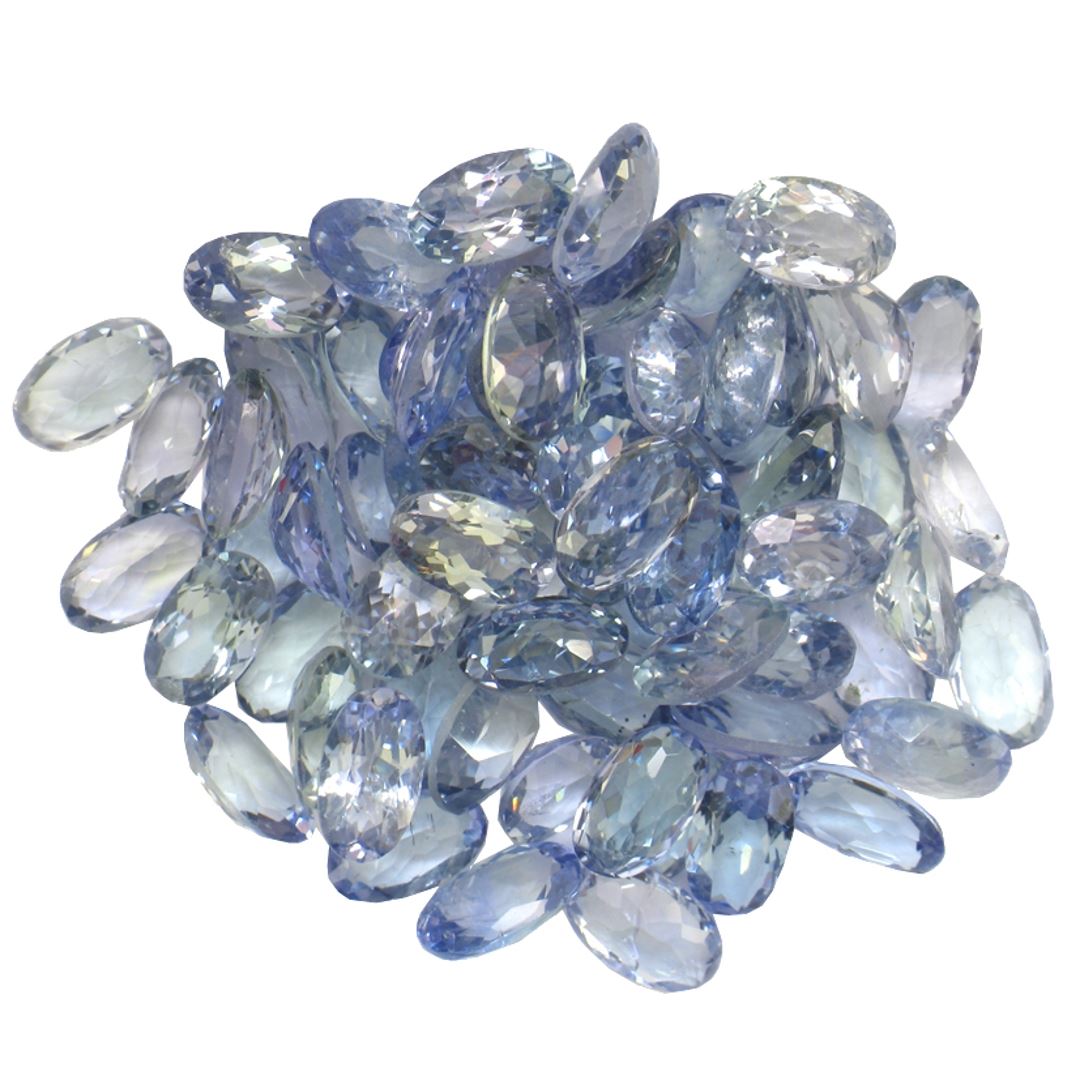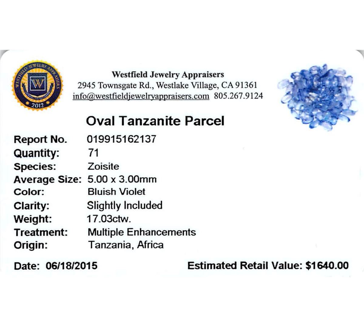 Seventy-one oval mixed cut natural tanzanites, measuring 5.00 x 3.00 x 1.95mm, exact total weight 17.03ct., clarity is slightly included, type I, medium, very slightly grayish, bluish violet color, (GIA bV 5/3), cut is good. Transmitting light with a minimum of distortion, transparent. Naturally occurring internal & external characteristics are present. Measurements & the color grade are an average for the group. Tanzanite is a very rare gemstone that is only found in the country of Tanzania. Originally discovered in 1967. Tiffany & Company, named the stone Tanzanite. It is found in the Usumburu Mountains that border the Umba Valley of northern Tanzania. Tanzanite occurs in gray, brown, violet, blue, reddish-purple, & green. The gem is interesting because of its exceptional pleochroism. Rotated in different directions a tanzanite will exhibit multiple changes of color. Tanzanite has a low tolerance to ultrasonic cleaning, and should not be cleaned using this method. Westfield Appraised at $1,640.00.