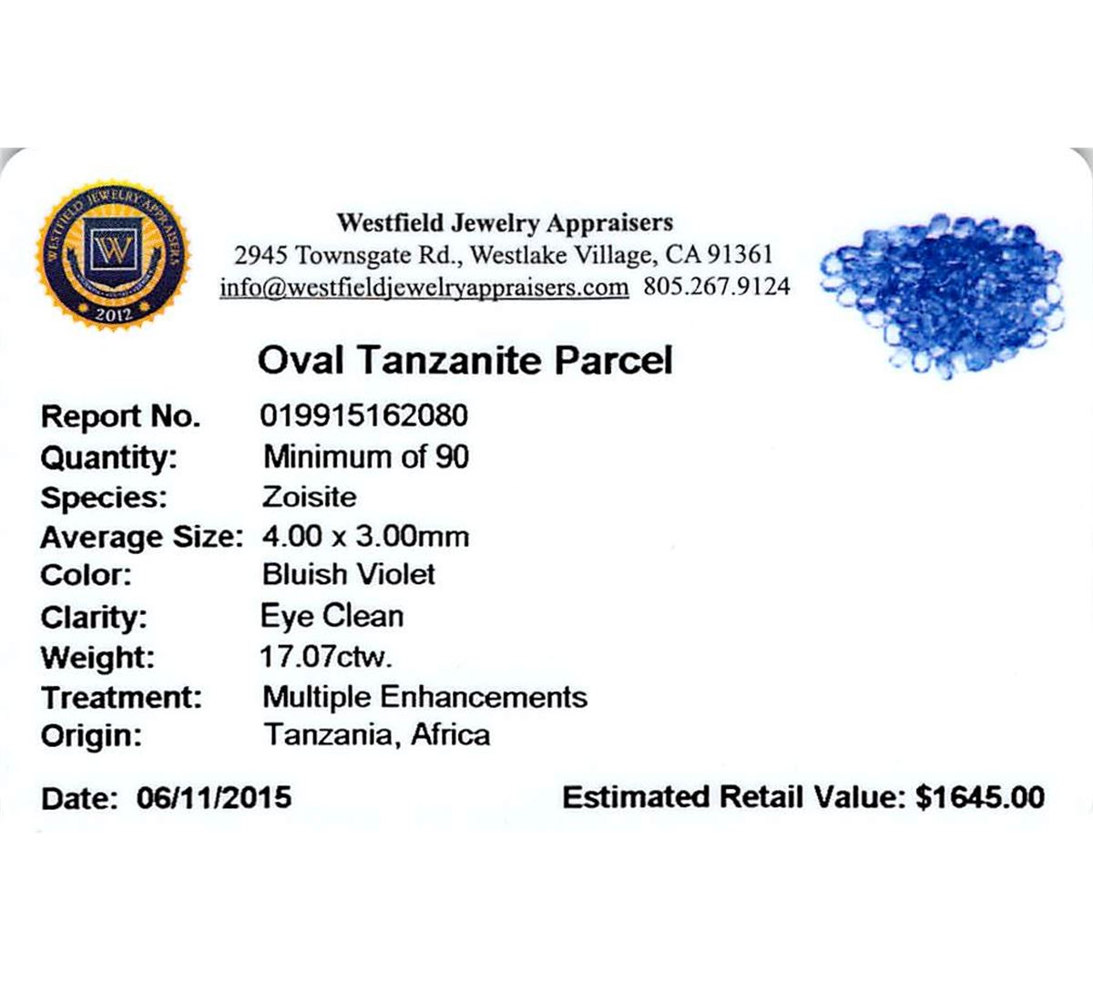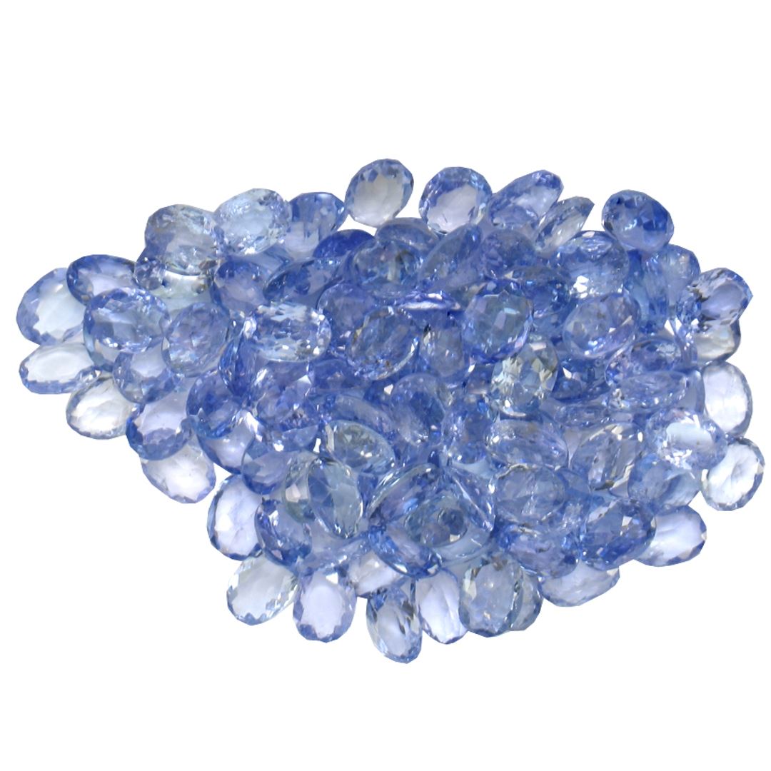 Ninety oval mixed cut natural tanzanites, measuring 4.00 x 3.00 x 1.95mm, exact total weight 17.07ct., clarity is eye clean, type I, medium dark, very slightly grayish, bluish violet color, (GIA bV 6/3), cut is good. Transmitting light with no distortion, transparent. Color grade is an average for the group. Graded in the setting. Tanzanite is a very rare gemstone that is only found in the country of Tanzania. Originally discovered in 1967. Tiffany & Company, named the stone Tanzanite. It is found in the Usumburu Mountains that border the Umba Valley of northern Tanzania. Tanzanite occurs in gray, brown, violet, blue, reddish-purple, & green. The gem is interesting because of its exceptional pleochroism. Rotated in different directions a tanzanite will exhibit multiple changes of color. Tanzanite has a low tolerance to ultrasonic cleaning, and should not be cleaned using this method. Westfield Appraised at $1,645.00.