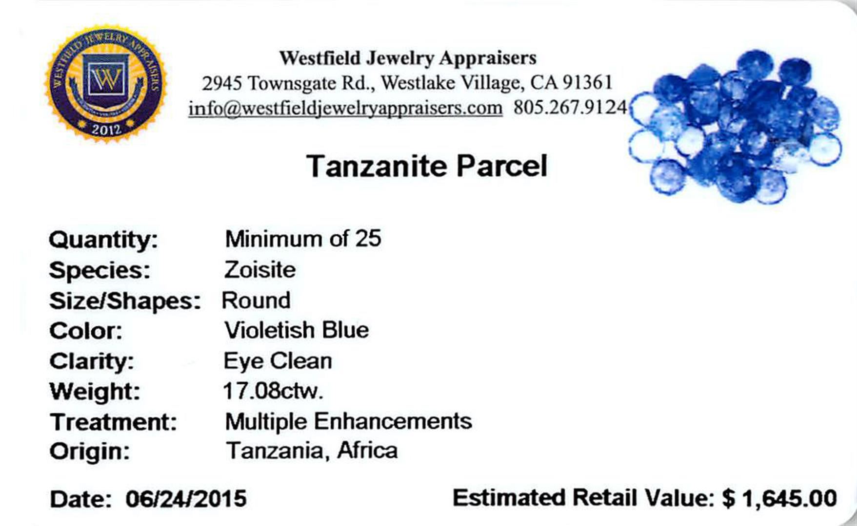 Twenty-five round mixed cut natural tanzanites, measuring 5.00 x 4.00 mm, exact total weight 17.09ct., clarity is slightly included, type I, medium dark, very slightly grayish, violetish blue color, (GIA vB 6/3), cut is good. Measurements & the color grade are an average for the group, Color grade is an average for the group, Transmitting light with no distortion, transparent, Naturally occurring internal & external characteristics are present, Indications of multiple laboratory enhancements, including high temperature heat treatment. Westfield Appraised at $1,645.00.