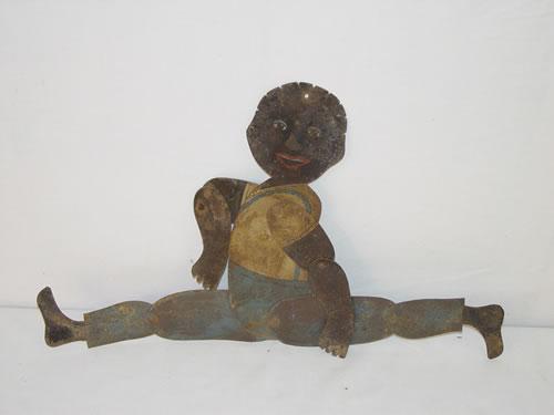 17 1/2" 19TH CENT. FRENCH CUT TIN PAINTED DANCING BLACK BOY TOY-JOINTED W/ OLD PAINT - LOSSES and WEAR TO SURFACE
