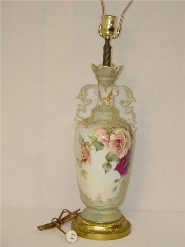 17 1/2" HAND PAINTED DOUBLE HANDLED LAMP - VASE DRILLED FOR LAMP W/ BRASS BASE, DECORATED W/ ROSES, SOME PAINT WEAR