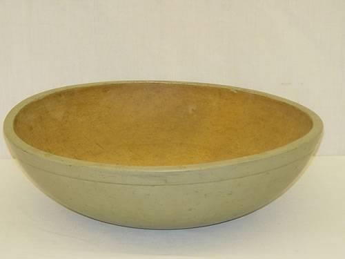17 1/2" TURNED WOODEN BOWL IN GREEN-GREY PAINT - OUT OF ROUND SHRINKAGE, WEAR TO PAINT;