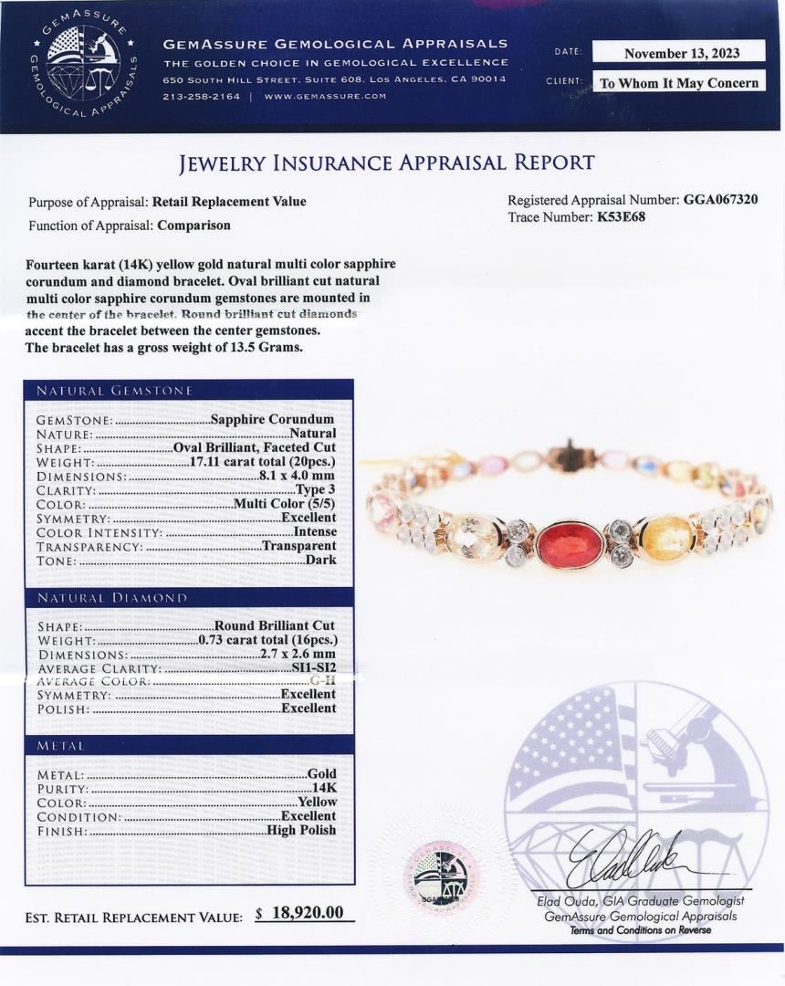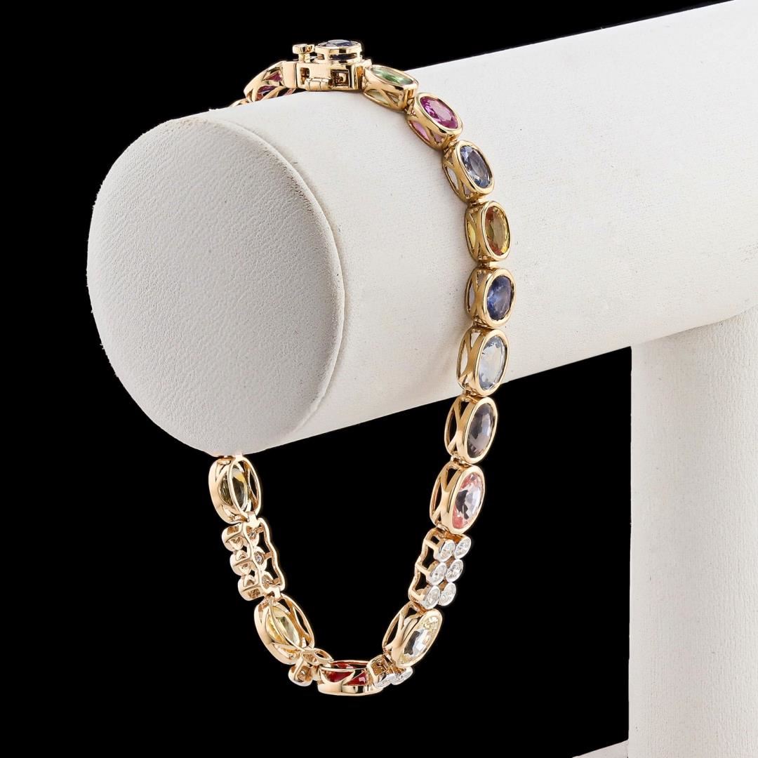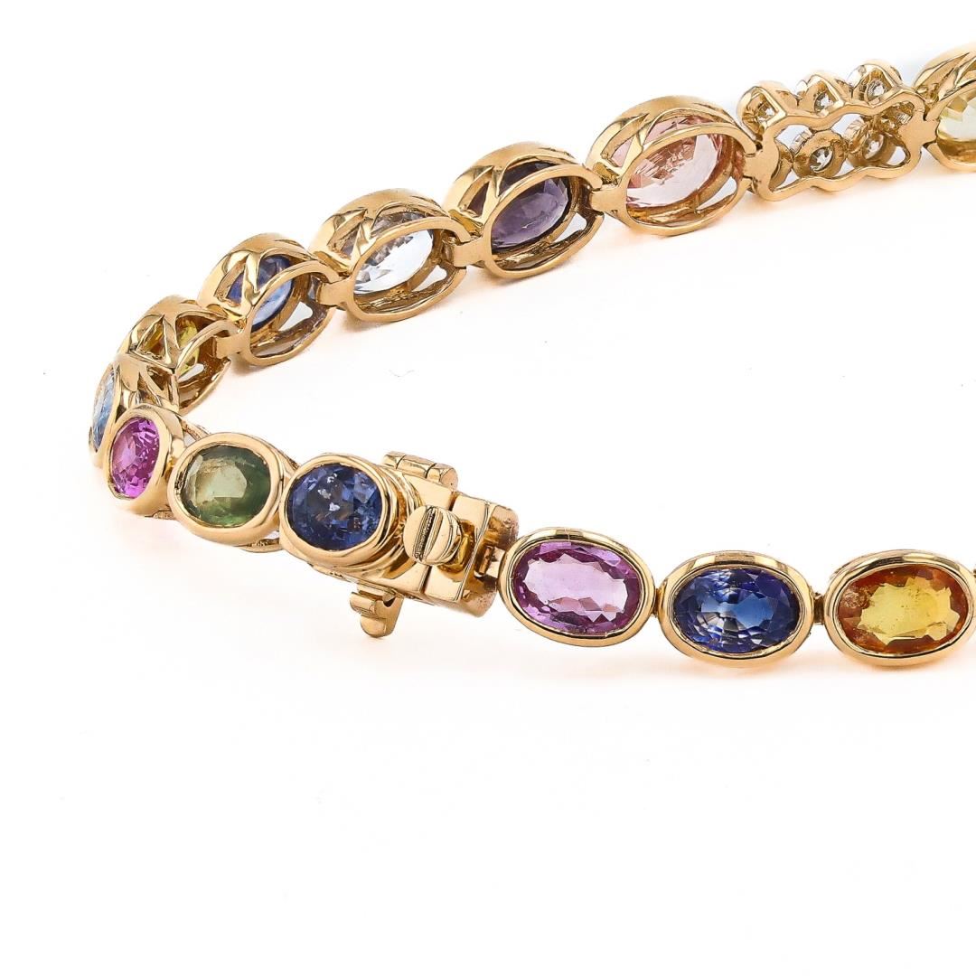 Fourteen karat (14K) yellow gold natural multi color sapphire corundum and diamond bracelet. Oval brilliant cut natural multi color sapphire corundum gemstones are mounted in the center of the bracelet. Round brilliant cut diamonds accent the bracelet between the center gemstones. The bracelet has a gross weight of 13.5 Grams. #NATURAL GEMSTONE# GEMSTONE: Sapphire Corundum NATURE: Natural SHAPE: Oval Brilliant, Faceted Cut WEIGHT: 17.11 carat total (20pcs.) DIMENSIONS: 8.1 x 4.0mm CLARITY: Type 3 COLOR: Multi Color (5/5) SYMMETRY: Excellent COLOR INTENSITY: Intense TRANSPARENCY: Transparent TONE: Dark #NATURAL DIAMOND# SHAPE: Round Brilliant Cut WEIGHT: 0.73 carat total (16pcs.) DIMENSIONS: 2.7 x 2.6mm AVERAGE CLARITY: SI1-SI2 AVERAGE COLOR: G-H SYMMETRY: Excellent POLISH: Excellent #METAL# METAL: Gold PURITY: 14K COLOR: Yellow CONDITION: Excellent FINISH: High Polish