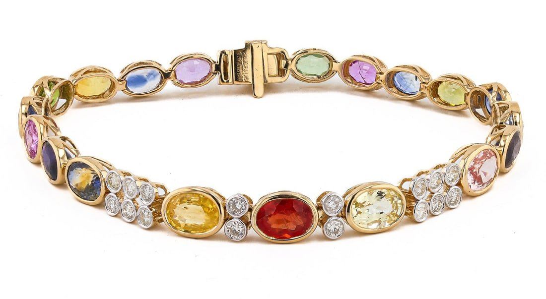 Fourteen karat (14K) yellow gold natural multi color sapphire corundum and diamond bracelet. Oval brilliant cut natural multi color sapphire corundum gemstones are mounted in the center of the bracelet. Roundbrilliant cut diamonds accent the bracelet between the center gemstones. The bracelet has a gross weight of 13.5 Grams. #NATURAL GEMSTONE# GEMSTONE: Sapphire Corundum NATURE: Natural SHAPE: Oval Brilliant, Faceted CutWEIGHT: 17.11 carat total (20pcs.) DIMENSIONS: 8.1 x 4.0mm CLARITY: Type 3 COLOR: Multi Color (5/5) SYMMETRY: Excellent COLOR INTENSITY: Intense TRANSPARENCY: Transparent TONE: Dark #NATURAL DIAMOND#SHAPE: Round Brilliant Cut WEIGHT: 0.73 carat total (16pcs.) DIMENSIONS: 2.7 x 2.6mm AVERAGE CLARITY: SI1-SI2 AVERAGE COLOR: G-H SYMMETRY: Excellent POLISH: Excellent #METAL# METAL: Gold PURITY: 14K COLOR: YellowCONDITION: Excellent FINISH: High Polish