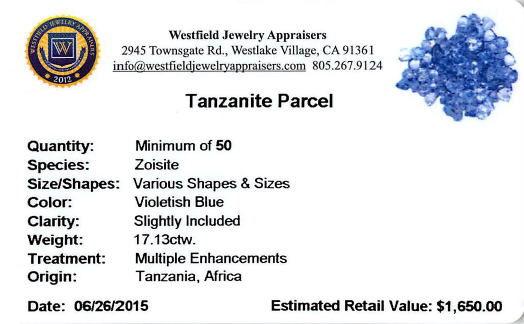 Fifty round mixed cut natural tanzanites, measuring 3.00 - 3.00 x 1.95 mm, exact total weight 17.13ct., clarity is slightly included, type I, medium, very slightly grayish, violetish blue color, (GIA vB 5/3), cut is good. Measurements & the color grade are an average for the group, Color grade is an average for the group, Transmitting light with no distortion, transparent, Naturally occurring internal & external characteristics are present, Indications of multiple laboratory enhancements, including high temperature heat treatment. Westfield Appraised at $1,650.00.