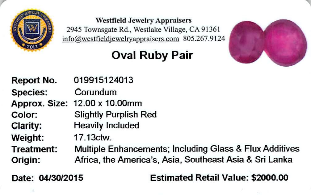 Two oval mixed cut natural rubies, measuring 12.00 x 10.00 x 6.40mm, approximate total weight of 17.13ct., clarity is heavily included, type II, dark, very slightly brownish, slightly purplish red color, (GIA slpR 7/3), cut is good. Transmitting light somewhat diffusely, translucent. Naturally occurring internal & external characteristics are present. Indications of laboratory high temperature heat treatment, with glass & flux additives. Ruby has a low tolerance to rhodium plating, repolishing the surface, & ultrasonic cleaning. Westfield Appraised at $2,000.00.