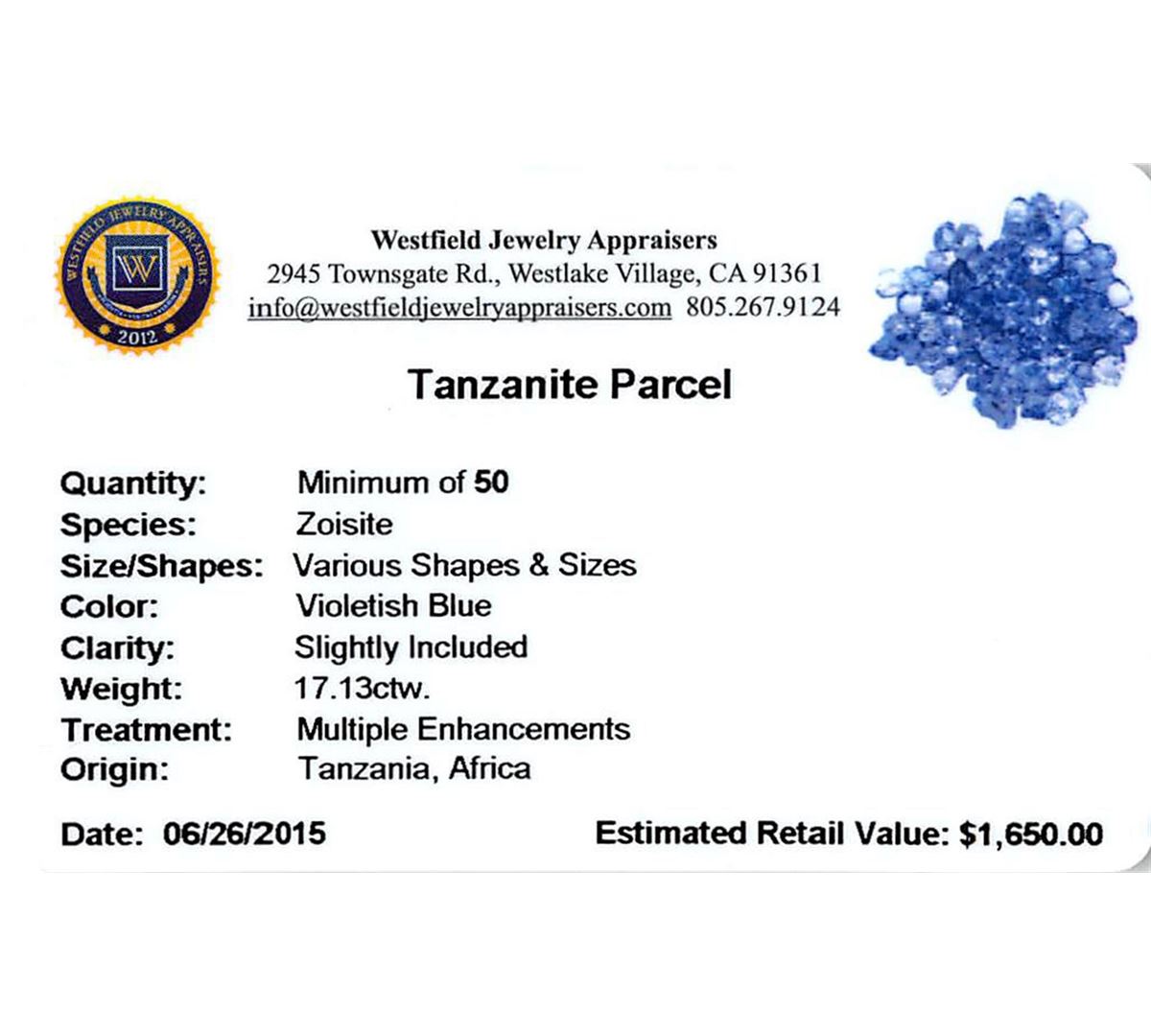 Fifty round mixed cut natural tanzanites, measuring 3.00 - 3.00 x 1.95 mm, exact total weight 17.13ct., clarity is slightly included, type I, medium, very slightly grayish, violetish blue color, (GIA vB 5/3), cut is good. Measurements & the color grade are an average for the group, Color grade is an average for the group, Transmitting light with no distortion, transparent, Naturally occurring internal & external characteristics are present, Indications of multiple laboratory enhancements, including high temperature heat treatment. Westfield Appraised at $1,650.00.