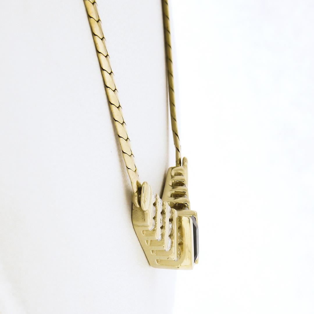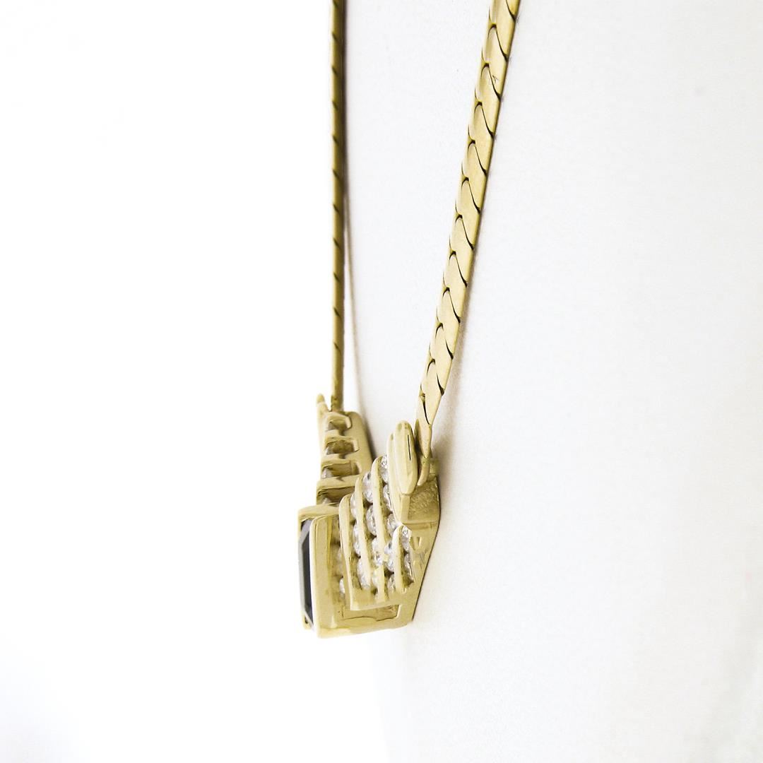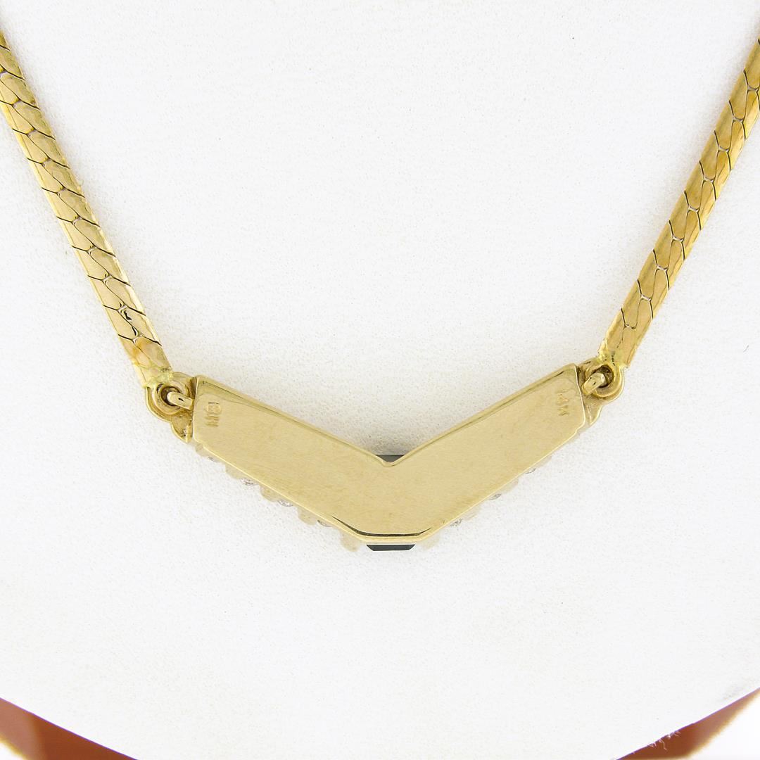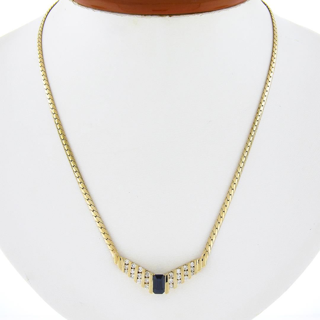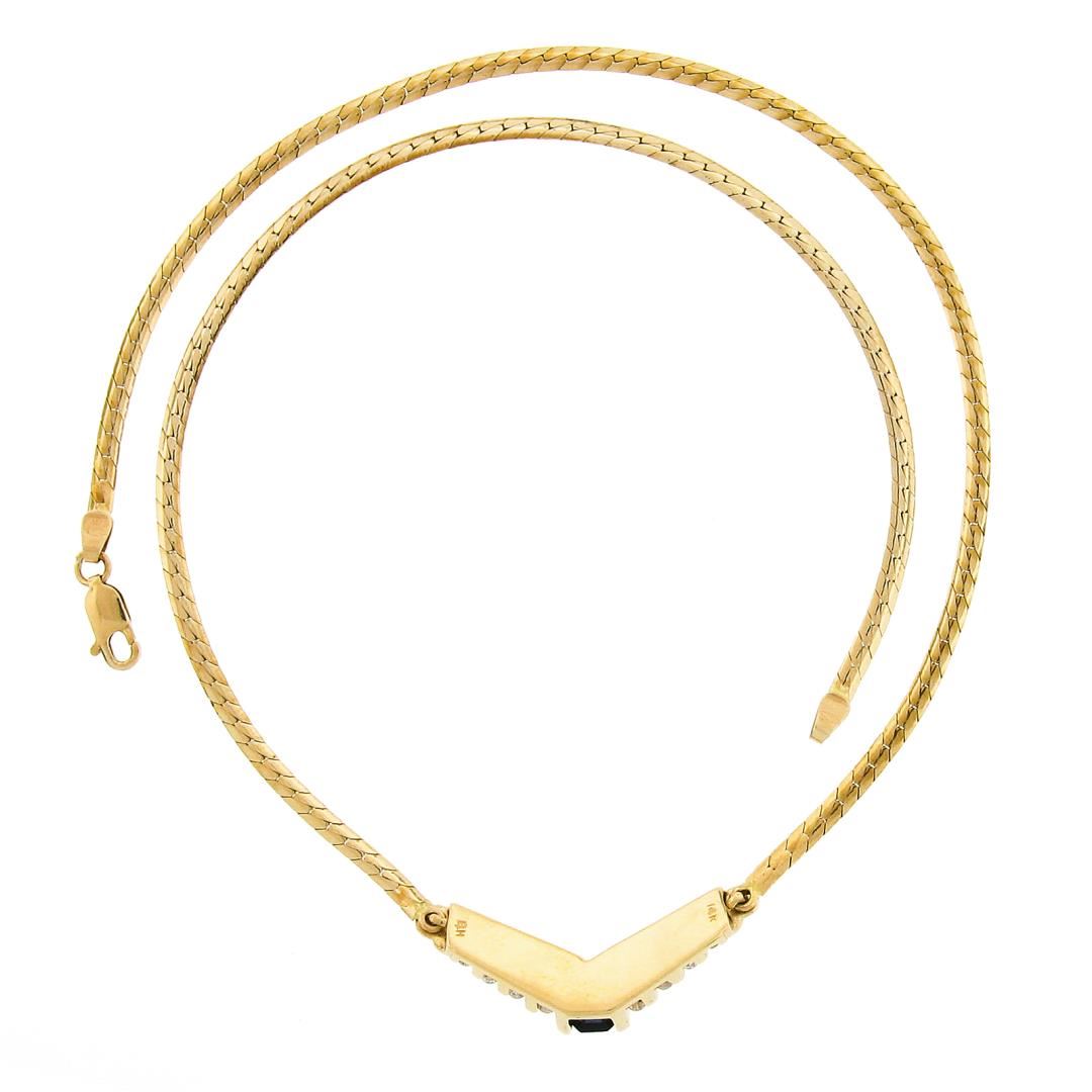 A solid 14k yellow gold chevron necklace, with 1 emerald cut natural sapphire (7x4.5mm / 1.05ct ), and 24 round brilliant cut natural diamonds (G/H - SI2/I1 ; 0.60ctw). 17 inch fancy flat link chain, 14.24 grams total weight, center piece measures 14x34.6mm.
