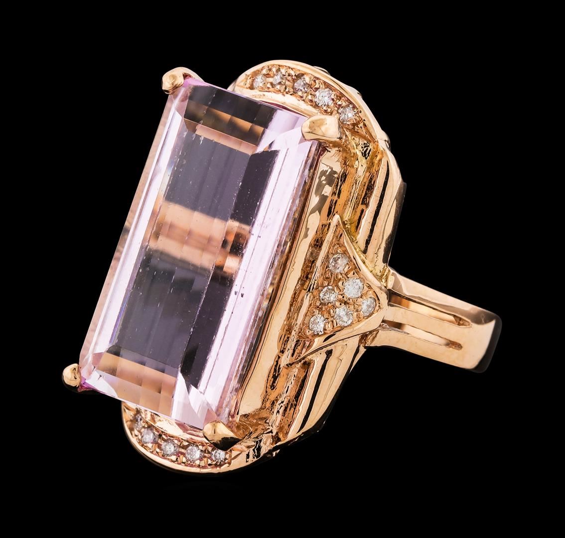 One Kunzite and Diamond Ring featuring: 14KT Rose Gold with a total weight of 7.63 grams, One Kunzite stone with a total weight of 17.17ct, and 22 Diamonds with a total weight of 0.20ctw.