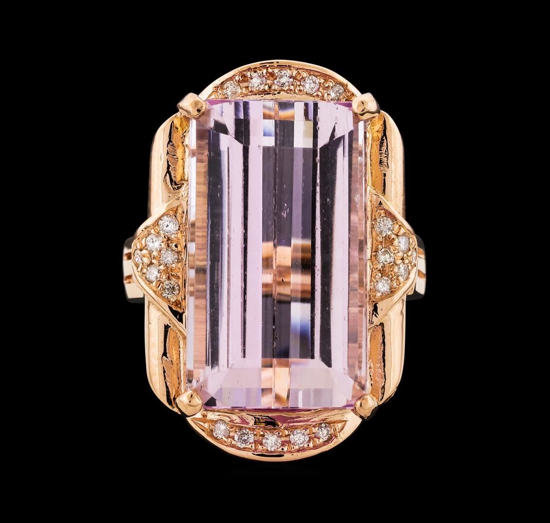 One Kunzite and Diamond Ring featuring: 14KT Rose Gold with a total weight of 7.63 grams, One Kunzite stone with a total weight of 17.17ct, and 22 Diamonds with a total weight of 0.20ctw.