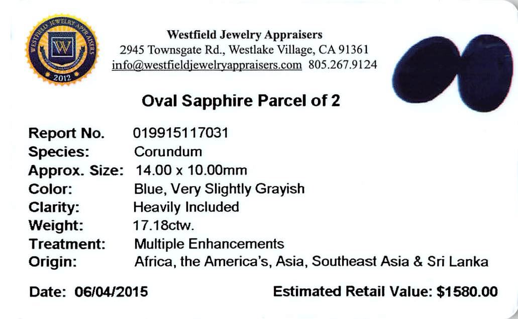 Two oval mixed cut natural blue sapphires, measuring 14.00 x 10.00 x 6.50mm, exact total weight 17.18ct., clarity is heavily included, type II, very dark, very slightly grayish, blue color, (GIA B 8/3), cut is good. Measurements are an average for the group. Transmitting light very diffusely, opaque, Naturally occurring internal & external characteristics are present, Indications of multiple laboratory enhancements, including high temperature heat treatment. Westfield Appraised at $1,580.00.