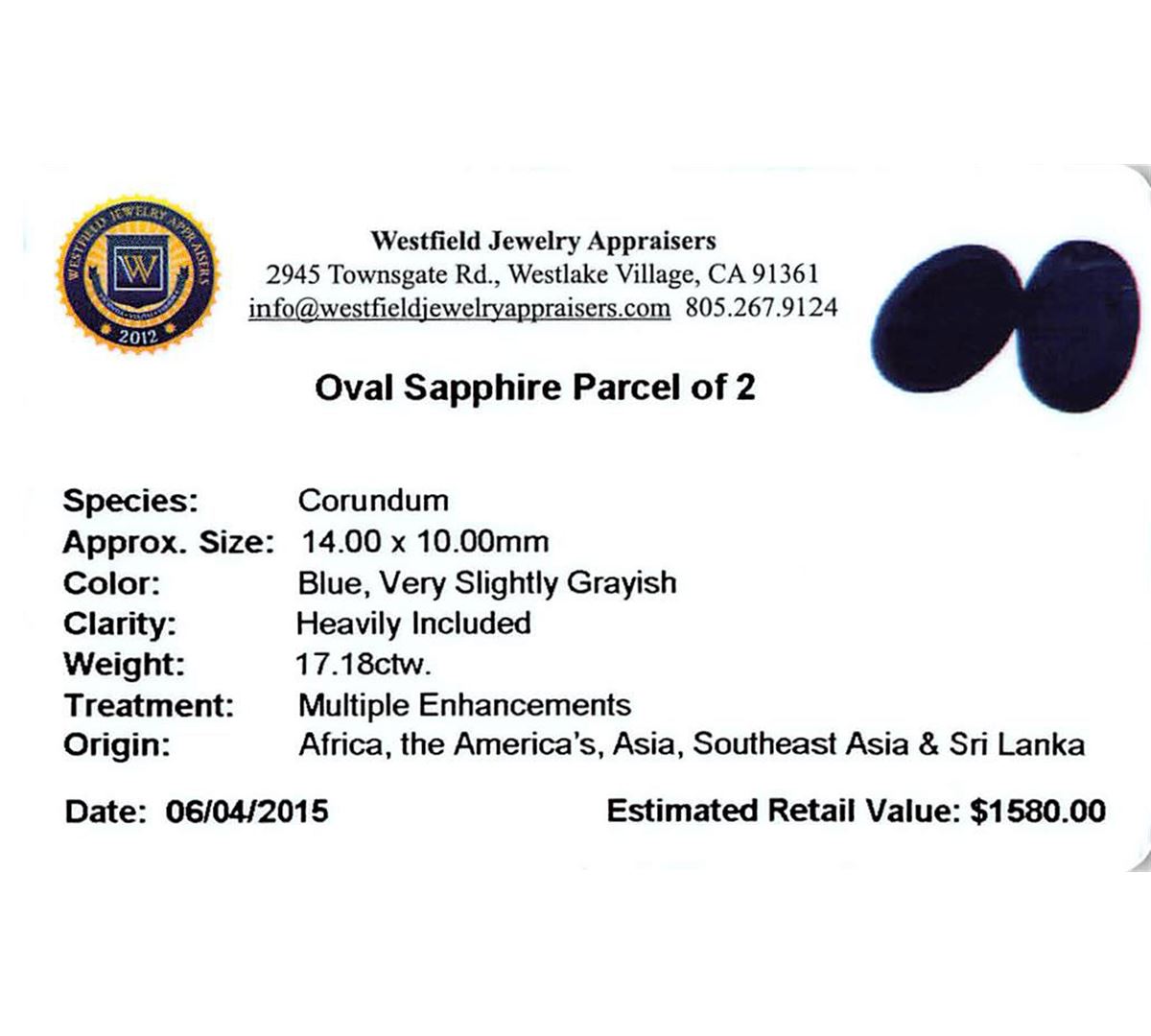 Two oval mixed cut natural blue sapphires, measuring 14.00 x 10.00 x 6.50mm, exact total weight 17.18ct., clarity is heavily included, type II, very dark, very slightly grayish, blue color, (GIA B 8/3), cut is good. Measurements are an average for the group. Transmitting light very diffusely, opaque, Naturally occurring internal & external characteristics are present, Indications of multiple laboratory enhancements, including high temperature heat treatment. Westfield Appraised at $1,580.00.