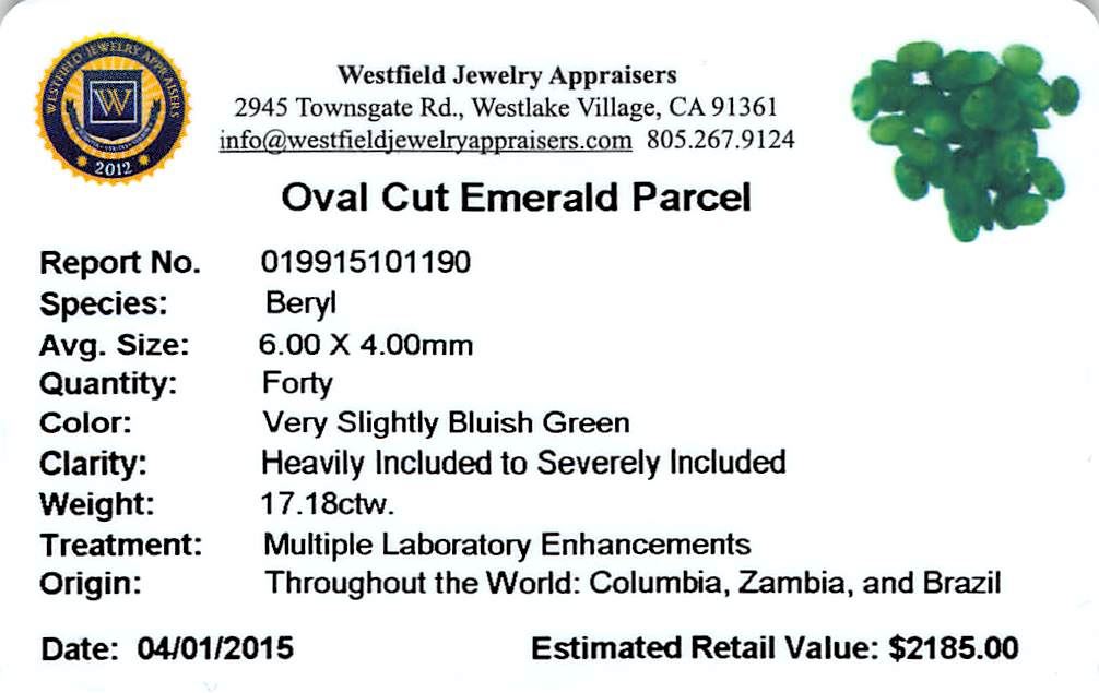 Forty oval mixed cut natural emeralds exact total weight 17.18ct., clarity is heavily included, type III, medium dark, very slightly grayish, very slightly bluish green color, (GIA vslbG 6/3), cut is good. Westfield Appraised at $2,185.00.
