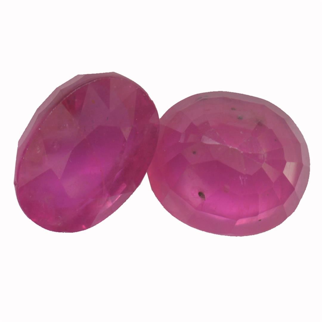 Two oval mixed cut natural rubies, measuring 13.00 x 10.00 x 7.00mm, exact total weight 17.18ct., clarity is heavily included, type II, medium dark, slightly brownish, slightly purplish red color, (GIA slpR 6/2), cut is good. Transmitting light somewhat diffusely, translucent. Naturally occurring internal & external characteristics are present. Indications of laboratory high temperature heat treatment, with glass & flux additives. Ruby has a low tolerance to rhodium plating, repolishing the surface, & ultrasonic cleaning. Westfield Appraised at $2,000.00.