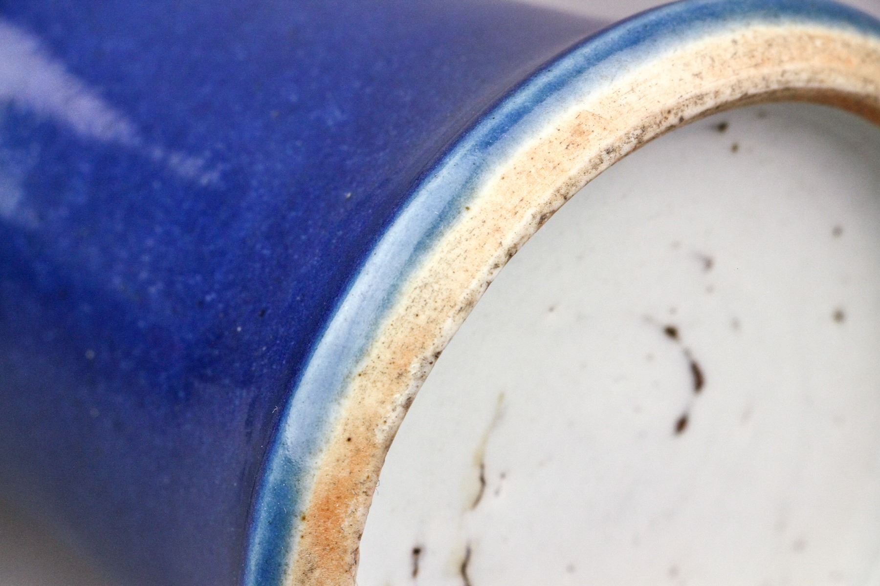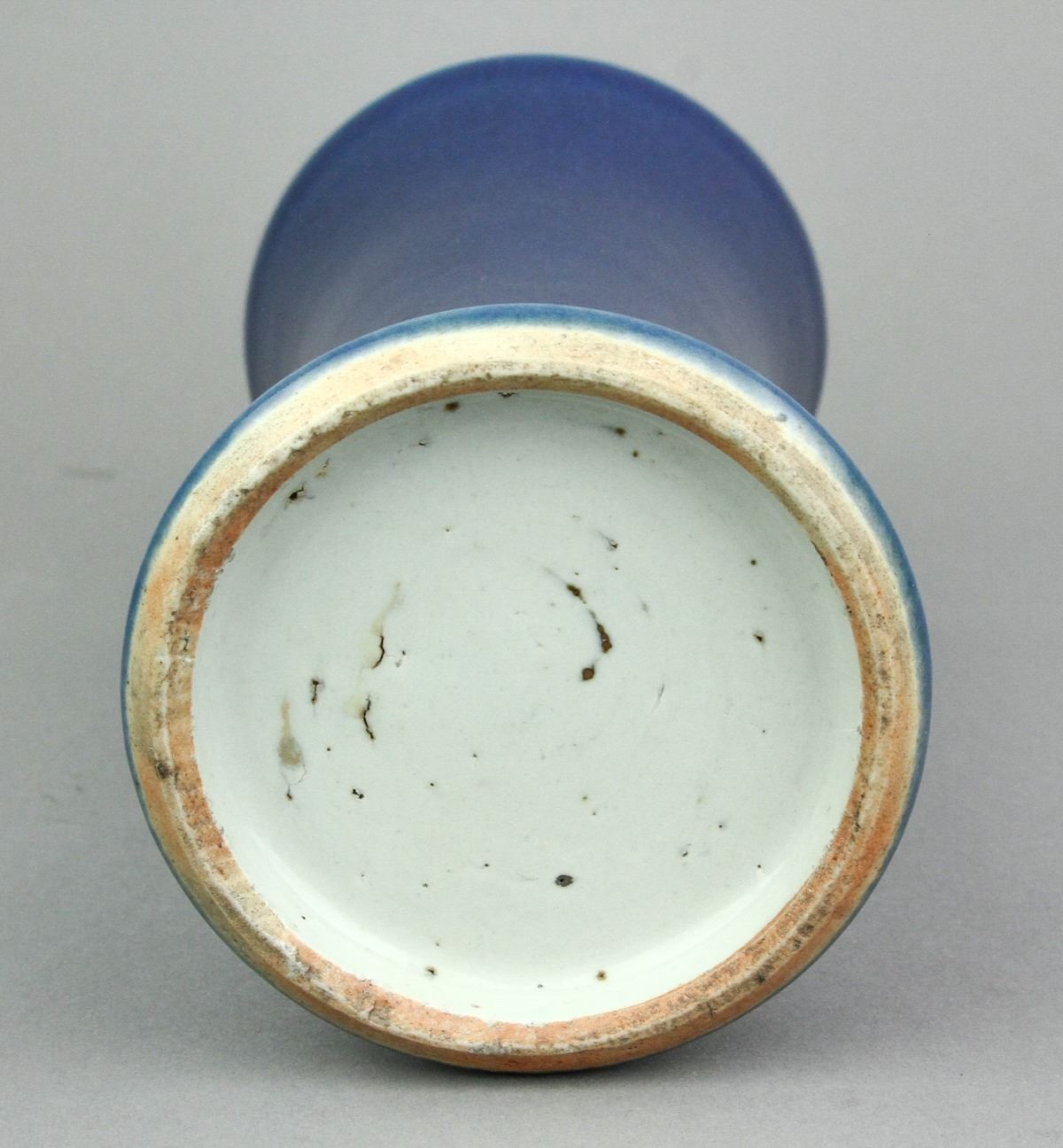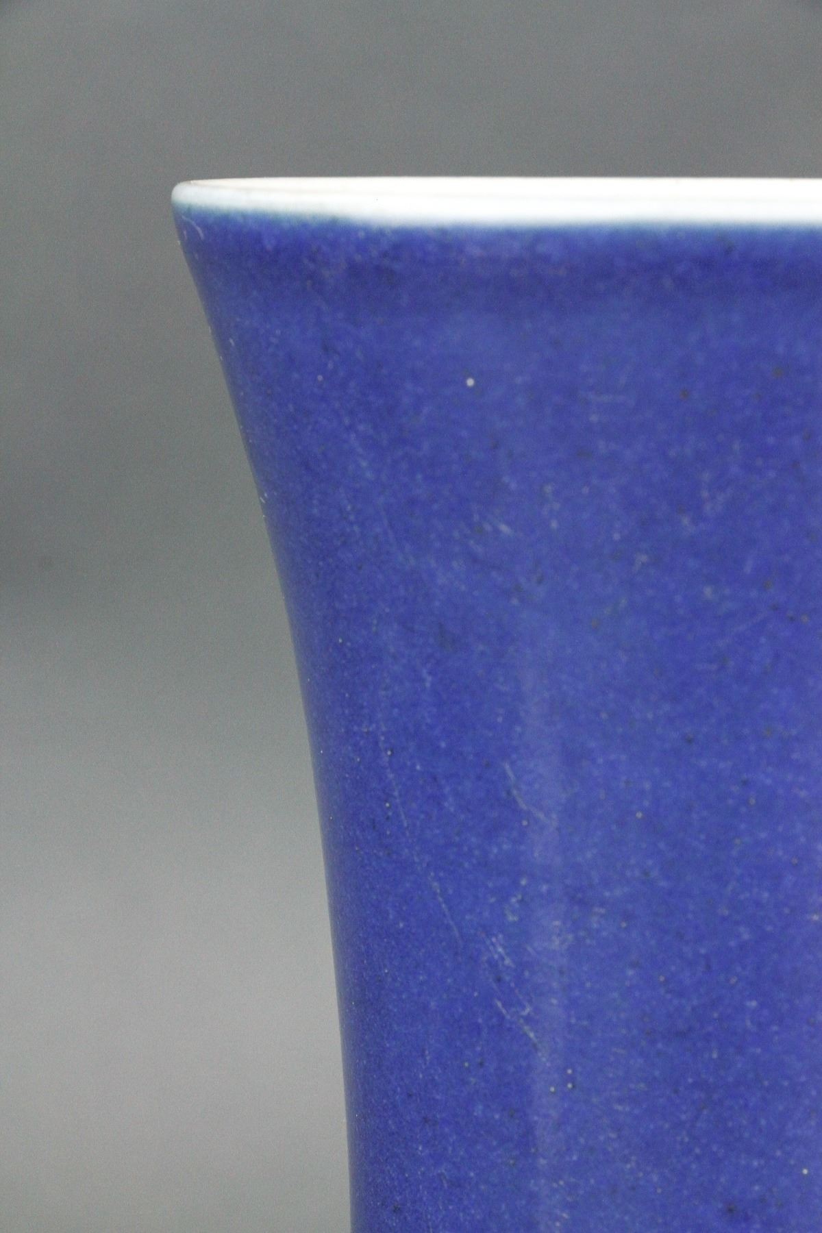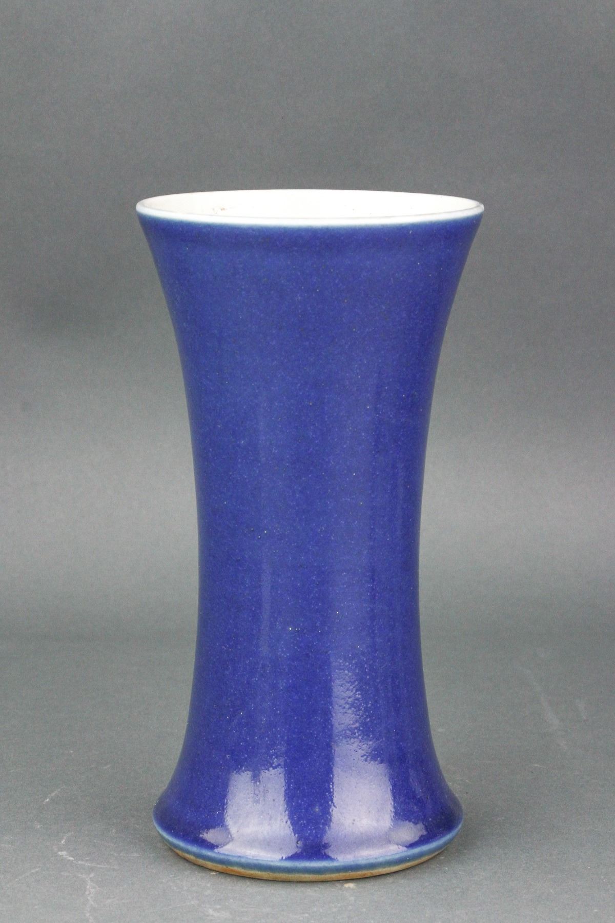 Chinese blue-glazed porcelain vase; 17th to 18th century; of cylindrical form with splayed mouth and foot; H: 20.5 cm, W: 10.5 cm, 738 grams