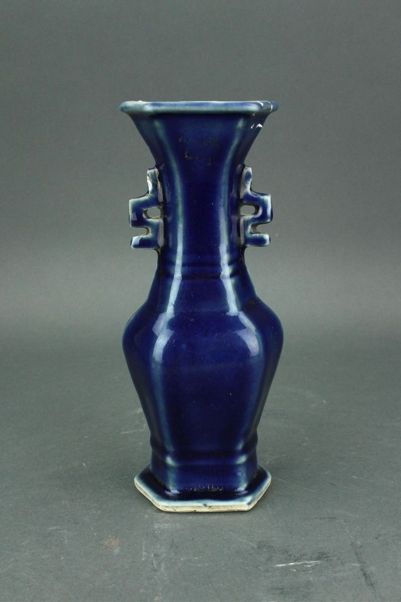 Chinese blue ground porcelain vase; of hexagon baluster form; with double geometrical handles on neck; one-character mark on base; H: 22 cm, W: 10 cm, 458 grams
