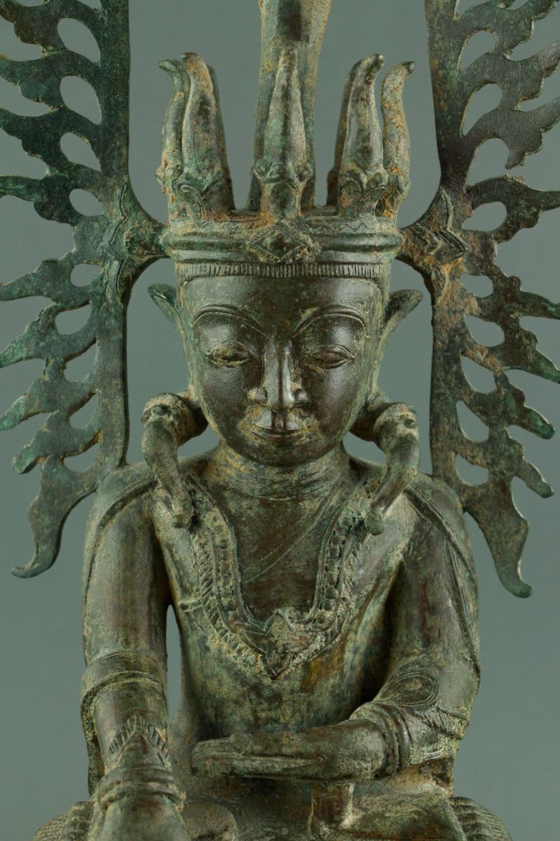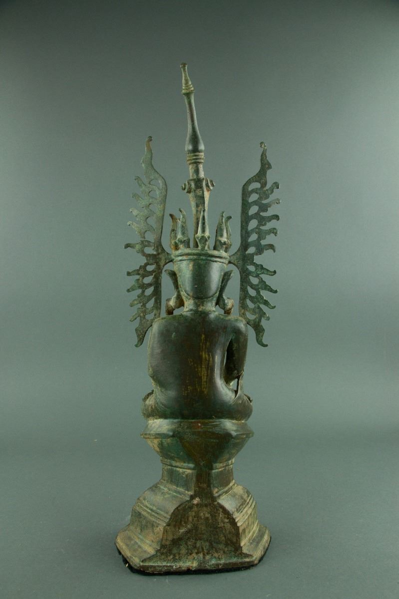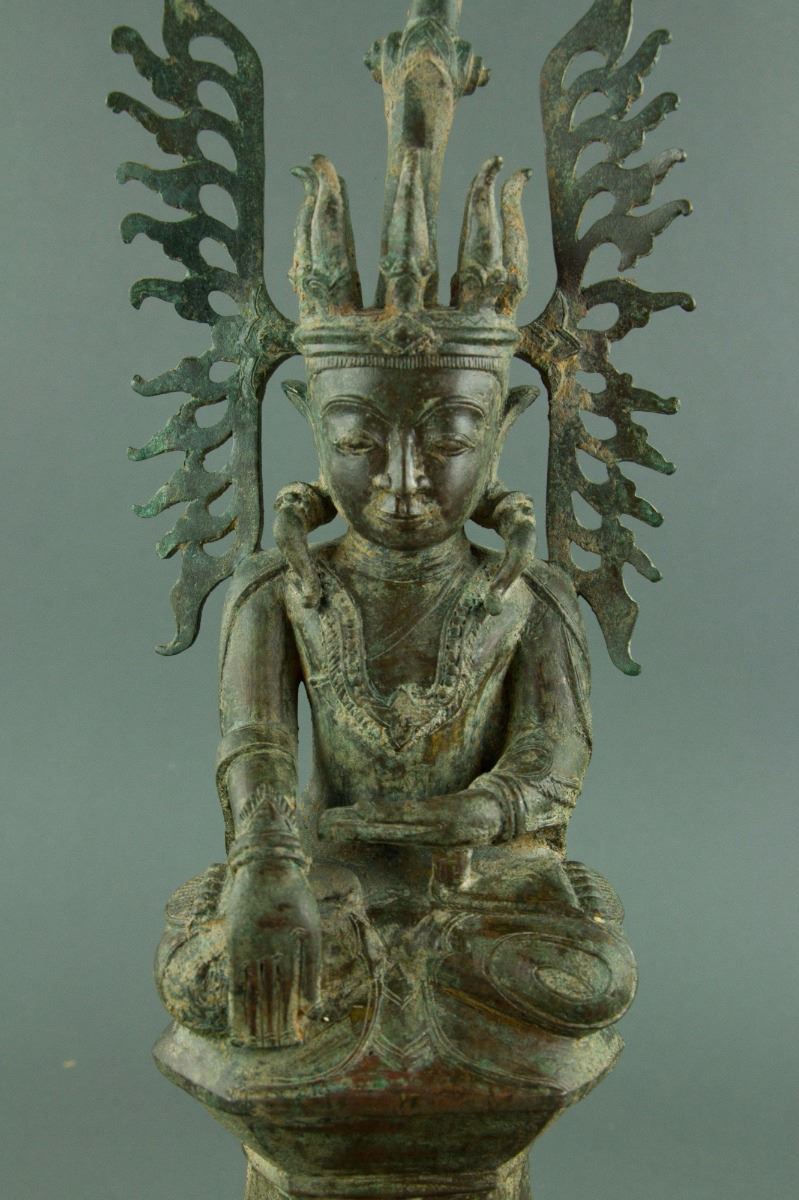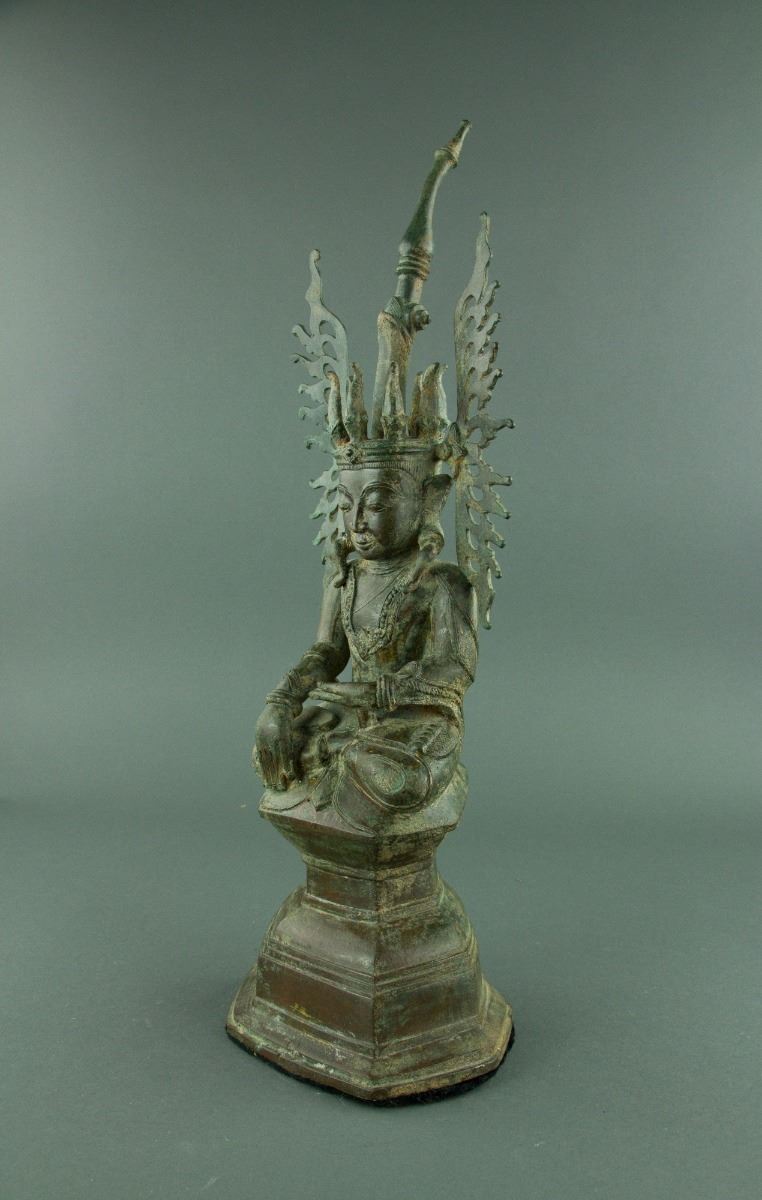 Burmese gilt bronze Buddha figure; 17th to 18th century; the Jambupati Buddha cross-leg seated on a tiered pedestal; his hands are in the bhumisparsa mudra; a high ketumala finial rises above the crown with two elaborate long-toothed flanges; H: 55 cm, D: 15 cm, 5.5 kilograms