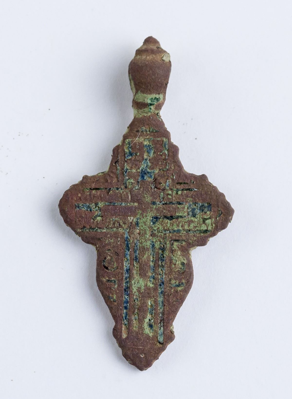 17-18th century Russian Orthodox bronze pendant. Featuring cross form with bail ring. 41 x 21 mm, 5.2 grams. Provenance: Private American collection, Virginia, USA